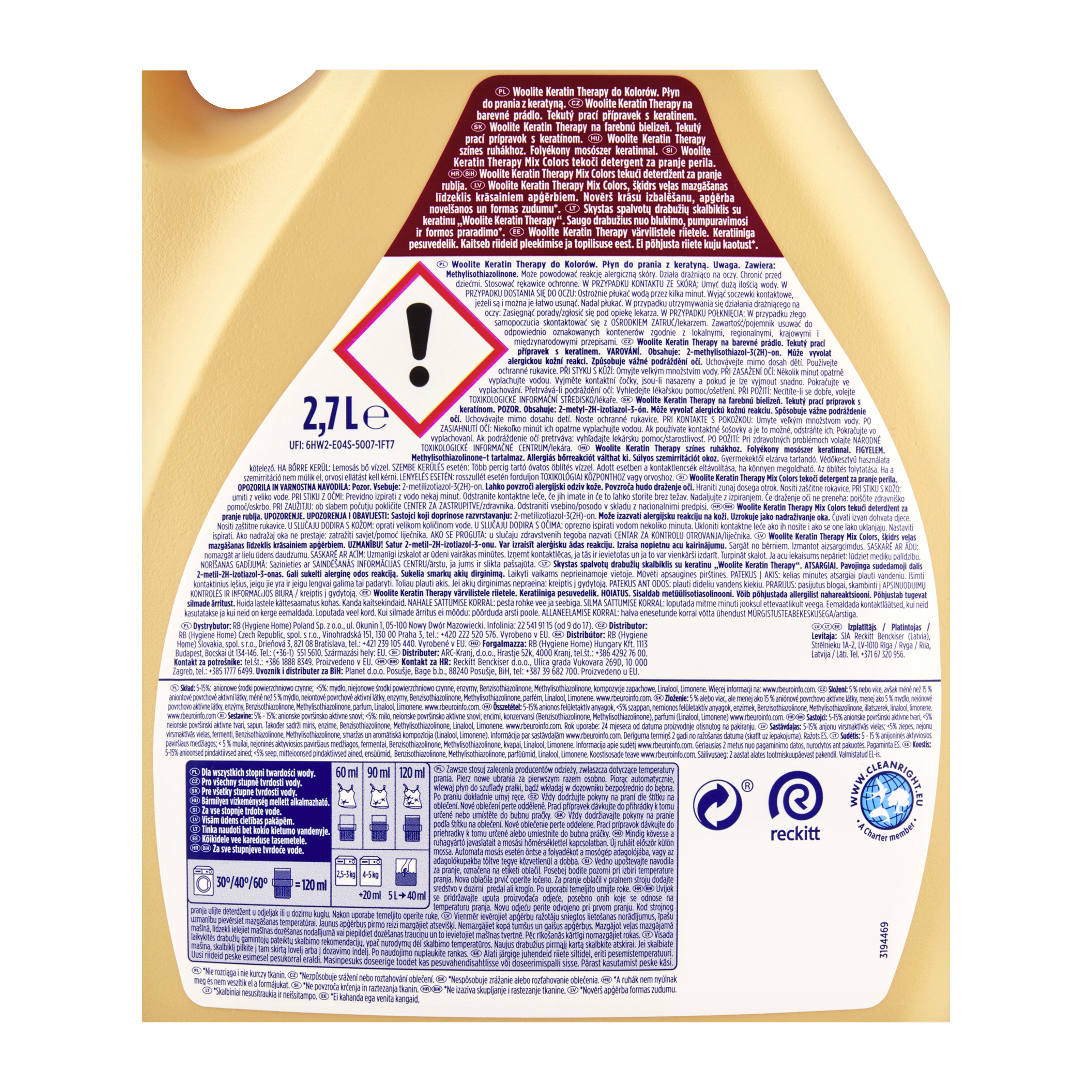 Woolite Keratin Therapy na barevné prádlo. Tekutý prací přípravek. VAROVÁNÍ. Může vyvolat alergickou kožní reakci. Způsobuje vážné podráždění očí. Obsahuje: 2-methylisothiazol-3(2H)-on a 1,2-benzoisothiazol-3(2H)-on+. Uchovávejte mimo dosah dětí. Používejte ochranné rukavice. PŘI STYKU S KŮŽÍ: Omyjte velkým množstvím vody. PŘI ZASAŽENÍ OČÍ: Několik minut opatrně vyplachujte vodou. Vyjměte kontaktní čočky, jsou-li nasazeny a pokud je lze vyjmout snadno. Pokračujte ve vyplachování. Přetrvává-li podráždění očí: Vyhledejte lékařskou pomoc/ošetření. PŘI POŽITÍ: Necítíte-li se dobře, volejte TOXIKOLOGICKÉ INFORMAČNÍ STŘEDISKO/lékaře.