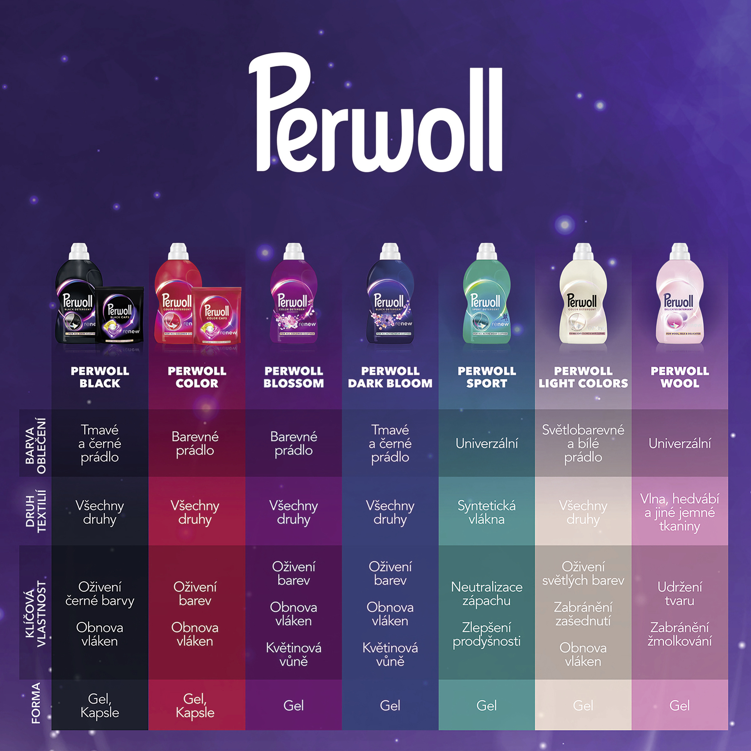 Objevte novinku, tekutý prací prostředek Perwoll Light Colors s inovativní technologií proti zašednutí oblečení a technologií Triple Renew, které poskytují ideální péči o všechno světlé, béžové, pastelové a bílé oblečení! Tento prací prostředek prádlo nejen šetrně čistí, ale také poskytuje tu nejlepší péči o barvy a vlákna: odstraňuje žmolky, výsledkem čehož je hladký povrch oblečení – takže vaše světlobarevné a bílé oblečení bude vypadat jako nové! To vše v kombinaci s prémiovou vůní, která zabezpečuje dlouhotrvající svěžest oblečení. Prací gel je účinný jak ve studené, tak teplé vodě a je vhodný i pro ruční mytí. Tekutý prací prostředek na oblečení Perwoll je vhodný pro praní různých druhů tkanin.
