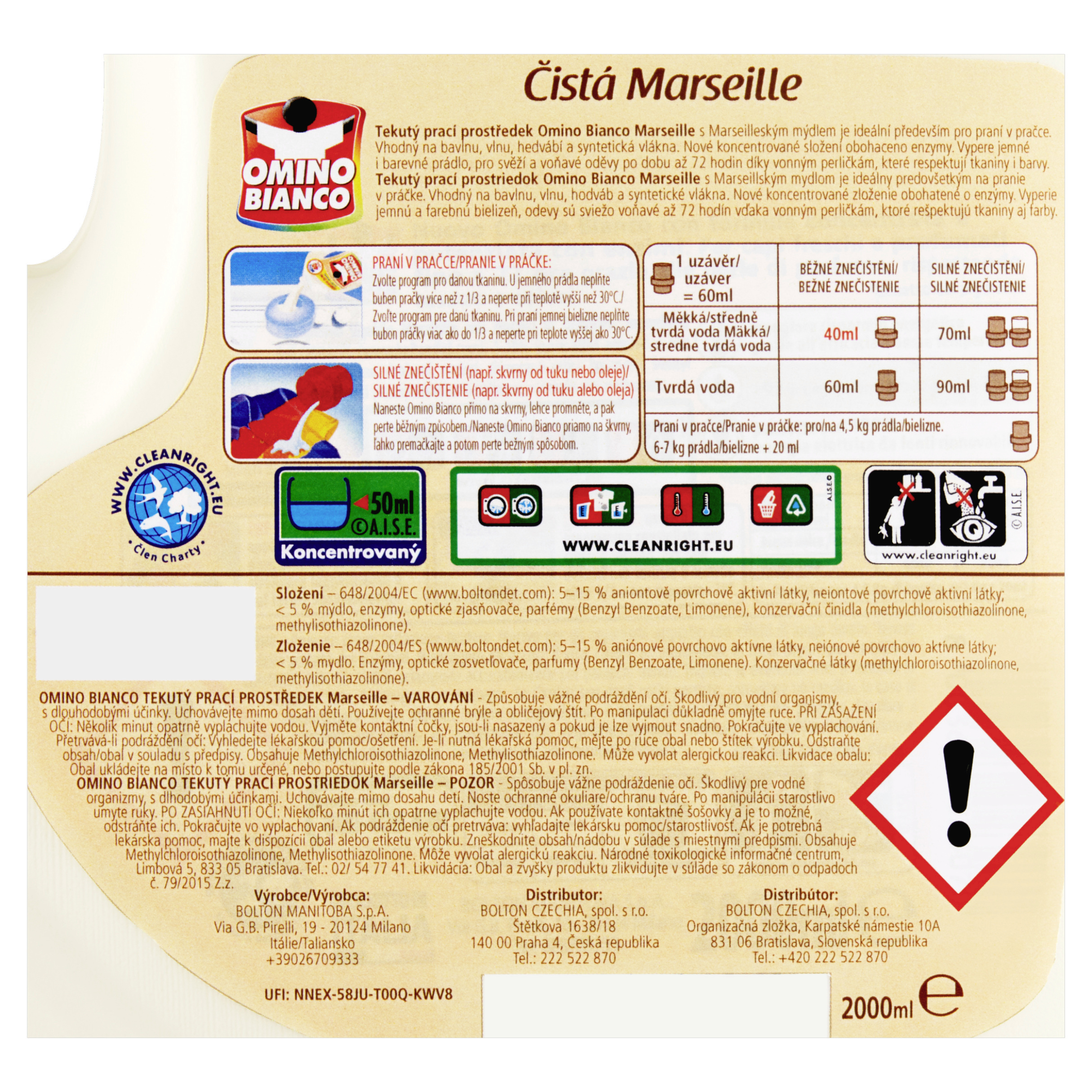 Čistá Marseille Tekutý prací prostředek Omino Bianco Marseille s Marseilleským mýdlem je ideální především pro praní v pračce. Vhodný na bavlnu, vlnu, hedvábí a syntetická vlákna. Nové koncentrované složení obohaceno enzymy. Vypere jemné i barevné prádlo, pro svěží a voňavé oděvy po dobu až 72 hodin díky vonným perličkám, které respektují tkaniny i barvy.