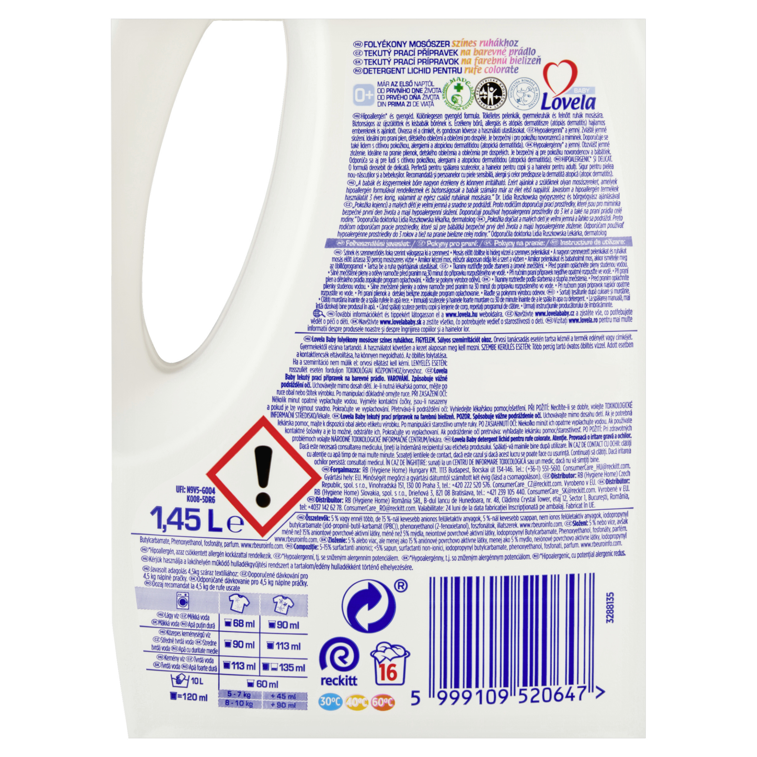 Lovela Baby tekutý prací přípravek na barevné prádlo. VAROVÁNÍ. Způsobuje vážné podráždění očí. Uchovávejte mimo dosah dětí. Je-li nutná lékařská pomoc, mějte po ruce obal nebo štítek výrobku. Po manipulaci důkladně omyjte ruce. PŘI ZASAŽENÍ OČÍ: Několik minut opatrně vyplachujte vodou. Vyjměte kontaktní čočky, jsou-li nasazeny a pokud je lze vyjmout snadno. Pokračujte ve vyplachování. Přetrvává-li podráždění očí: Vyhledejte lékařskou pomoc/ošetření. PŘI POŽITÍ: Necítíte-li se dobře, volejte TOXIKOLOGICKÉ INFORMAČNÍ STŘEDISKO/lékaře.