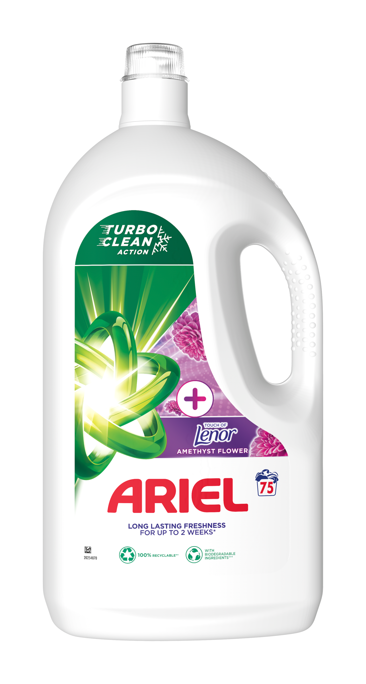 Ariel, značka doporučována výrobci Whirlpool, Electrolux, Candy a Beko, představuje tekutý prací prostředek Ariel +Touch of Lenor Amethyst Flower. Dodává dlouhotrvající svěžest po dobu až 2 týdnů (při uložení ve skříni). Tekutý prací prostředek Ariel +Touch of Lenor Fresh Air poskytuje nepřekonatelné výsledky i při nižších teplotách. Jeho složení bylo speciálně navrženo pro rychlé praní s účinkem TURBO CLEAN. Perte na nižší teplotu s tekutým pracím prostředkem Ariel: šetřete energii a snižte emise CO₂ při každém praní prádla. Tekutý prací prostředek Ariel navíc obsahuje 80 % organických složek, které jsou biologicky rozložitelné, a dodává se ve 100% recyklovatelném obalu. Tekutý prací prostředek Ariel +Touch of Lenor můžete také nanést pomocí zelené odměrky přímo na skvrny a až poté vložit prádlo do pračky. Aby byly výsledky praní co nejlepší, vložte odměrku naplněnou pracím prostředkem přímo do bubnu pračky.