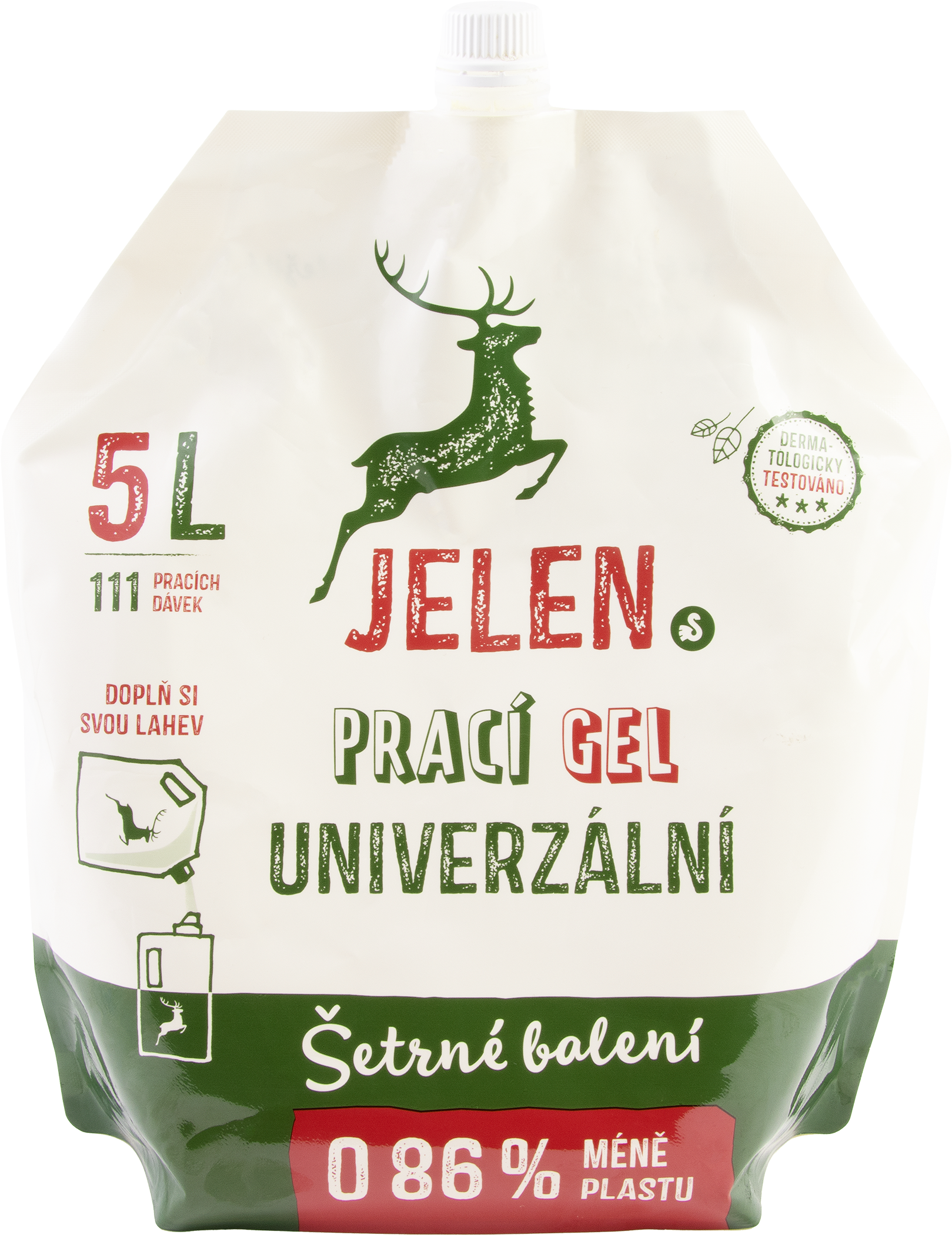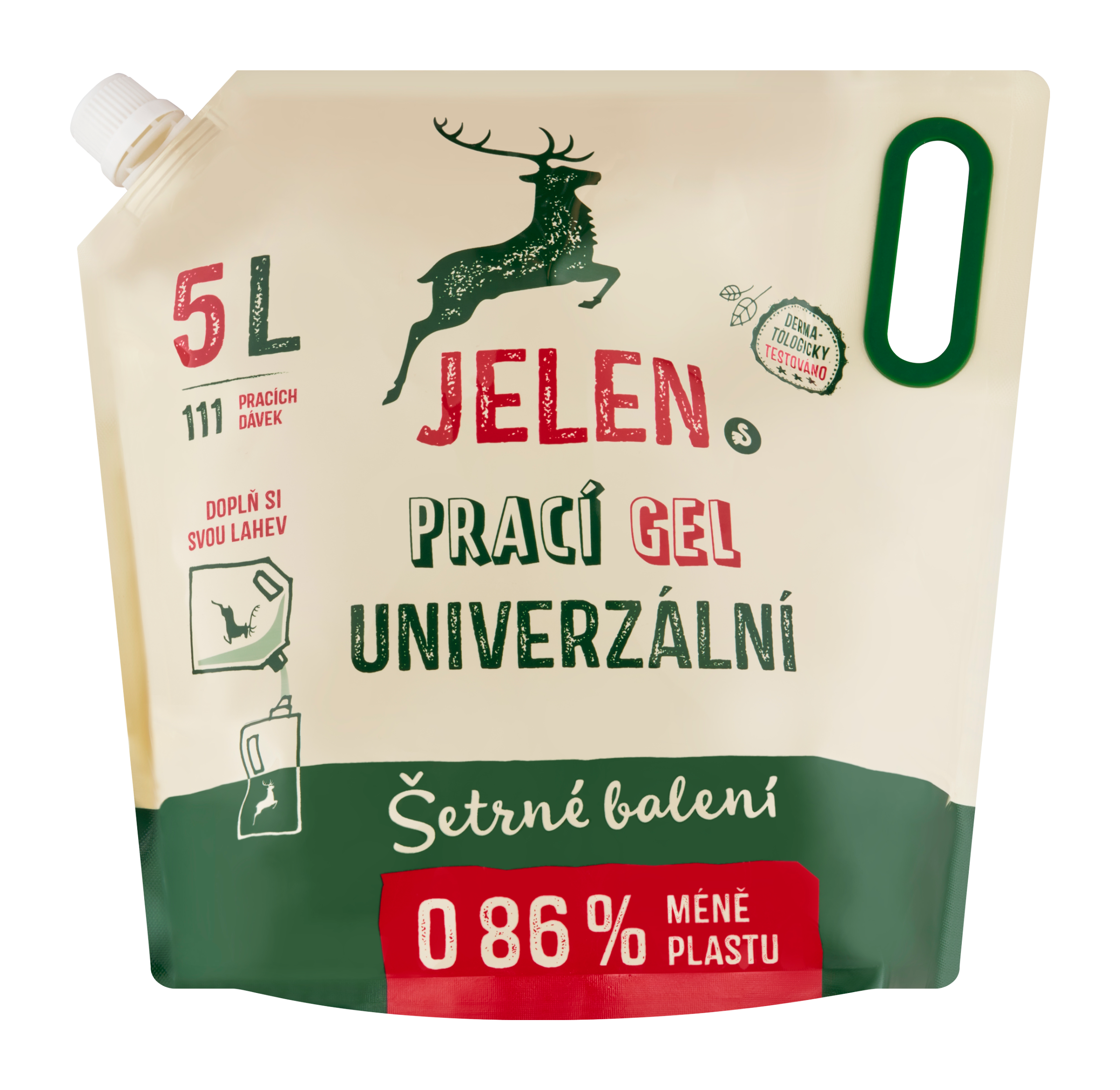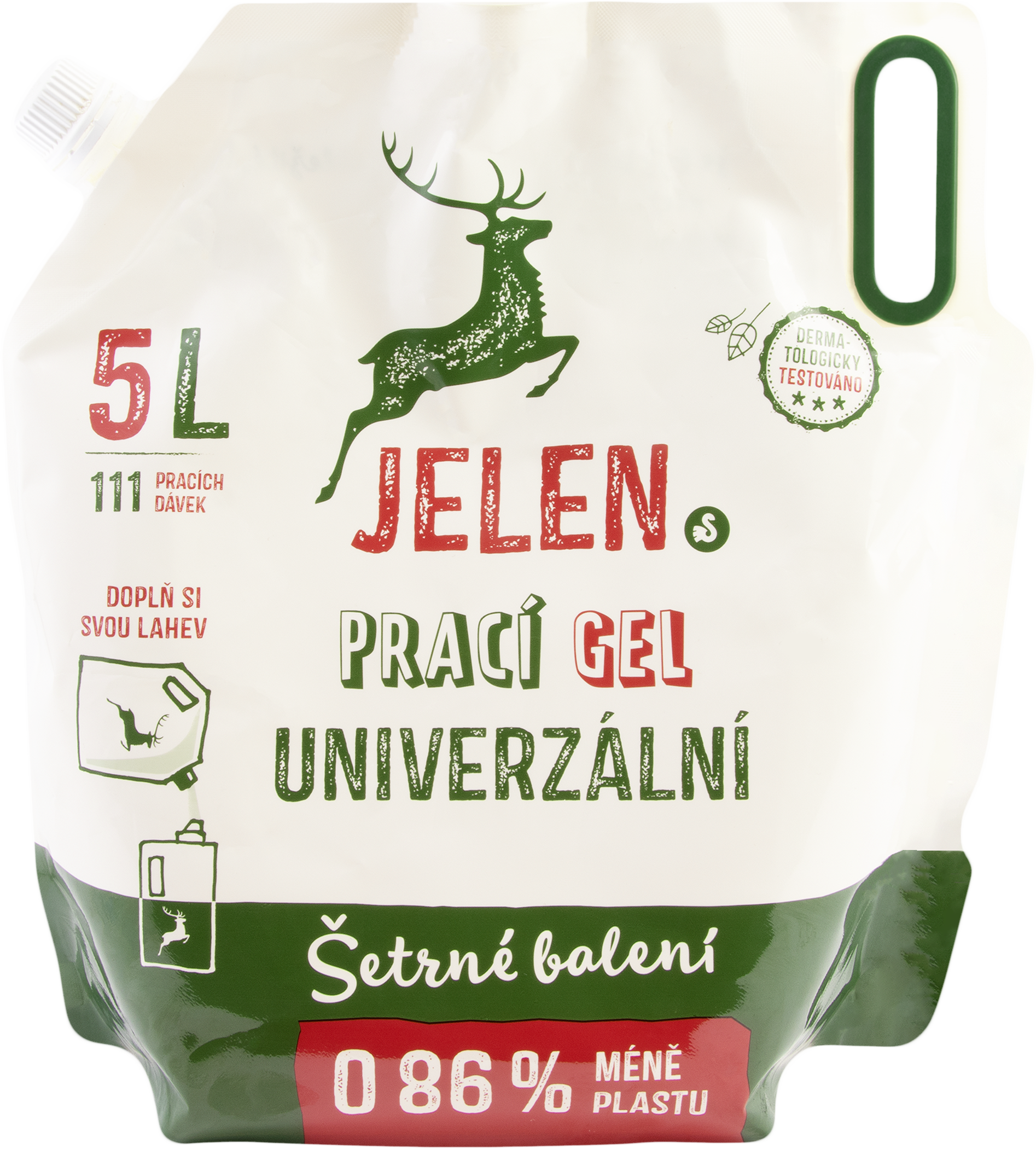 Jelen ví, že být šetrný k přírodě je důležité, ale ne vždy úplně jednoduché. Aby přírodu tolik nezatěžoval plastovým odpadem, připravil toto šetrné balení pracího gelu, na jehož výrobu použil o 86 % plastu méně oproti běžné lahvi. Šetrným balením skoro dvakrát doplníte velkou jelení lahev. I jeho receptura, na mýdlovém základu, je k přírodě co nejšetrnější. Poradí si přitom s prádlem bílým i barevným. Před praním však prádlo roztřiďte a dodržujte pokyny výrobce. Lze jej použít na praní v ruce i pračce.