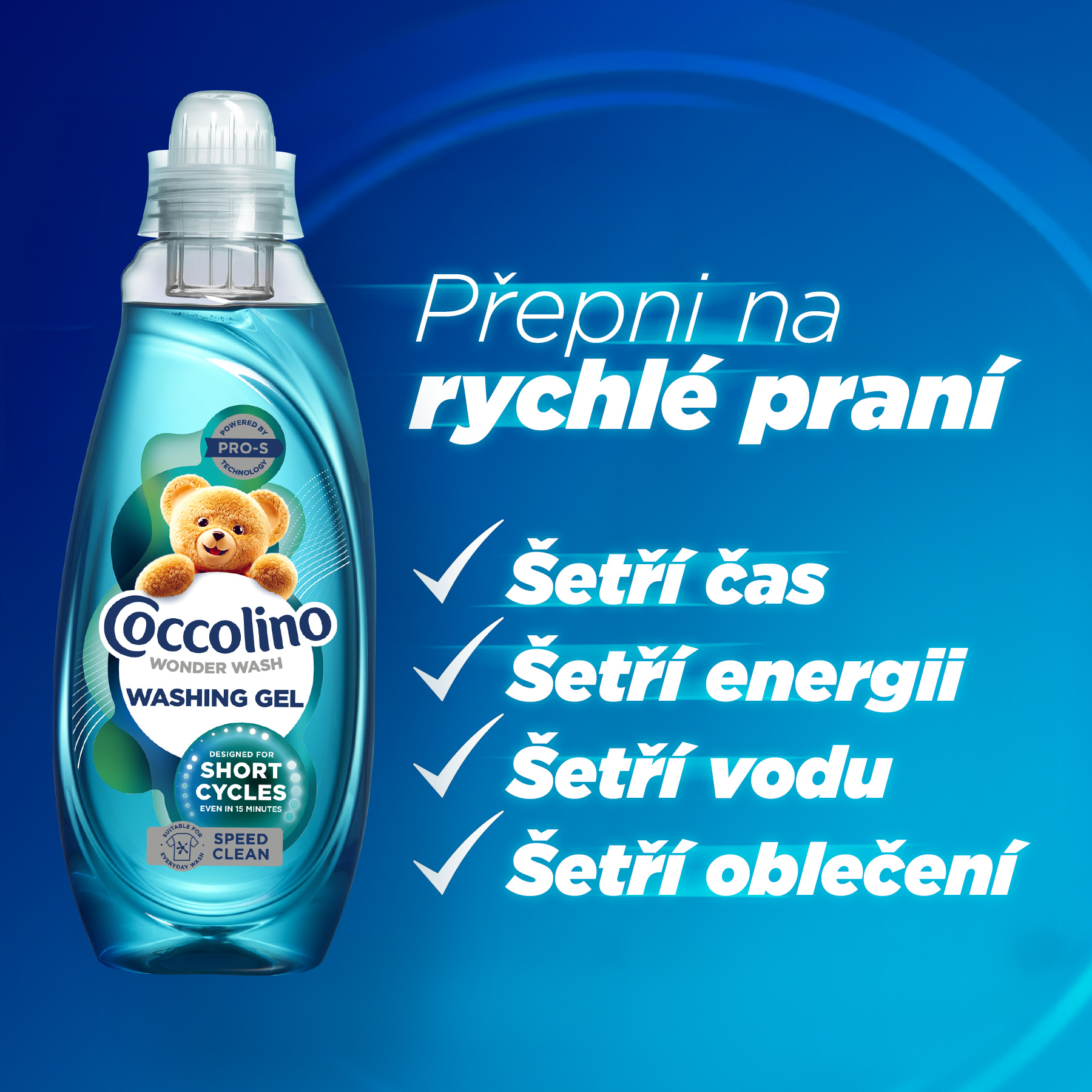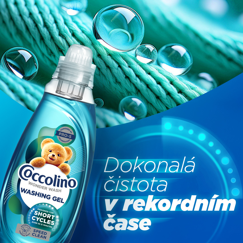 Objevte revoluci v praní s Coccolino Wonder Wash! Až 70% praného prádla není přímo zašpiněné od skvrn a tedy není ho potřeba trápit v pračce hodinovými cykly a tím ho více mechanicky narušovat. Představujeme vám Coccolino Wonder Wash, první prací gel speciálně vytvořený pro rychlé prací cykly. Užijte si dokonale čisté prádlo za pouhých 15 minut! Vyzkoušejte Coccolino Wonder Wash Speed Clean, který vám umožní mít prádlo čisté a svěží za pouhých 15 minut! Ideální pro ty, kteří mají nabitý program a potřebují rychlé a efektivní řešení pro každodenní praní. Ušetříte čas, energii i vodu, a přitom si můžete být jisti, že vaše oblečení bude vždy dokonale čisté. Navíc si dokáže poradit i s čerstvým lehčím zašpiněním!