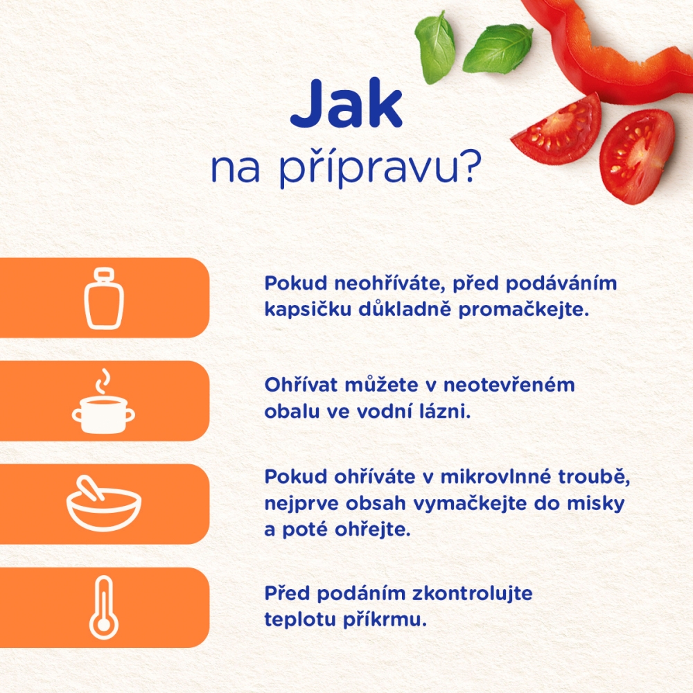 Před podáváním výrobek důkladně promačkejte nebo ho v neotevřeném obalu ohřejte ve vodní lázni. Nikdy neohřívejte výrobek s obalem v mikrovlnné troubě. Nejprve obsah vymačkejte do misky a poté ohřejte. Před podáváním ohřátého jídla vždy zkontrolujte jeho teplotu. Doporučujeme jídlo podávat lžičkou. Ohřátý výrobek ihned spotřebujte a nedojedené jídlo již znovu neohřívejte. Otevřené neohřáté balení uchovejte v chladničce a spotřebujte do 24 hodin. Při konzumaci nenechávejte dítě bez dozoru. Víčko uchovávejte mimo dosah dětí.