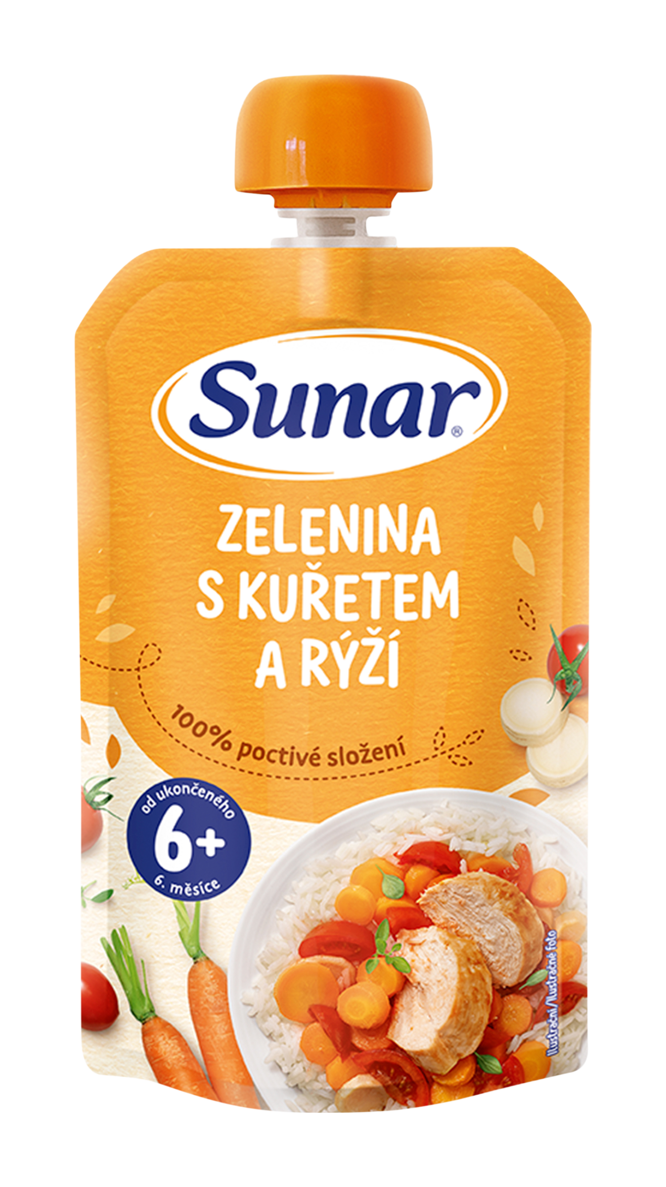 Sunar příkrm Zelenina s kuřetem a rýží je hotové jídlo v praktickém obalu, které můžete mít kdykoliv s sebou. Příkrmy vhodný od ukončeného 6. měsíce. Jemná konzistence bez kousků zajistí snadné vytlačení obsahu z kapsičky. Během chvilky můžete servírovat chutné jídlo k obědu či večeři. 100% poctivé složení. Bez přidané soli**, ze 100 % poctivých surovin v té nejvyšší baby kvalitě. Navařeno hravě a s chutí.