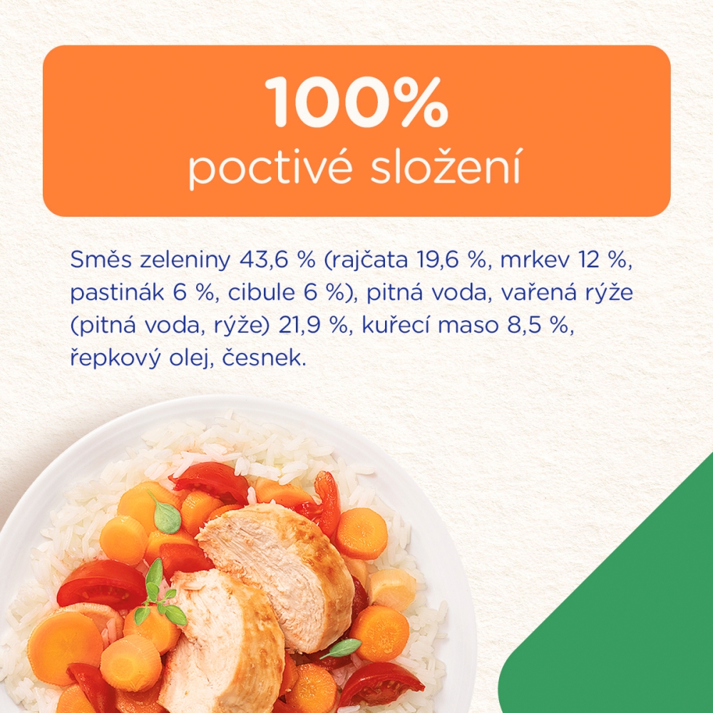 Směs zeleniny 43,6 % (rajčata 19,6 %, mrkev 12 %, pastinák 6 %, cibule 6 %), Pitná voda, Vařená rýže (pitná voda, rýže) 21,9 %, Kuřecí maso 8,5 %, Řepkový olej 1,7 %, Česnek