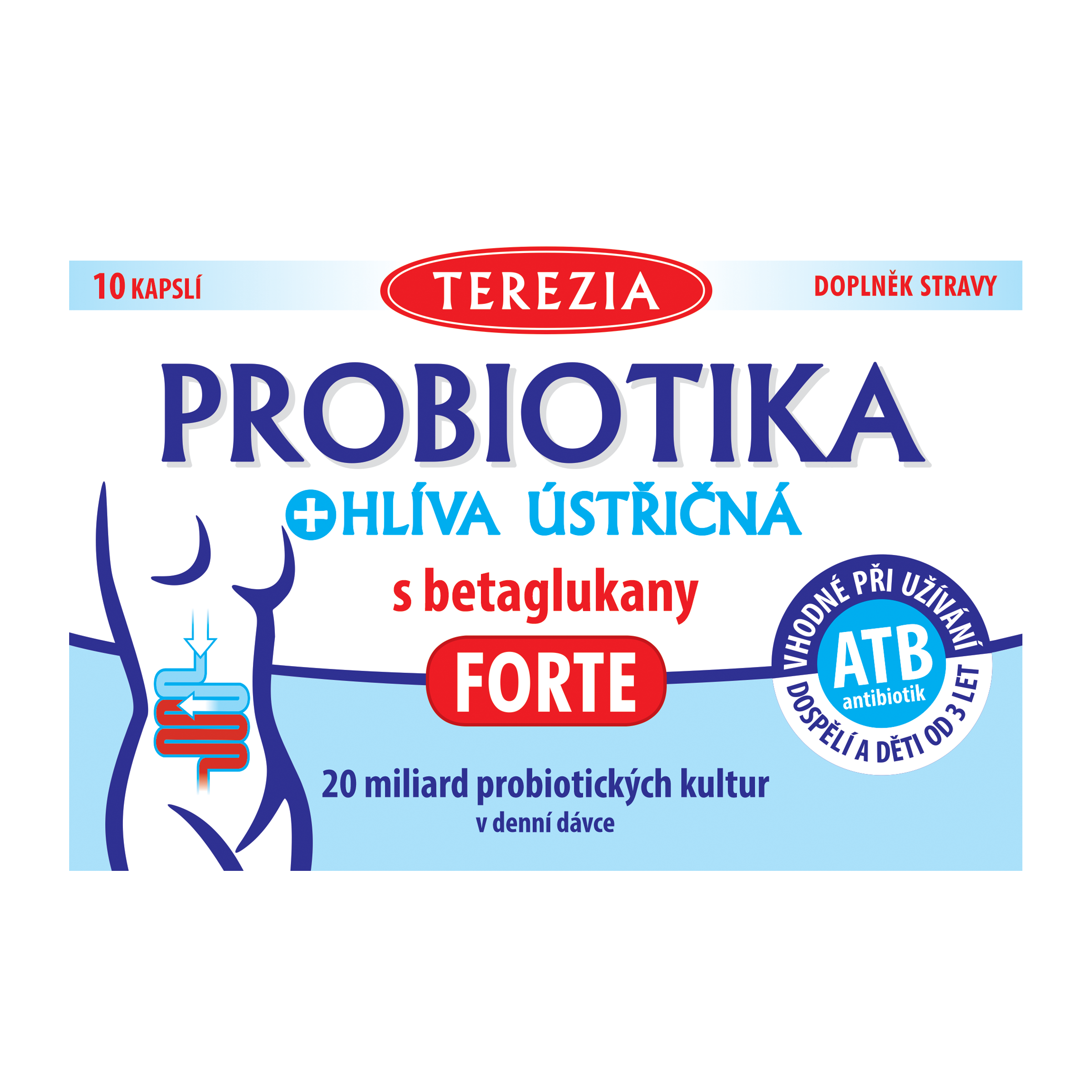 TEREZIA Probiotika obsahují 3 probiotické kmeny v množství 20 mld v denní dávce. Dále obsahuje hlívu ústřičnou s betaglukany a vlákninou, a šípek pro podporu imunity a trávení.