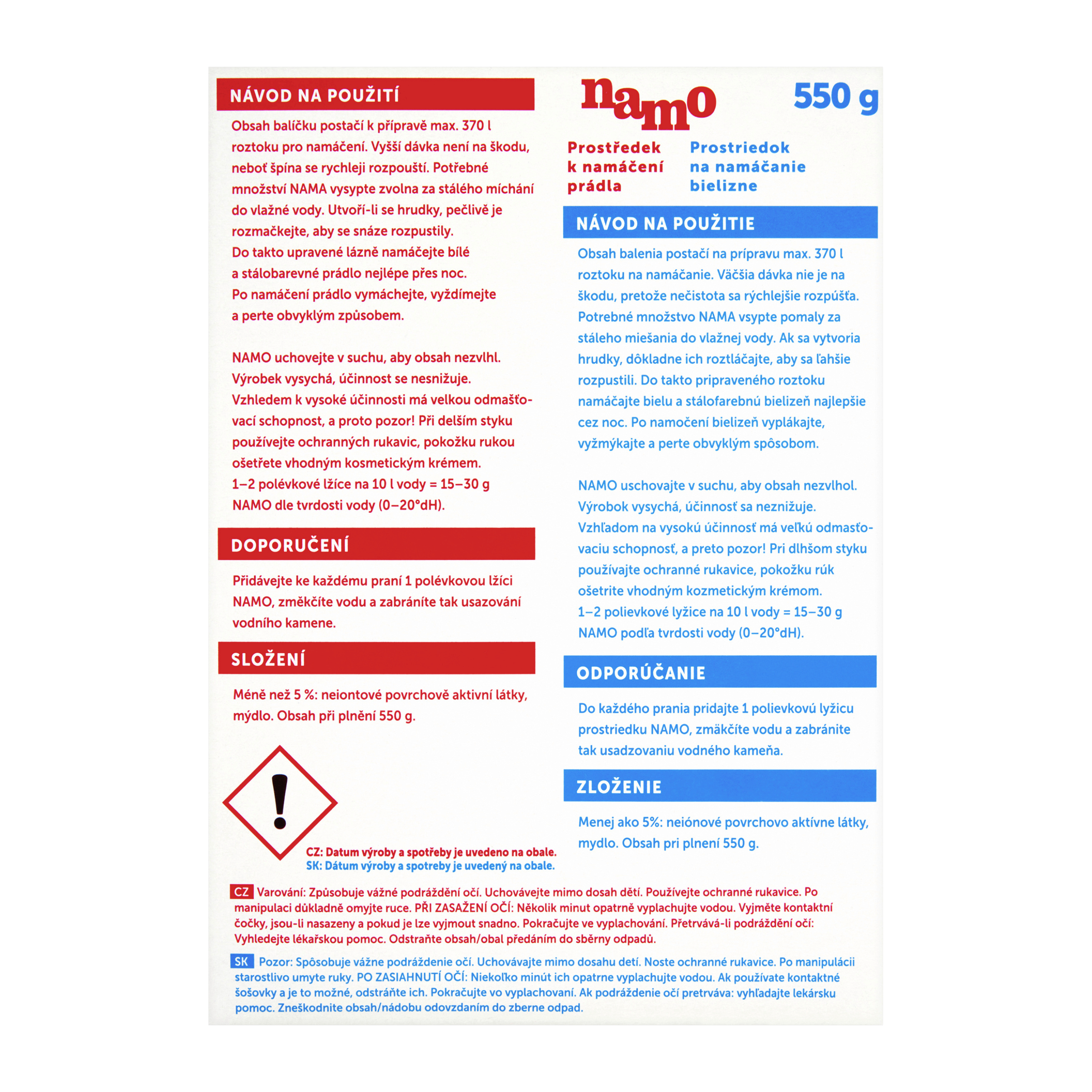 Obsah balíčku postačí k přípravě max. 370 l roztoku pro namáčení. Vyšší dávka není na škodu, neboť špína se rychleji rozpouští. Potřebné množství Nama vysypte zvolna za stálého míchání do vlažné vody. Utvoří-li se hrudky, pečlivě je rozmačkejte, aby se snáze rozpustily. Do takto upravené lázně namáčejte bílé a stálobarevné prádlo nejlépe přes noc. Po namáčení prádlo vymáchejte, vyždímejte a perte obvyklým způsobem. Výrobek vysychá, účinnost se nesnižuje. Vzhledem k vysoké účinnosti má velkou odmašťovací schopnost, a proto pozor! Při delším styku používejte ochranných rukavic, pokožku rukou ošetřete vhodným kosmetickým krémem. 1-2 polévkové lžíce na 10 l vody = 15-30 g Nama dle tvrdosti vody (0-20°dH). Doporučení Přidávejte ke každému praní 1 polévkovou lžíci Namo, změkčíte vodu a zabráníte tak usazování vodního kamene.