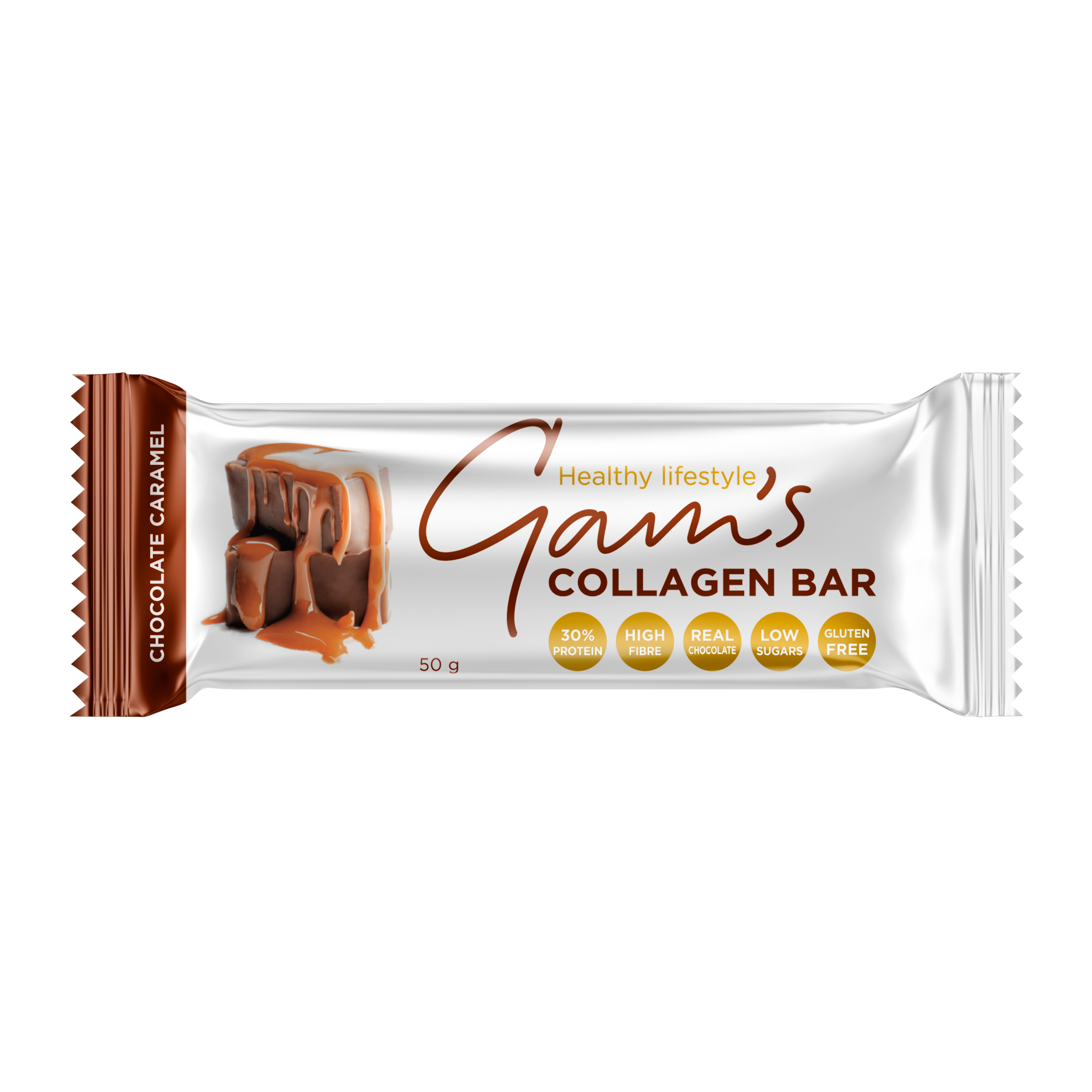 Proteinová tyčinka s kolagenem, kakaem a pastou s karamelovou příchutí v mléčné čokoládě.