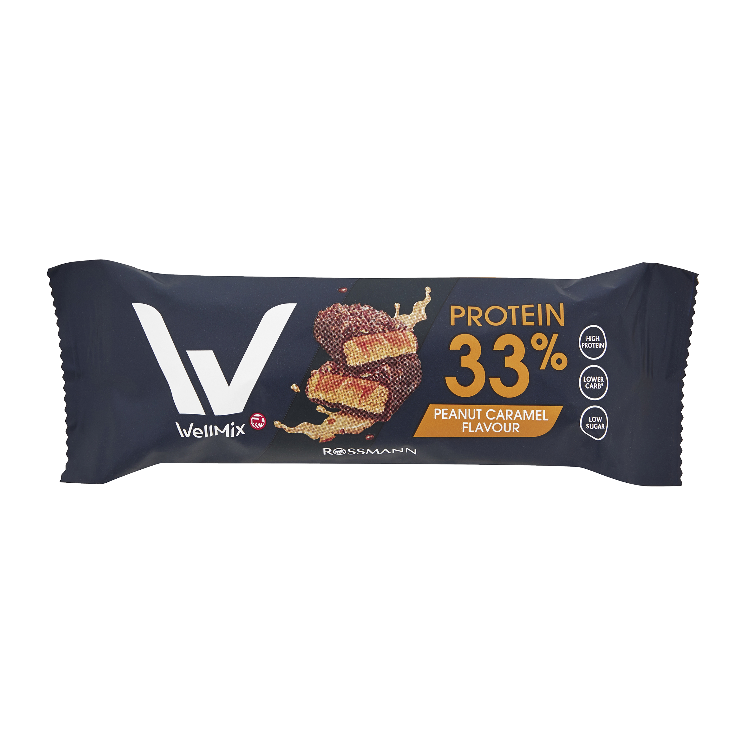 Proteinová tyčinka s 33 % bílkovin, s příchutí arašídů a karamelu v polevě z mléčné čokolády, se sladidly.