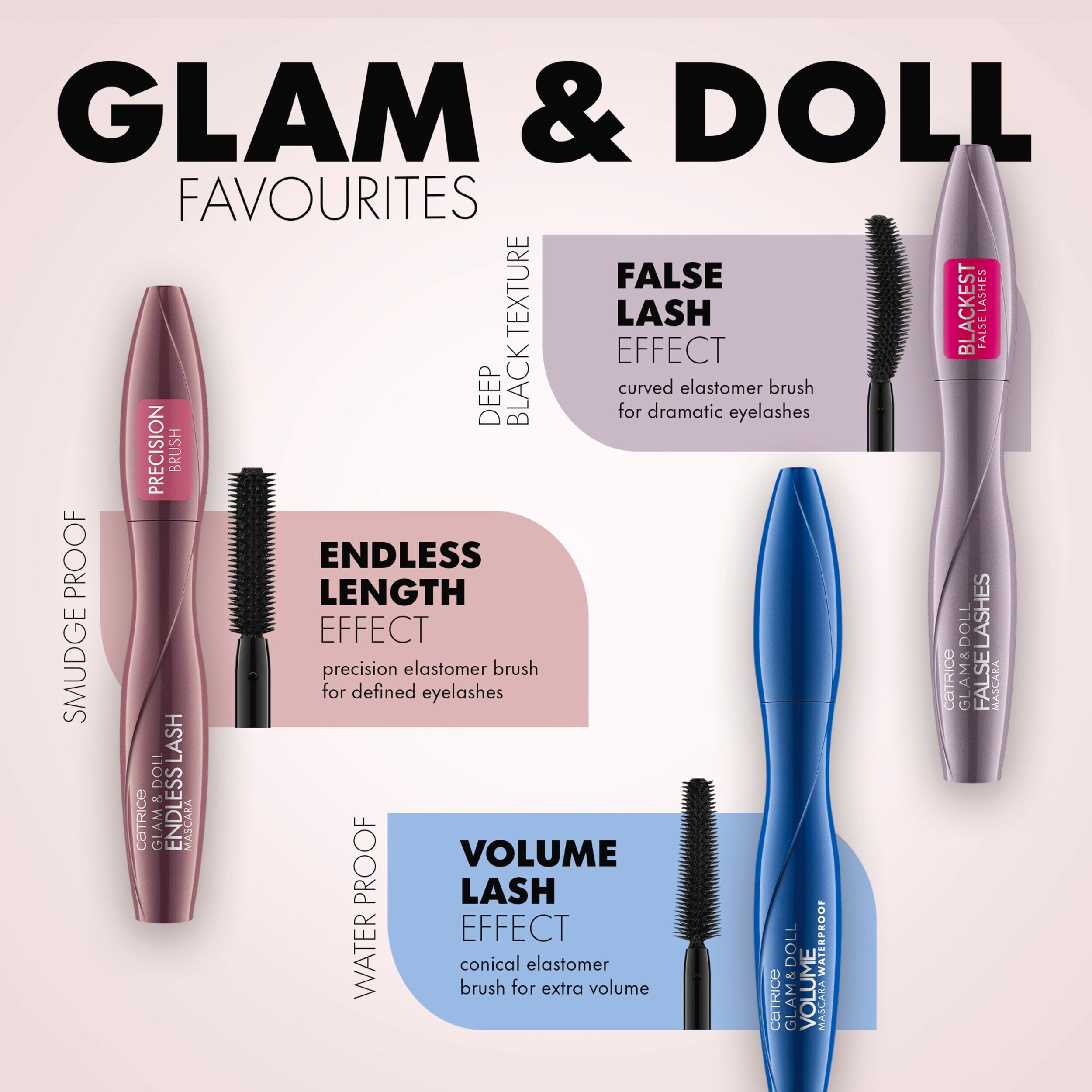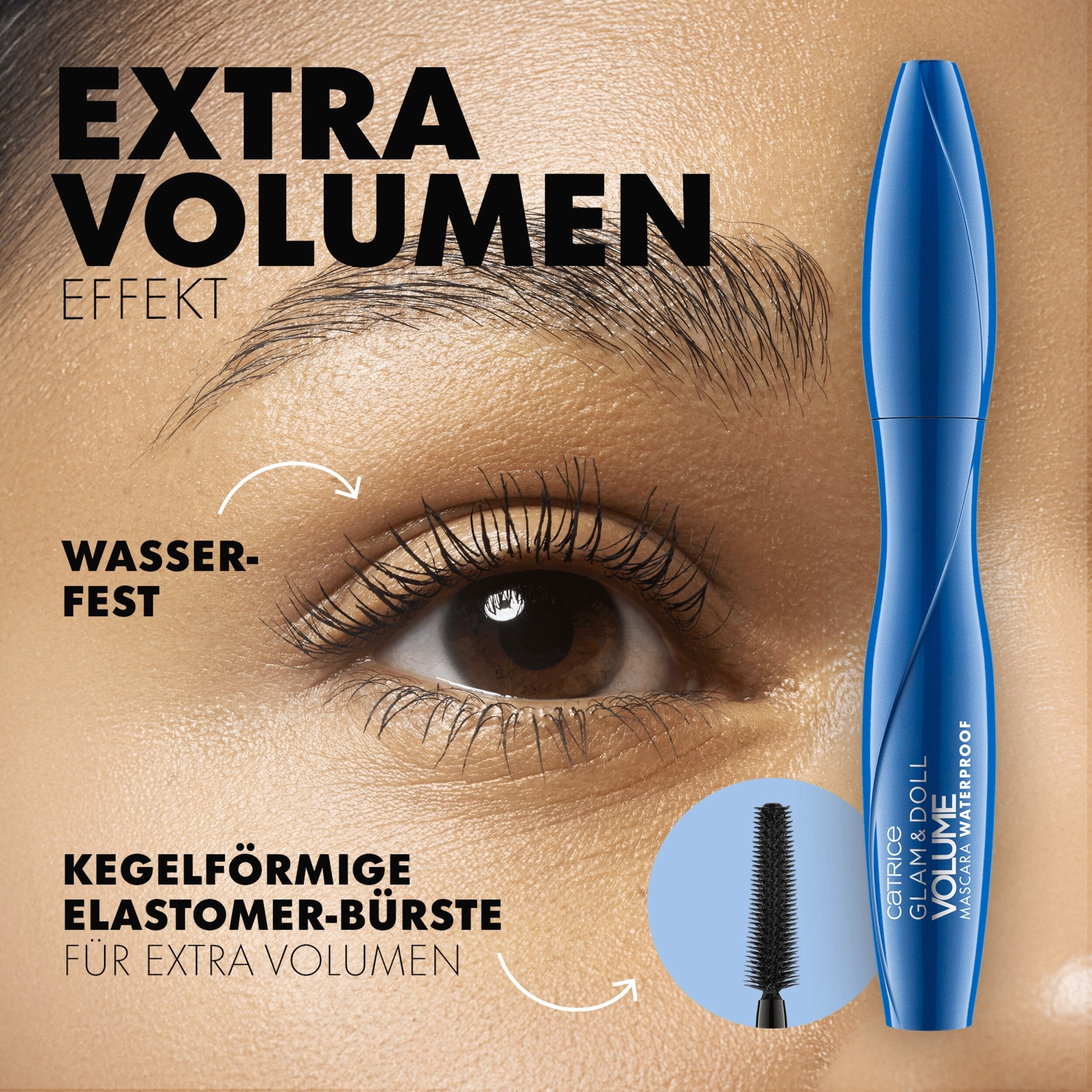Voděodolná řasenka Glam & Doll Volume vytváří obzvláště dlouhotrvající a objemné řasy. Speciální elastomerový kartáček absorbuje spoustu krémově černé textury a obalí každou řasu, aniž by ji zatěžoval. Výsledkem je extra objem, fascinující délka a jedinečné natočení po celý den! Oftalmologicky testováno.