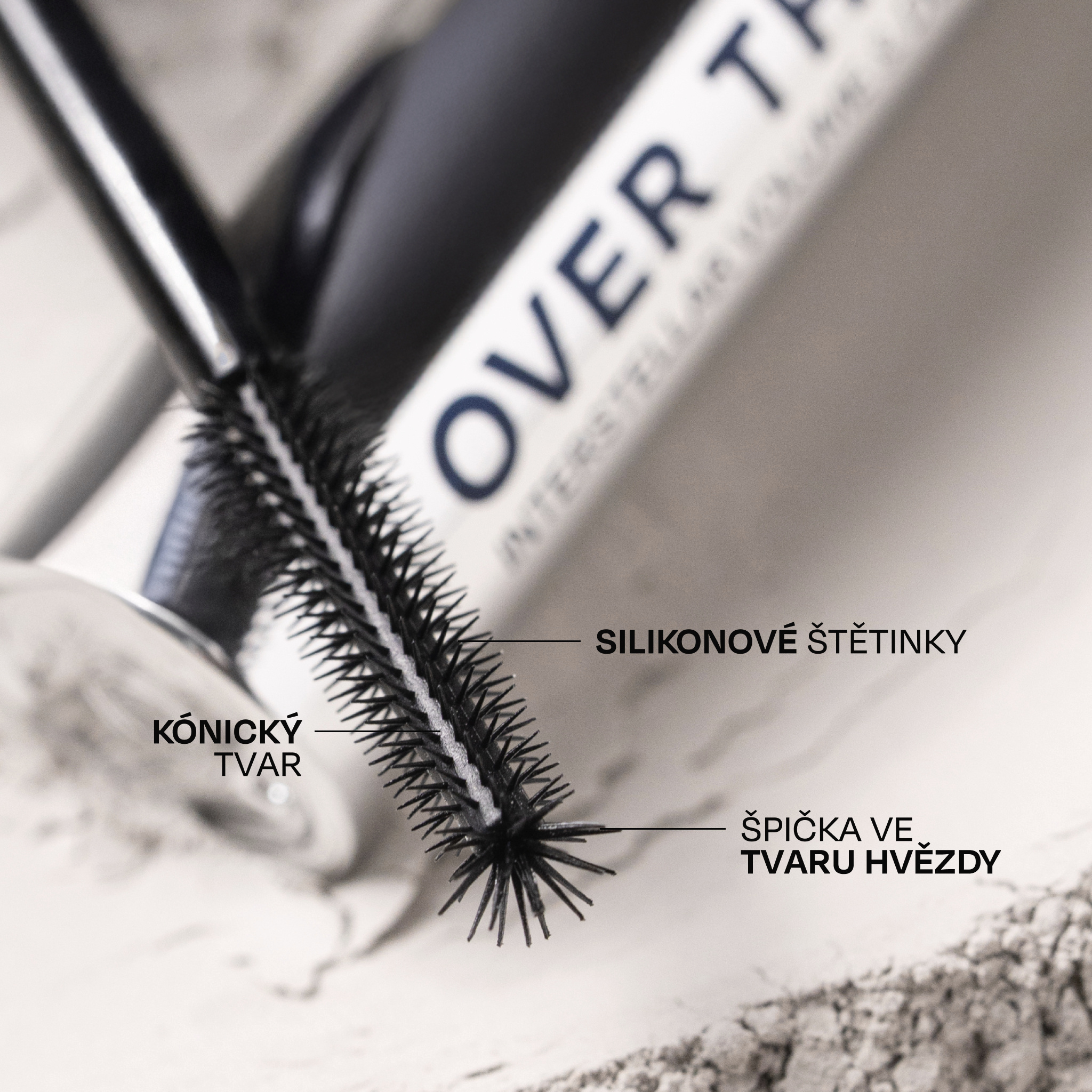 Štětinový kartáček se postará o snadné nanášení, panoramatický objem a natočení řas.