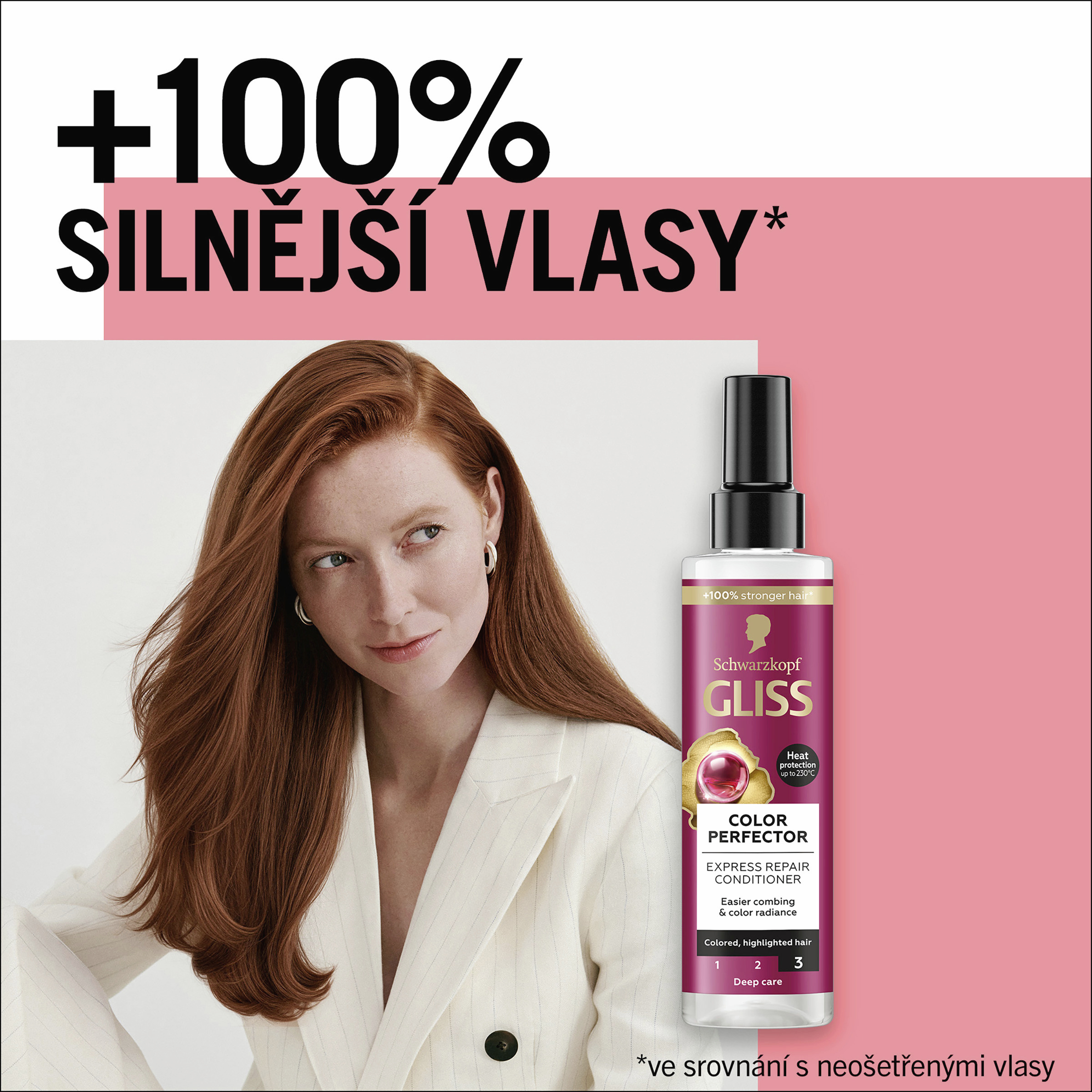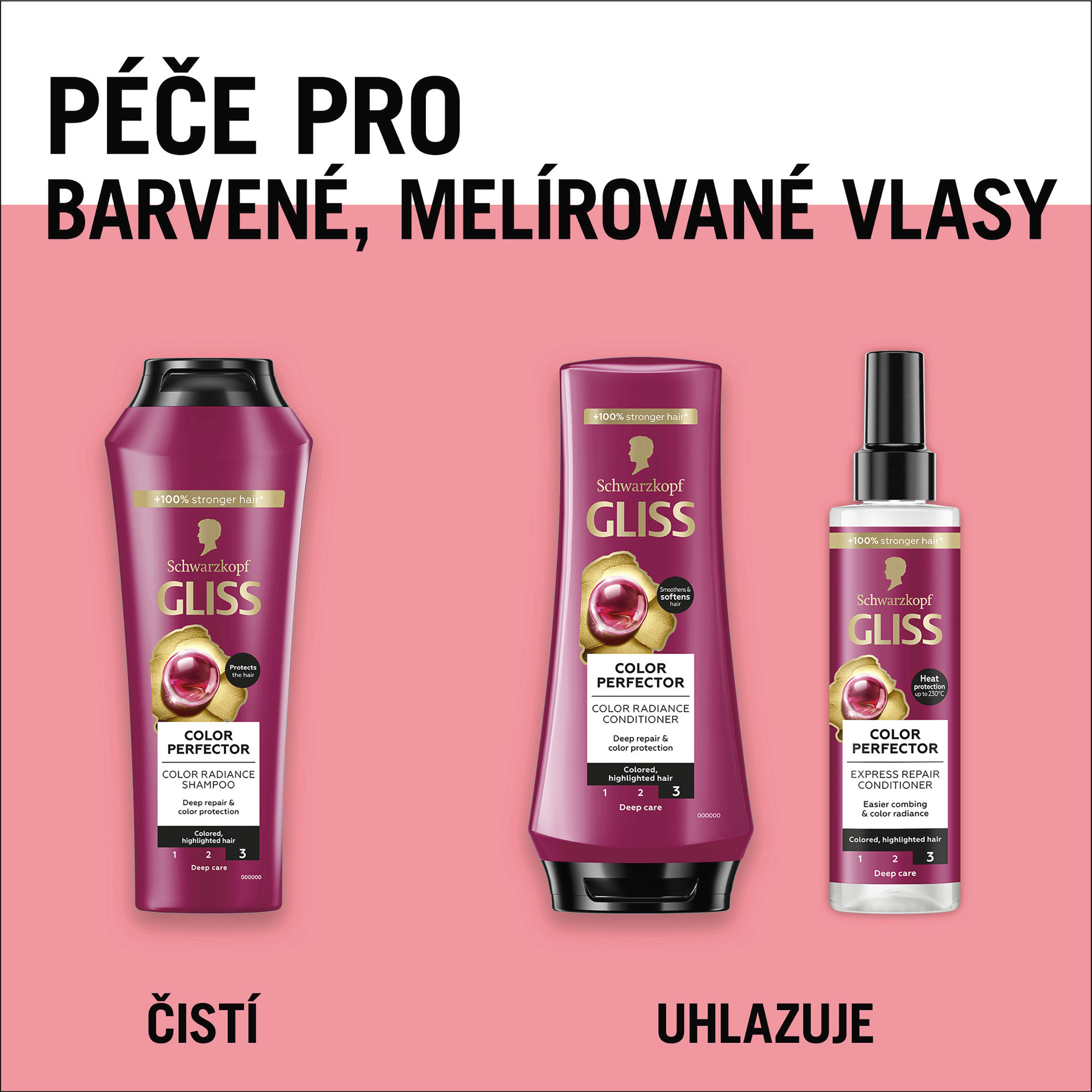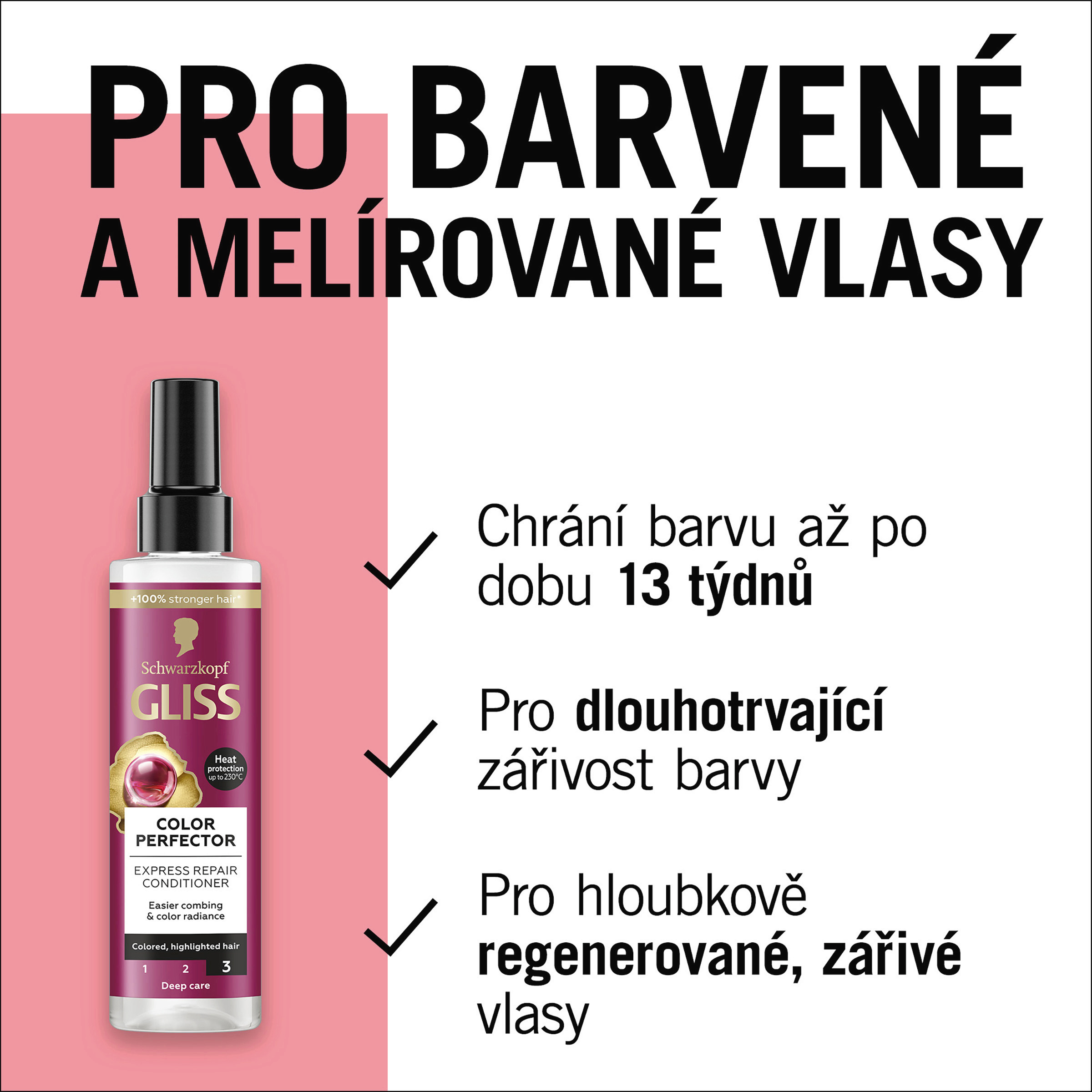 - Expresní obnovující kondicionér Gliss Color Perfector s hyaluronovou směsí + brusinkovým extraktem pro barvené a melírované vlasy. Snazší rozčesávání a zářivost barvy. Hloubková obnova vlasů a ochrana barvy až na 13 týdnů a dlouhotrvající zářivost barvy**. **v kombinaci se šamponem Color Perfector.