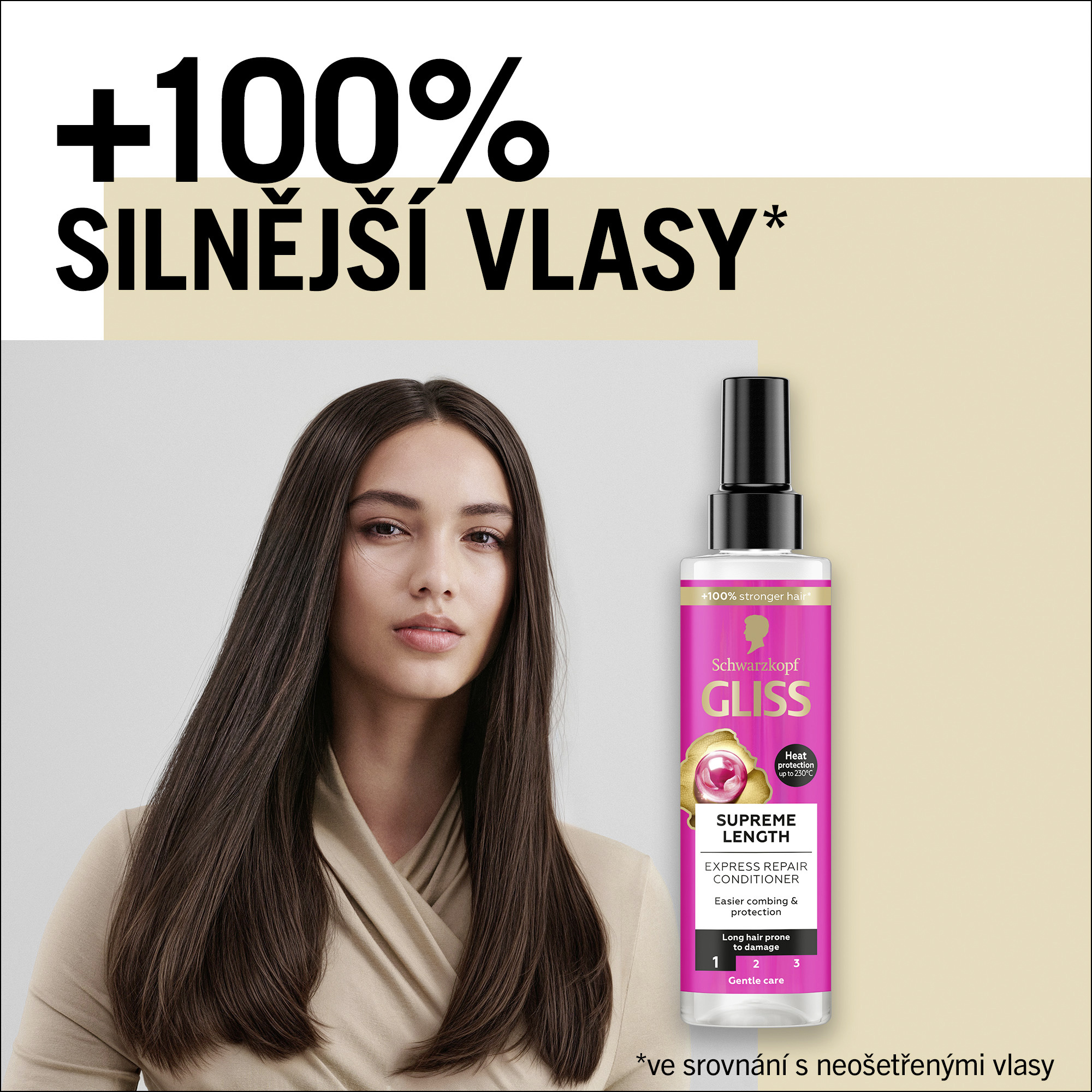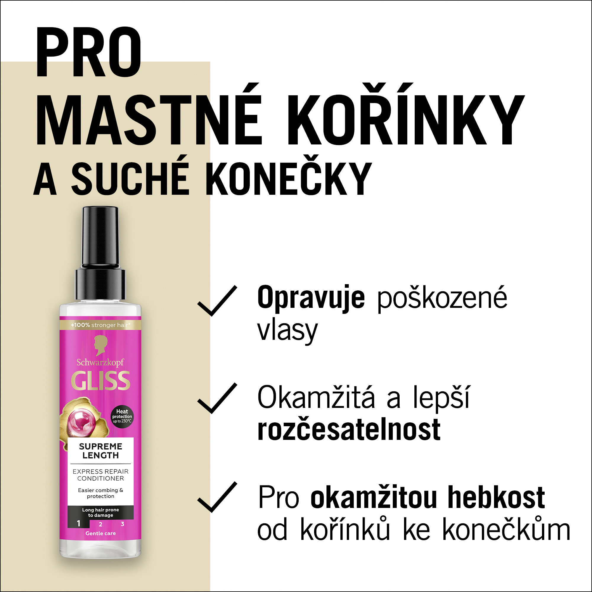 - Expresní kondicionér Gliss Supreme Length s biotinovým komplexem + extraktem z květů pivoňky pro dlouhé vlasy náchylné k poškození. Jednoduché rozčesávání a ochrana. Okamžitá hladkost a regenerace poškozených vlasů.
