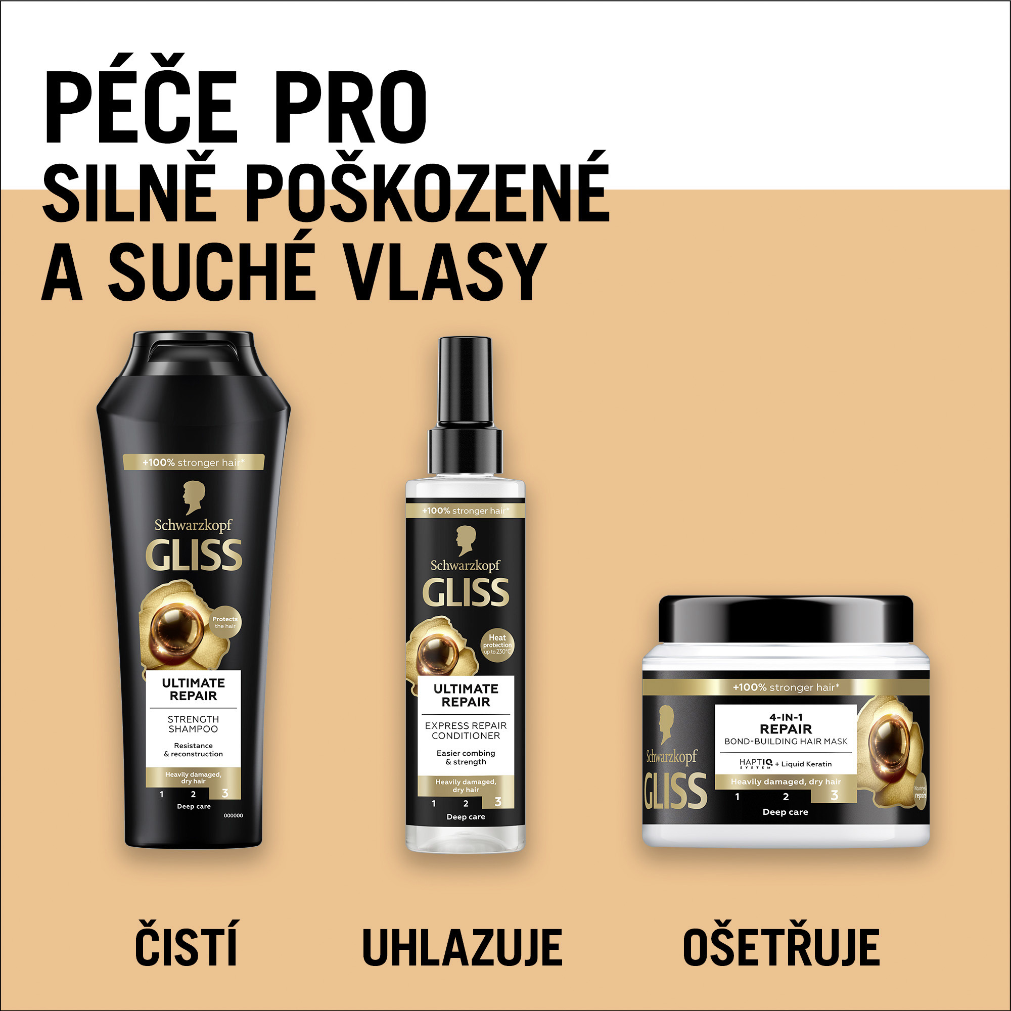 - Expresní kondicionér Gliss Ultimate Repair s tekutým keratinem a výtažkem z černé perly pro silně poškozené a suché vlasy. Snazší rozčesávání a pevnost. Hloubková obnova vlasové struktury a až 20-krát vyšší odolnost* a lesk. *vs. neošetřené vlasy.