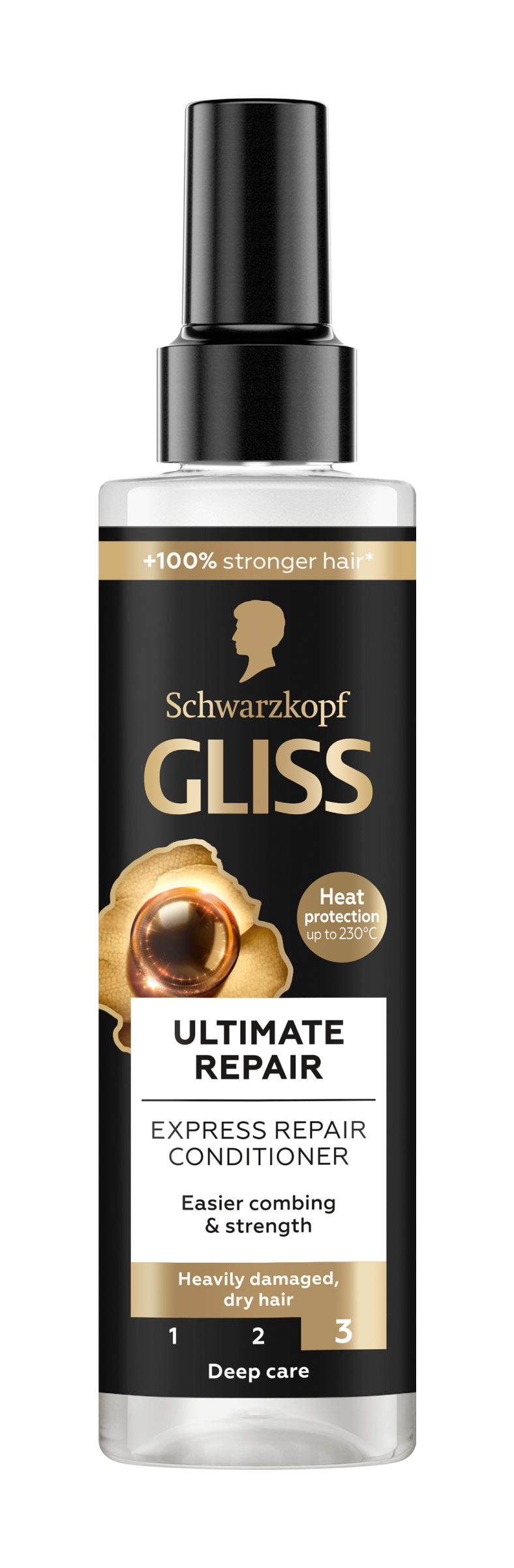 Velmi poškozené vlasy postupně ztrácí keratin, což vede k silnému oslabení vlasové struktury. To vyžaduje mimořádnou péči, aby se ztracený keratin opět obnovil. Schwarzkopf Gliss Ultimate Repair regenerační kondicionér ve spreji kombinuje tekutý keratin & extrakt z černé perly pro důkladné doplnění ztraceného keratinu a intenzivní regeneraci vlasové struktury. Úroveň péče Gliss: 3 - Hloubková péče, se složením s vysoce účinnými ingrediencemi pro hloubkovou regeneraci vlasů Tento Gliss expresní regenerační kondicionér pomáhá vyživit vlasy pro okamžité a snadnější rozčesávání. Nabízí ochranu vlasů před teplem až do 230 °C, hloubkovou obnovu vlasové struktury a až 20x vyšší odolnost* a lesk. 87 % ingrediencí je přírodního původu**. Gliss vlasové produkty jsou certifikovány organizací PETA***. Tělo láhve je vyrobeno ze 100% recyklovaného plastu****.