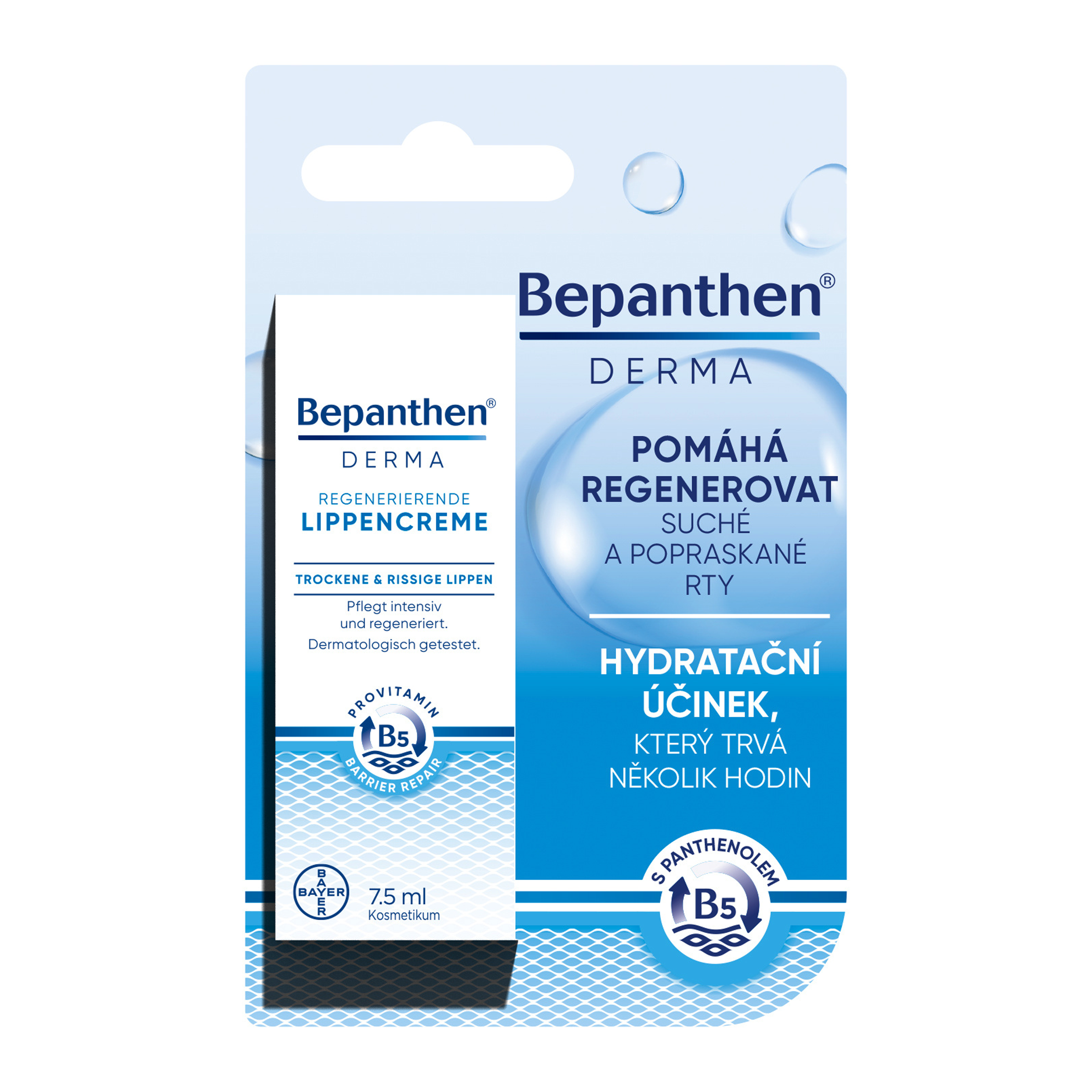 Okamžitá ochrana a péče o suché a popraskané rty. Bepanthen krém na rty je vhodný pro každodenní péči o suché, drsné a popraskané rty. Díky panthenolu, který regeneruje pokožku, pečuje o rty, aby byly hebké, jemné a vláčné.