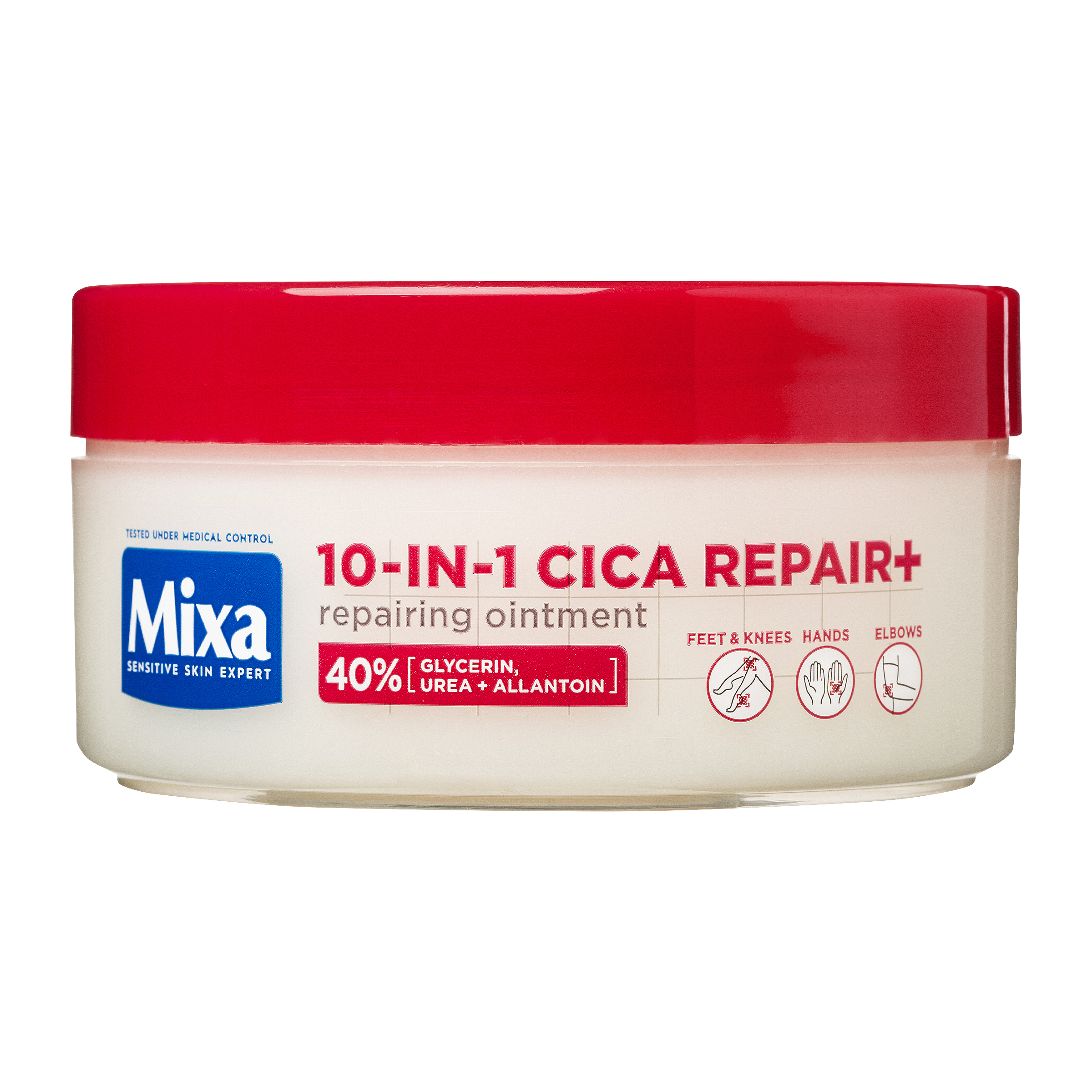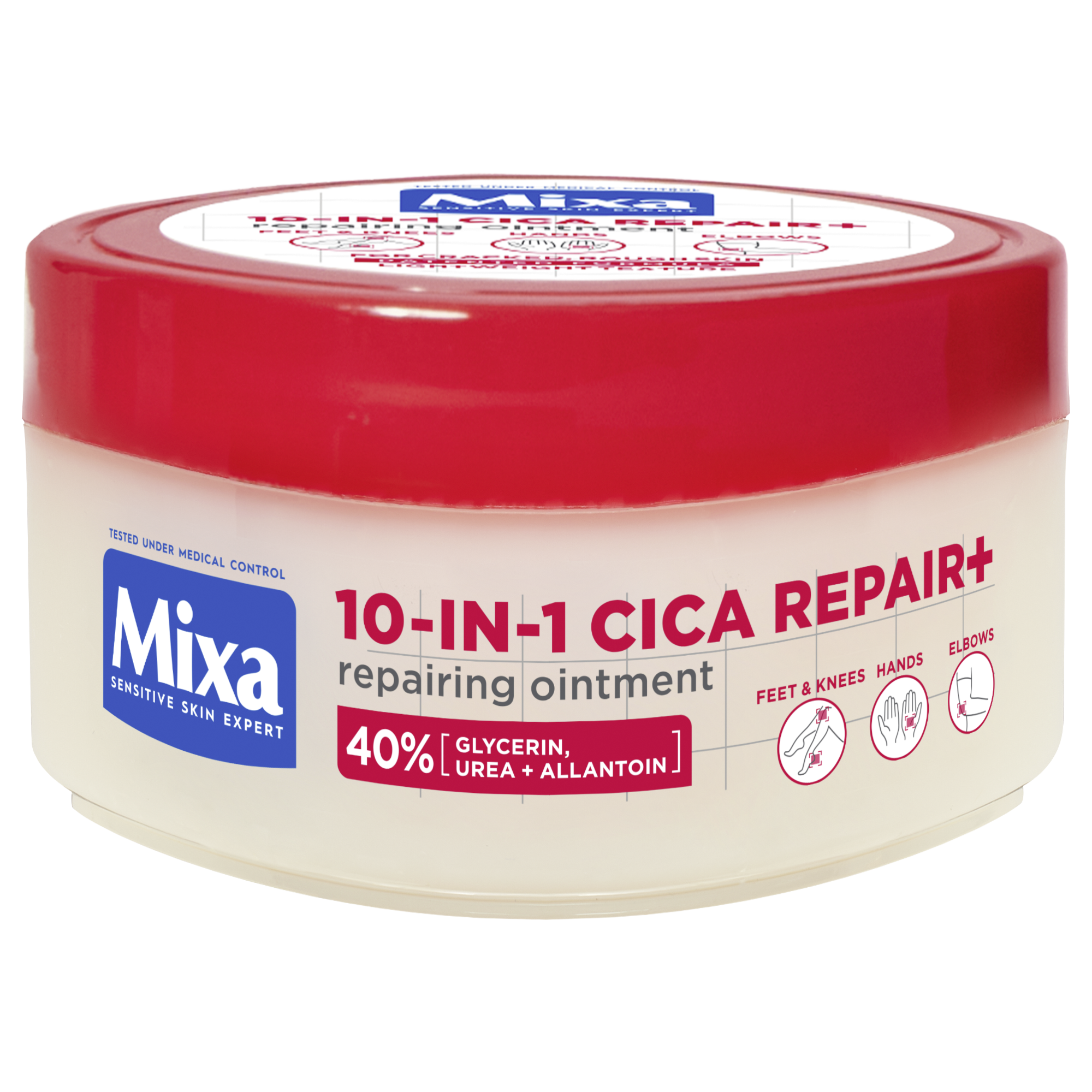 Mixa 10v1 CICA REPAIR+ regenerační mast s patentovaným složením a 40 % obsahem glycerinu, urei a allantoinu pomáhá regenerovat a chránit poškozenou pokožku, zmírňuje svědění, podráždění a napětí a poskytuje hloubkovou hydrataci po dobu až 48 hodin.