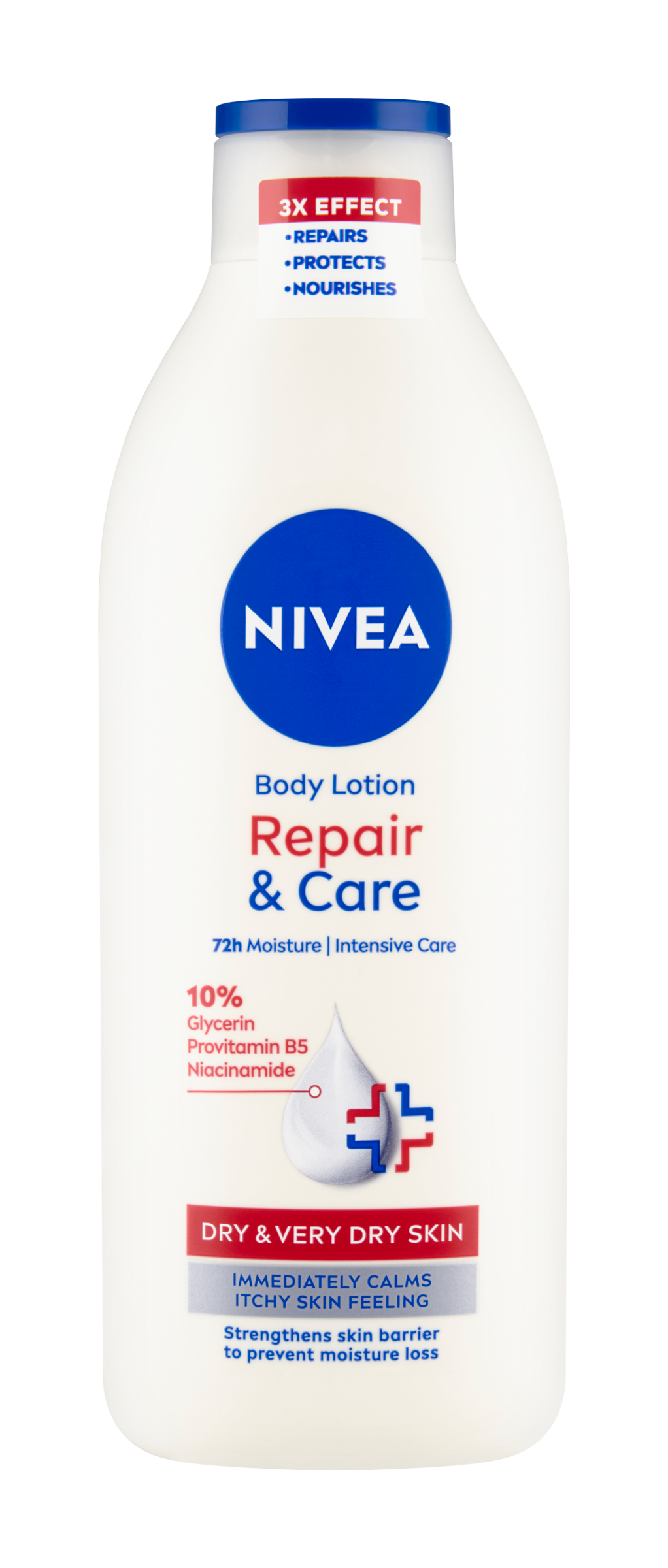 Nivea® Tělové mléko Repair & Care s 10% komplexem glycerinu, provitamínu B5 a niacinamidu okamžitě zklidní i velmi suchou a svědící pokožku. Posiluje kožní bariéru a zabraňuje tak ztrátě hydratace. Poskytuje až 72h hloubkovou hydrataci.
