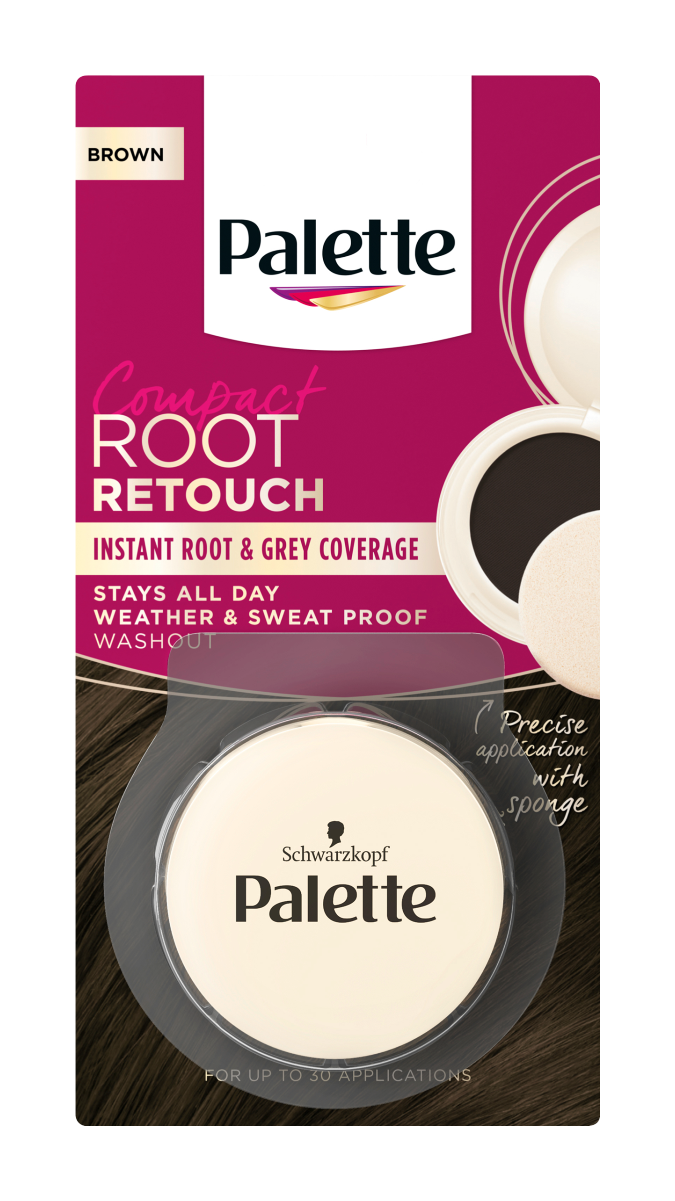 Palette Compact Root Retouch - kompaktní pudr pro okamžité zakrytí odrostů a šedin Potřebujete zakrýt nežádoucí odrosty na poslední chvíli? Řekněte odrostům sbohem a zakryjte je během několika sekund s pomocí kompaktního pudru Palette Root Retouch. Díky vysoce pigmentovanému pudrovému složení Vám odrostlé kořínky dokonale splynou se zbytkem vlasů, rychle a bez zatížení. Houbička, která je součástí balení, zajistí snadnou a přesnou aplikaci přesně tam, kde potřebujete - kdekoliv a kdykoliv. Kompaktní pudr Palette Root Retouch je jednoduše smývatelný pomocí šamponu a jeho balení vystačí až na 30 použití. Až 93 % ingrediencí přírodního původu a 100% recyklovatelné balení (kromě houbičky).