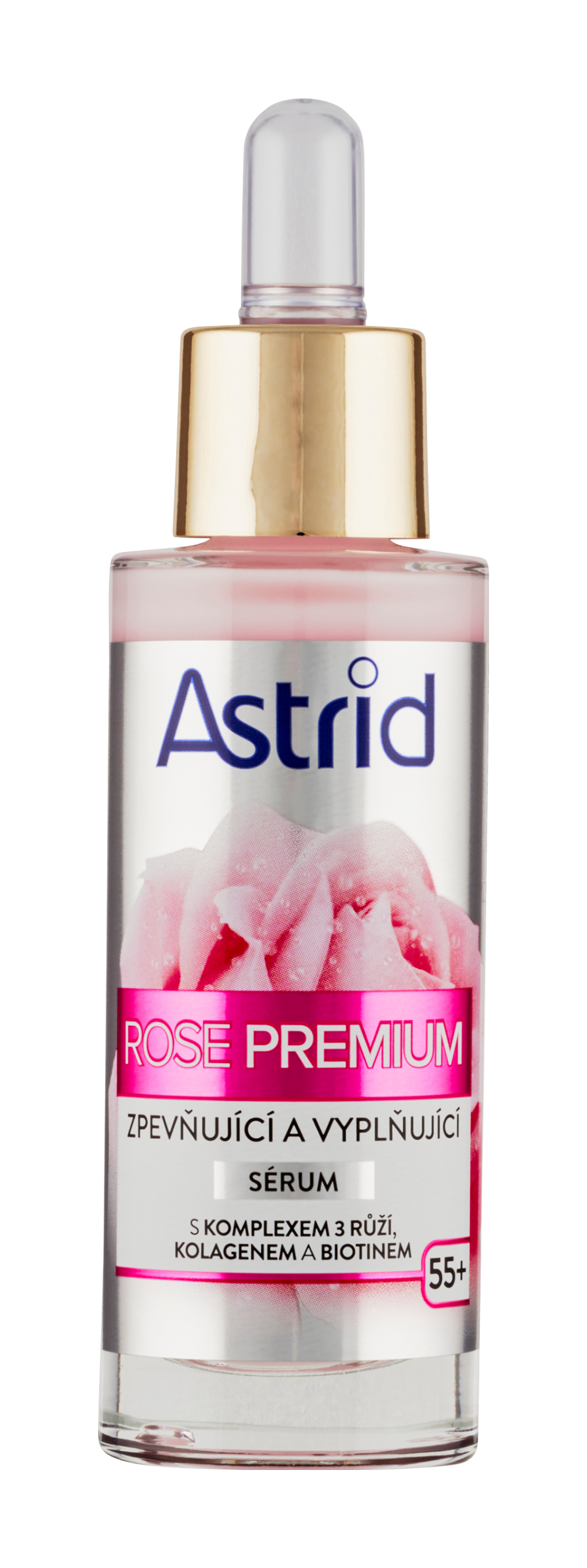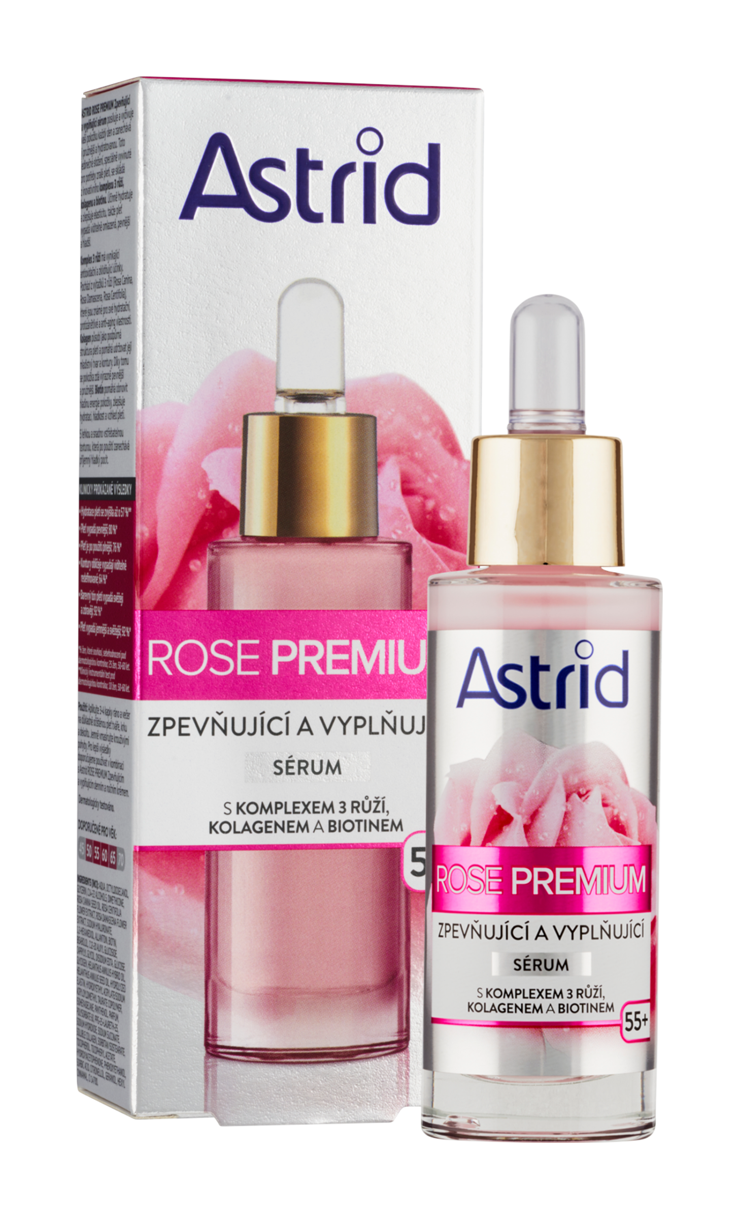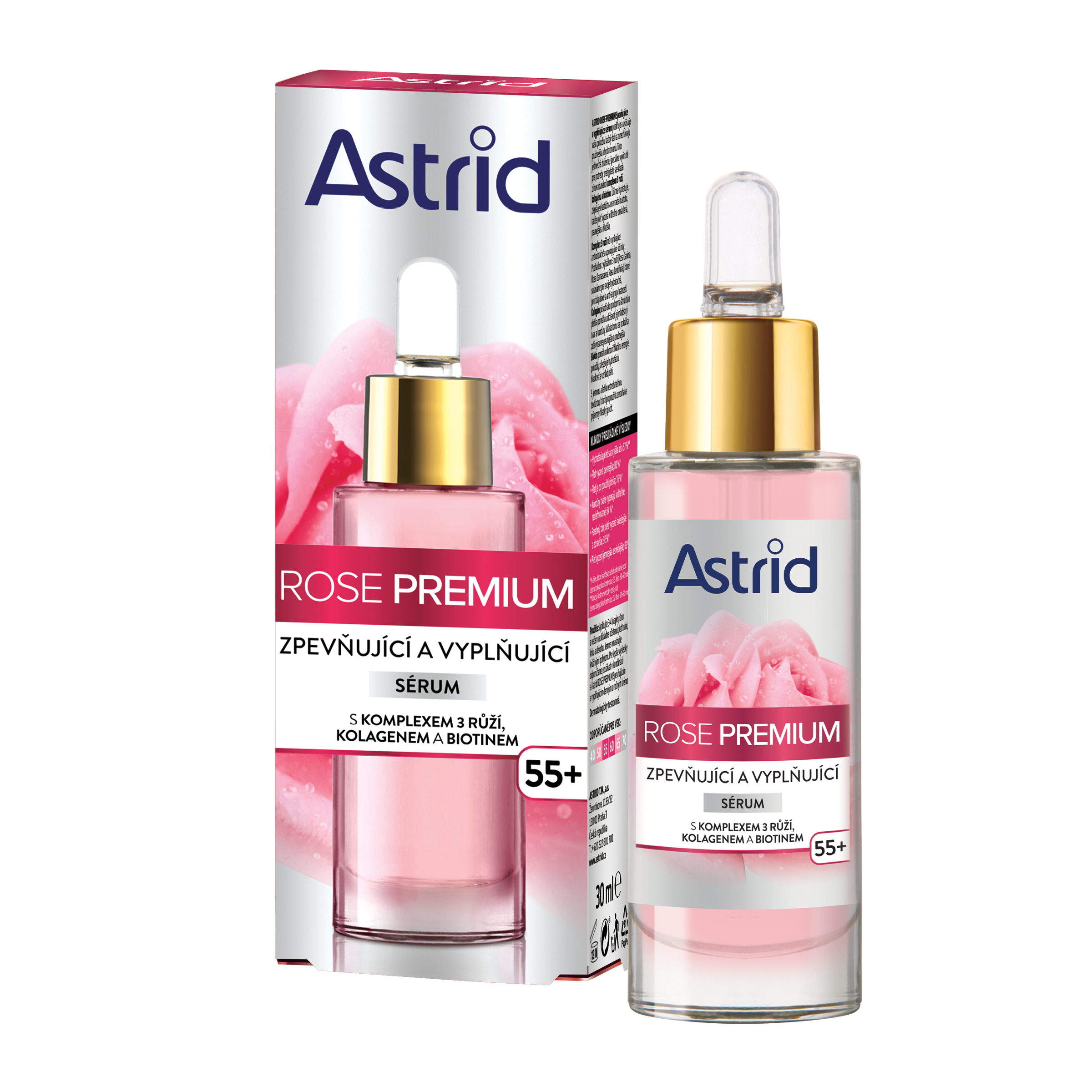 Astrid Rose Premium zpevňující a vyplňující sérum posiluje a vyživuje vaši pokožku každý den a zanechává ji pružnější a hydratovanou. Toto jedinečné složení, speciálně vyvinuté pro potřeby zralé pleti, se skládá z inovativního komplexu 3 růží, kolagenu a biotinu. Účinně hydratuje a zlepšuje elasticitu, takže pleť vypadá viditelně omlazená, pevnější a hladší. Komplex 3 růží má vynikající antioxidační a zklidňující účinky.