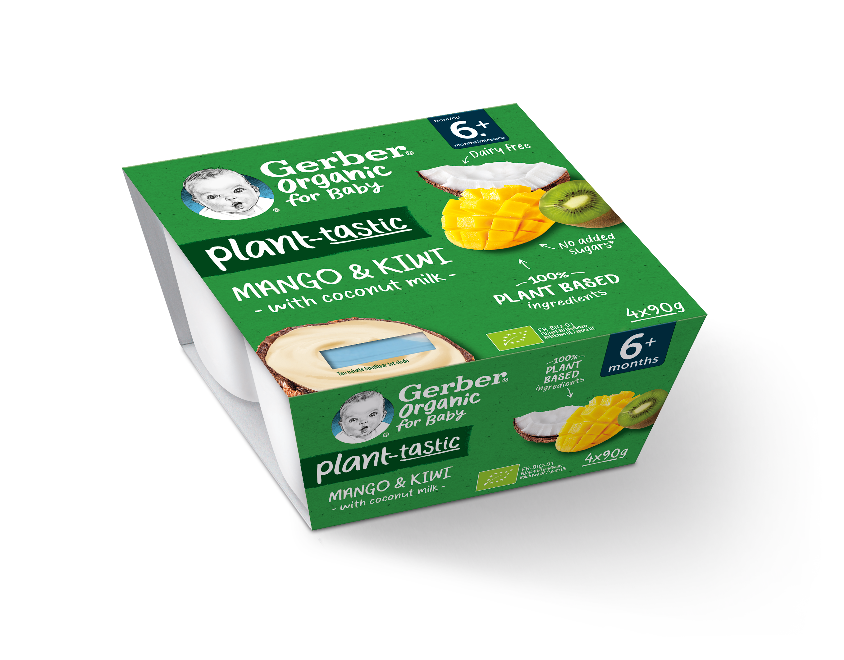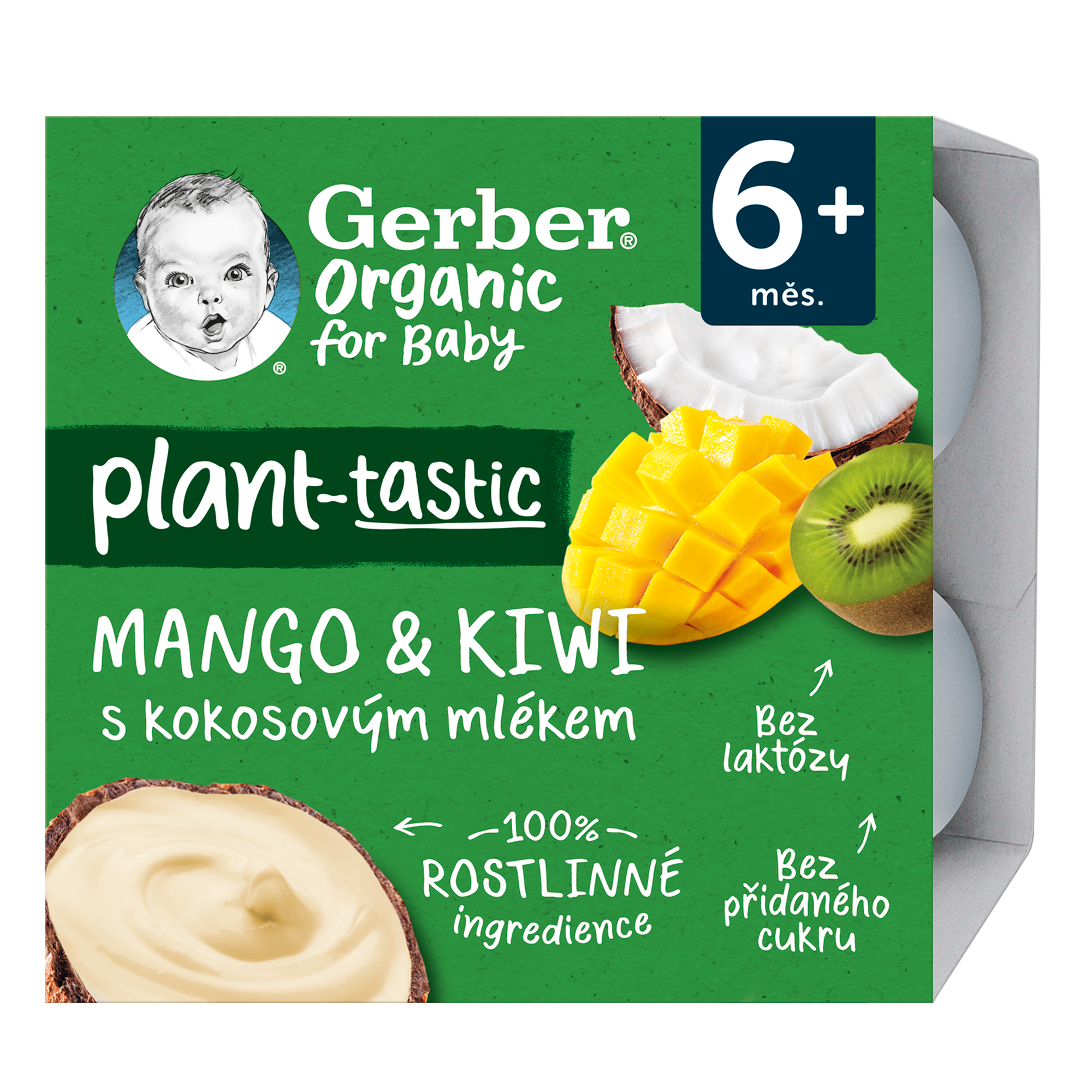 GERBER Organic 100% rostlinný dezert mango kiwi s kokosovým mlékem je svačinka, díky které váš malý gurmán může objevovat chutě exotického ovoce. Složení čistě z rostlinných ingrediencí představuje chutnou a rychlou svačinku kdykoliv během dne. Váš malý jedlík si užije přirozenou chuť exotického manga a kiwi společně kokosovým mlékem. Každá lžička obsahuje suroviny, které pocházejí z ekologického zemědělství, kde jsou pěstovány s respektem k přírodě. Balení obsahuje 4 porce, které můžete vzít jak na cesty, tak dát vašemu malému gurmánovy doma jako svačinku. S GERBER Organic dezerty s kokosovým mlékem tak máte vždy po ruce chutnou svačinku plnou ovoce bez přidaných cukrů* a bez konzervantů**. Výrobek je bez lepku a neobsahuje mléko. Díky speciálnímu výrobnímu procesu můžete dezert skladovat i mimo lednici a proto je skvělou volbou i na cesty.