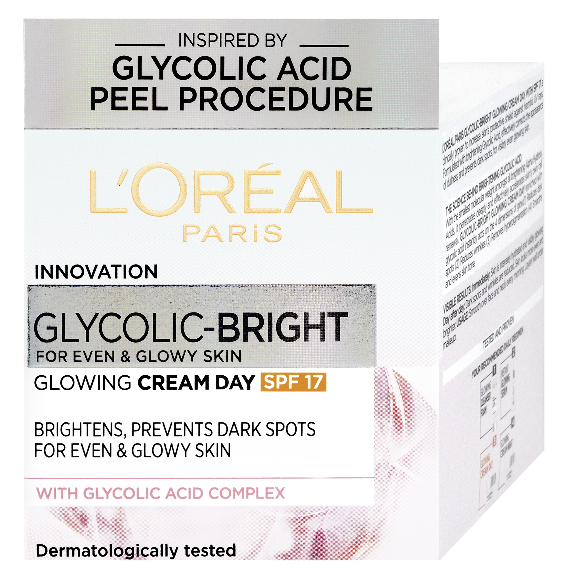 Rozjasňující denní krém s ochranným faktorem prokazatelně zvyšuje účinnost přirozené bariéry pleti před škodlivým UV zářením. Složení s rozjasňující kyselinou glykolovou účinně zlepšuje vzhled pleti a předchází vzniku pigmentových skvrn, a zanechává tak pleť viditelně zářivější. Kyselina glykolová proniká hluboko do pokožky a účinně urychluje obnovu vlastních buněk pleti.
