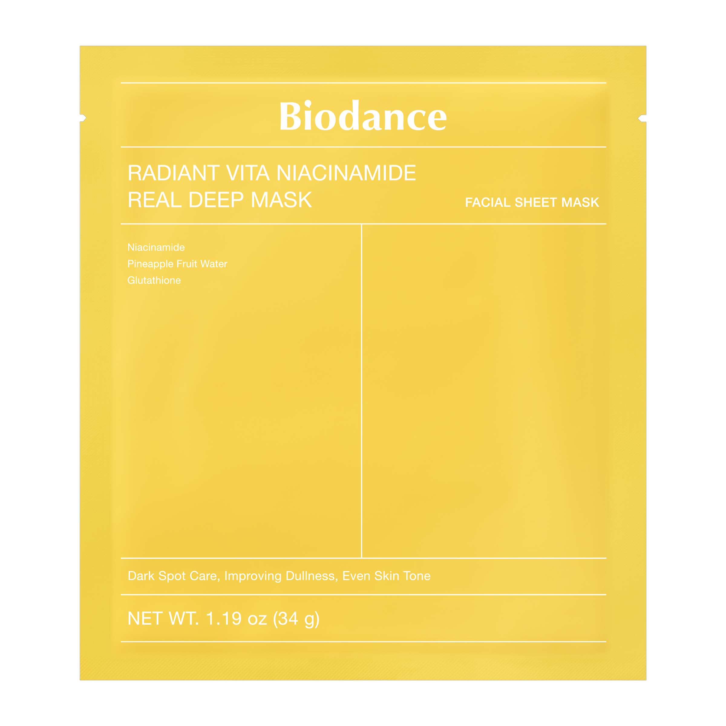 Vlastnosti pleťové masky pro rozjasnění pleti a proti tmavým skvrnám Biodance Radiant Vita Niacinamide: