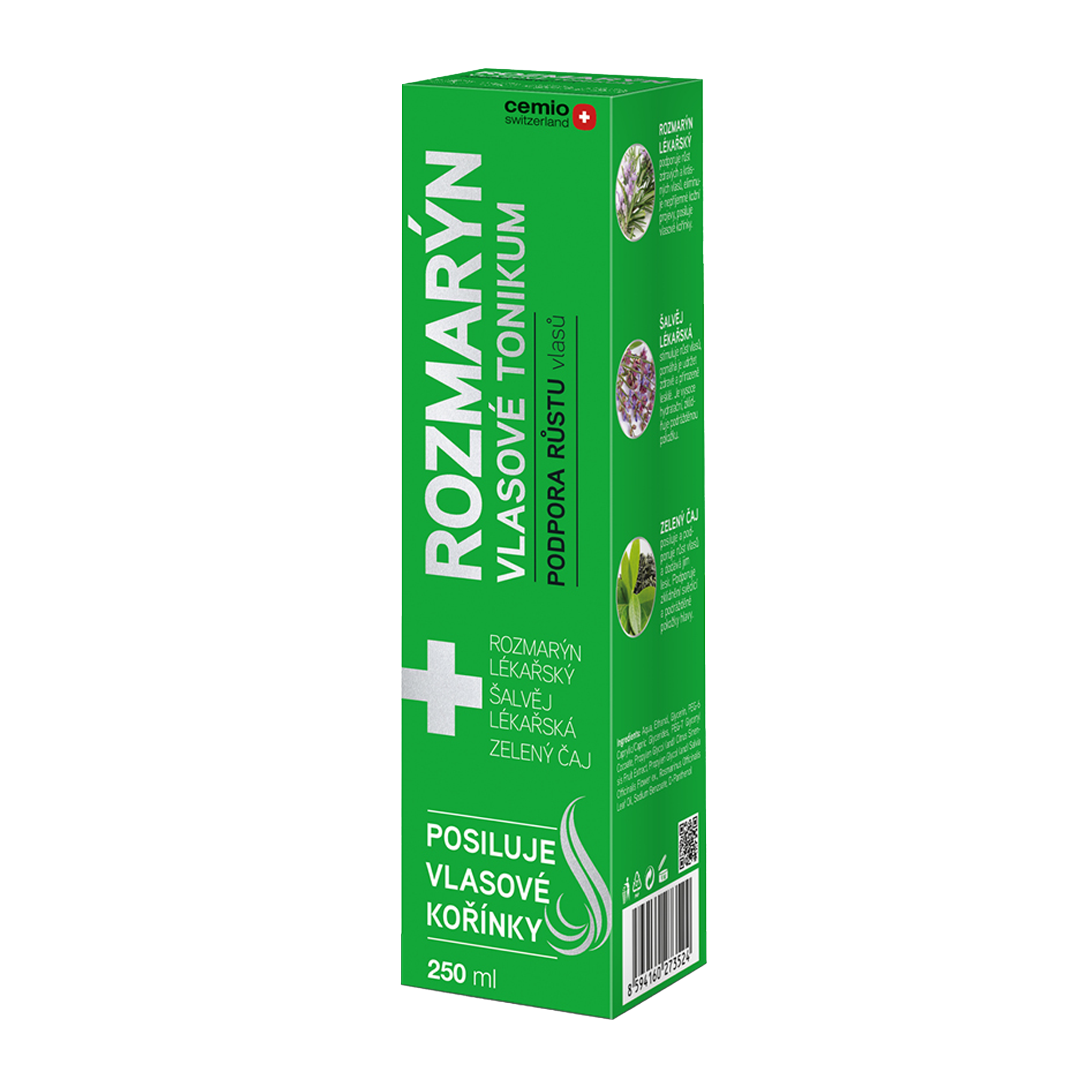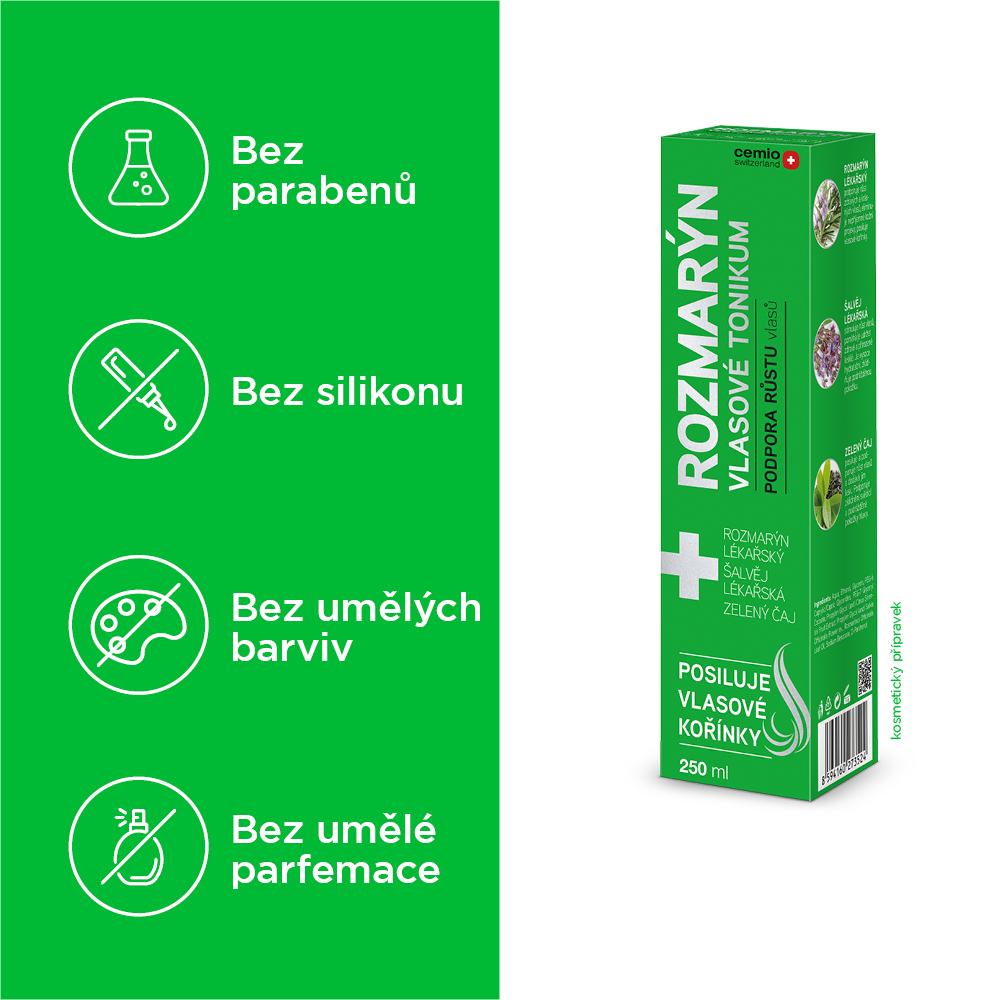 Cemio Rozmarýn tonikum je lehká bezoplachová péče, která podporuje růst nových, silných vlasů a zároveň posiluje kořínky. Díky kombinaci rozmarýnu, šalvěje a zeleného čaje působí přímo na pokožku hlavy, zklidňuje ji a pomáhá růstu nových a silnějších vlasů. Neobsahuje silikony, parabeny ani umělou parfemaci, takže je šetrné i pro citlivou pokožku.