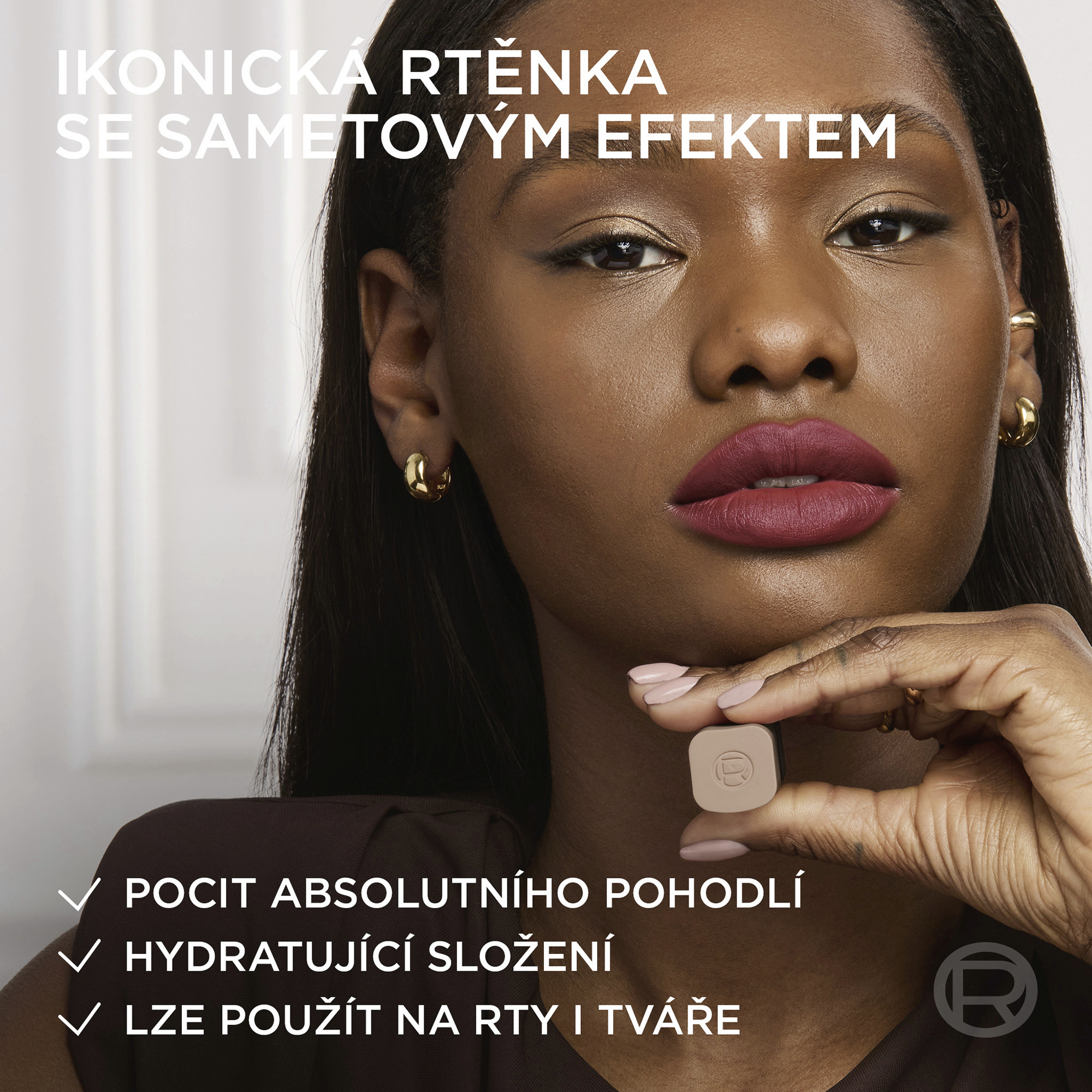 Sametově matné rty s jemně rozostřeným efektem a pocitem lehkosti. Krytí, které si určíte sama.