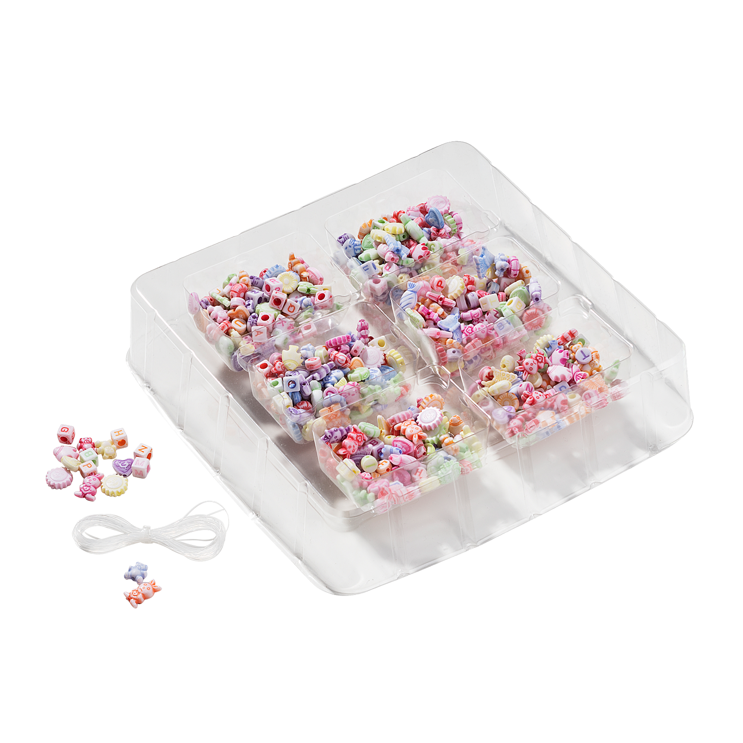 - Přibližně 150 korálků s písmeny v 7 barvách pro tvorbu nápisů a jmen