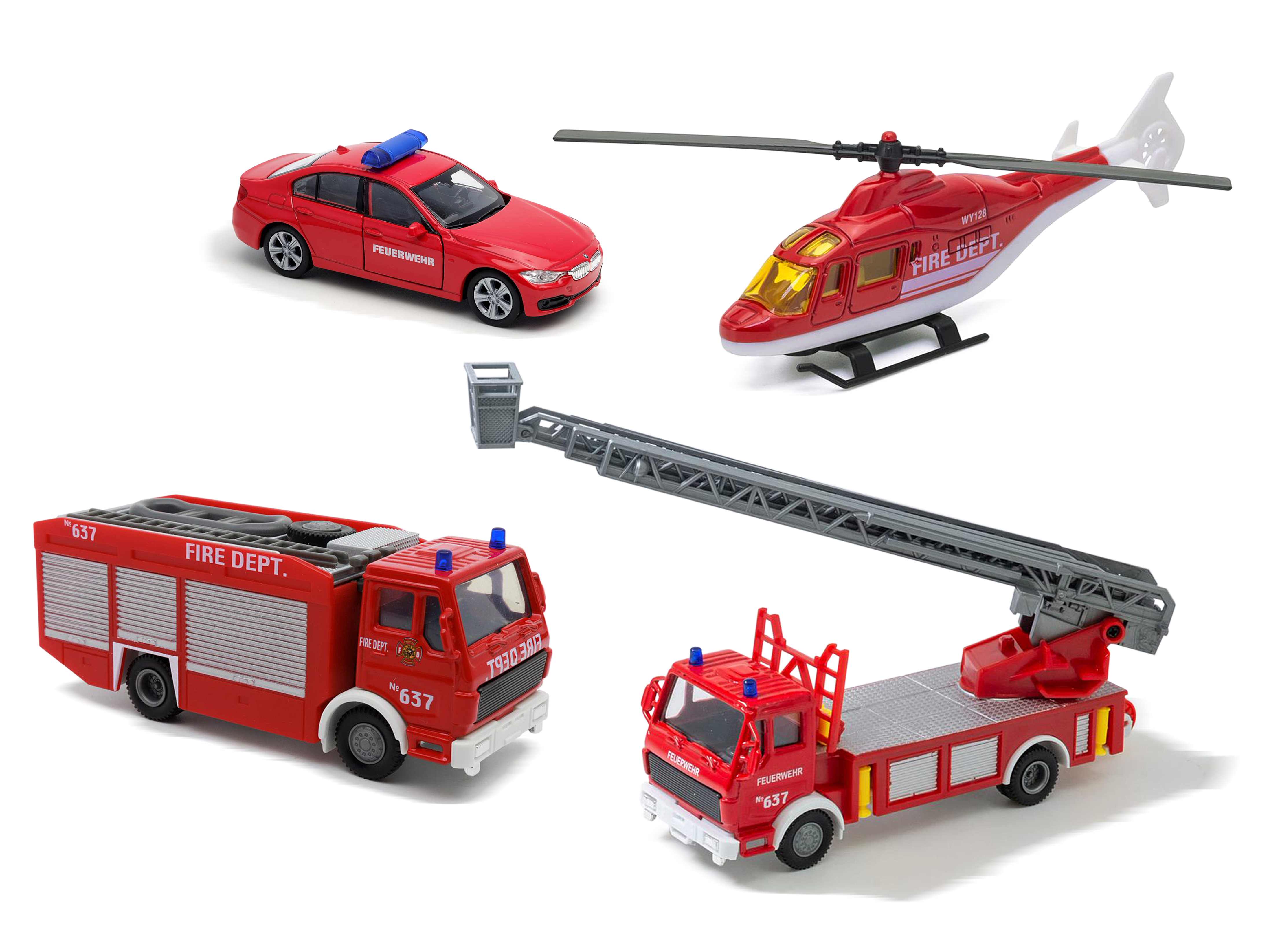 - set obsahuje 4 kusy: dvě hasičská auta, auto velitele zásahu a vrtulník