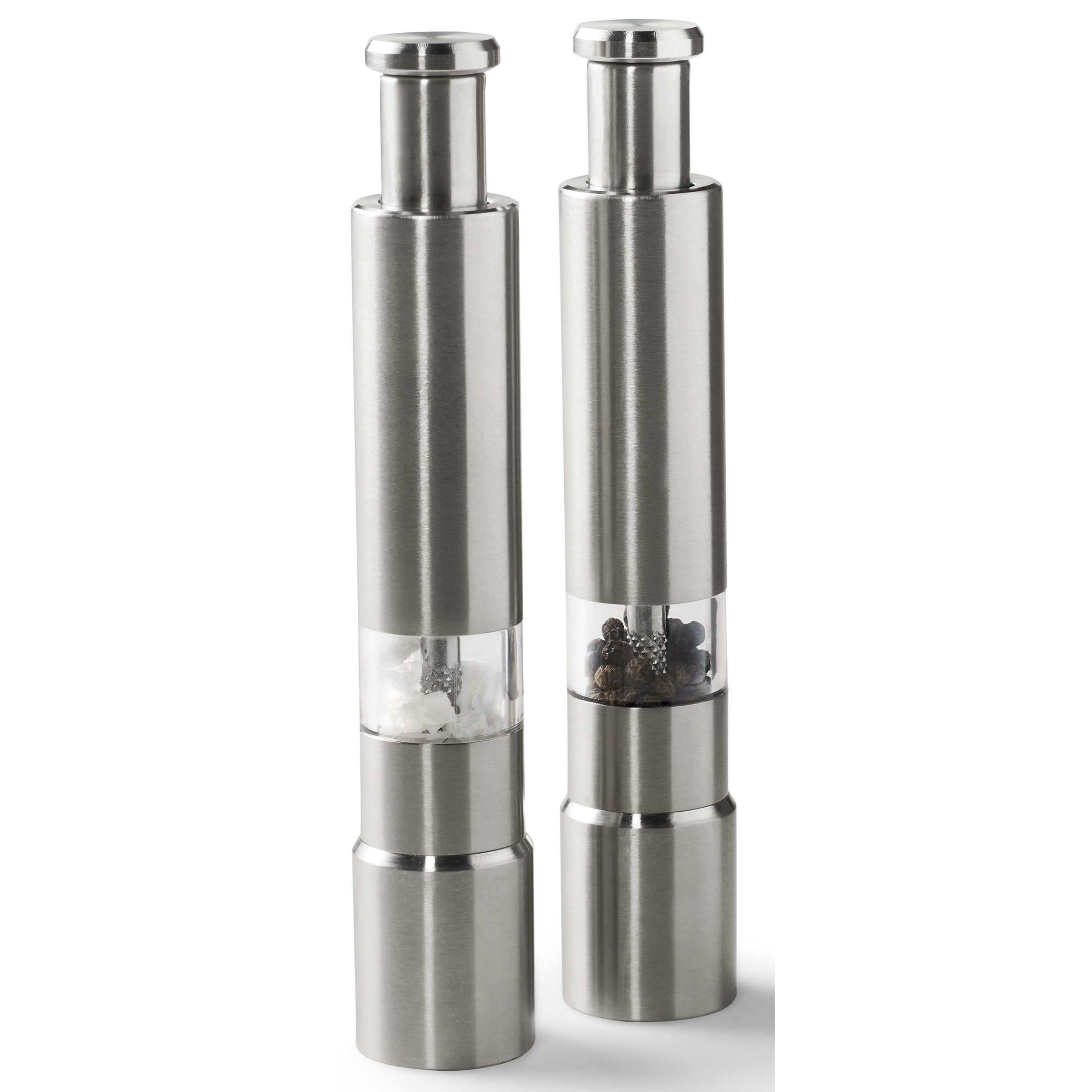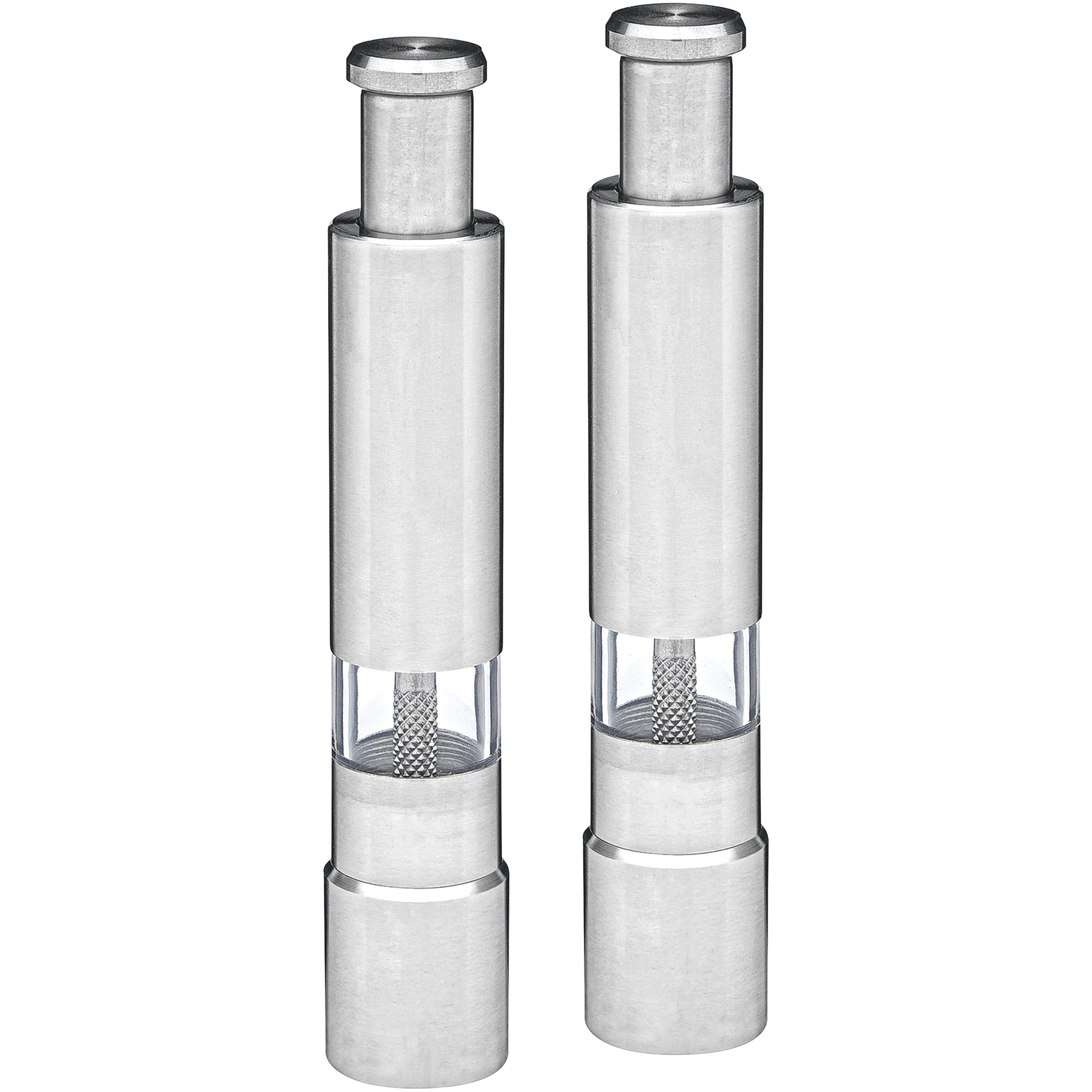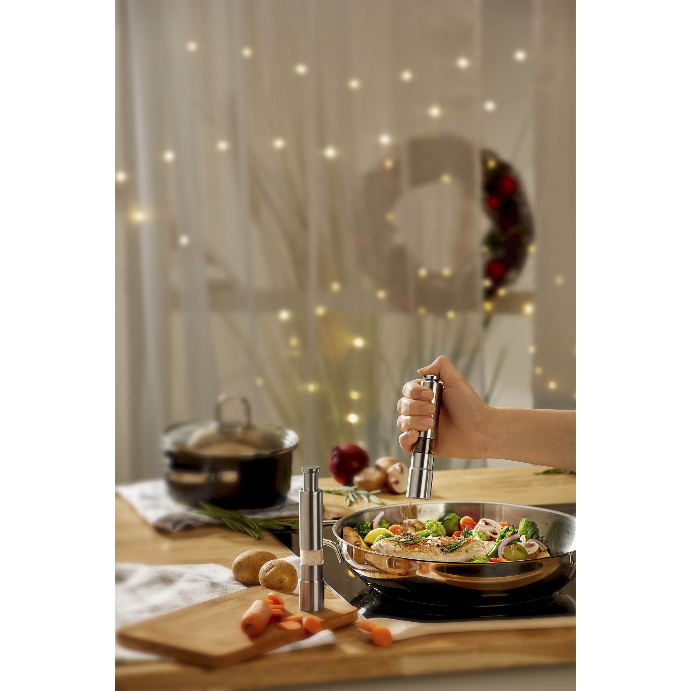 Dopřejte si pohodlí a styl při dochucování pokrmů s touto sada mlýnků na sůl a pepř. Vyrobeny z kvalitní nerezové oceli 18/8, mlýnky kombinují odolnost, eleganci a praktické ovládání jednou rukou. Ideální pro každodenní používání v kuchyni i při stolování.