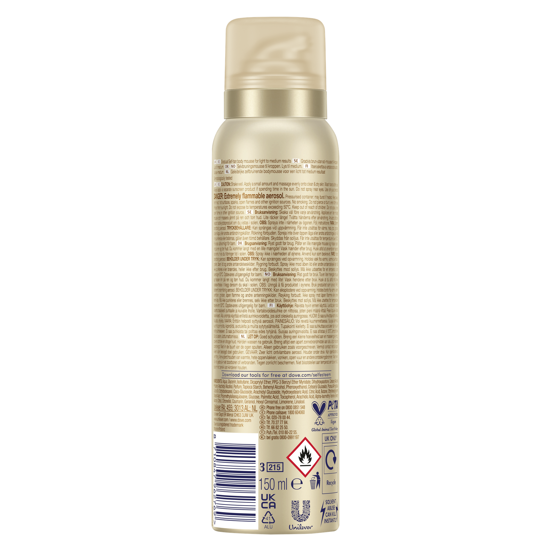 Aqua, Glycerin, Isobutane, Dicaprylyl Ether, PPG-3 Benzyl Ether Myristate, Dihydroxyacetone, Cetearyl Alcohol, Propane, Arachidyl Alcohol, Parfum, Tapioca Starch, Behenyl Alcohol, Phenoxyethanol, Cetearyl Glucoside, Prunus Amygdalus Dulcis Oil, Octyldodecanol, CocoGlucoside, Arachidyl Glucoside, Hydroxystearic Acid, Citric Acid, Butane, Ethylhexylglycerin, Stearic Acid, Polymethylsilsesquioxane, Glucose, Palmitic Acid, Tocopherol, Arachidic Acid, Alpha-Isomethyl Ionone, Benzyl Alcohol, Citral, Citronellol, Coumarin, Geraniol, Hexyl Cinnamal, Limonene, Linalool.