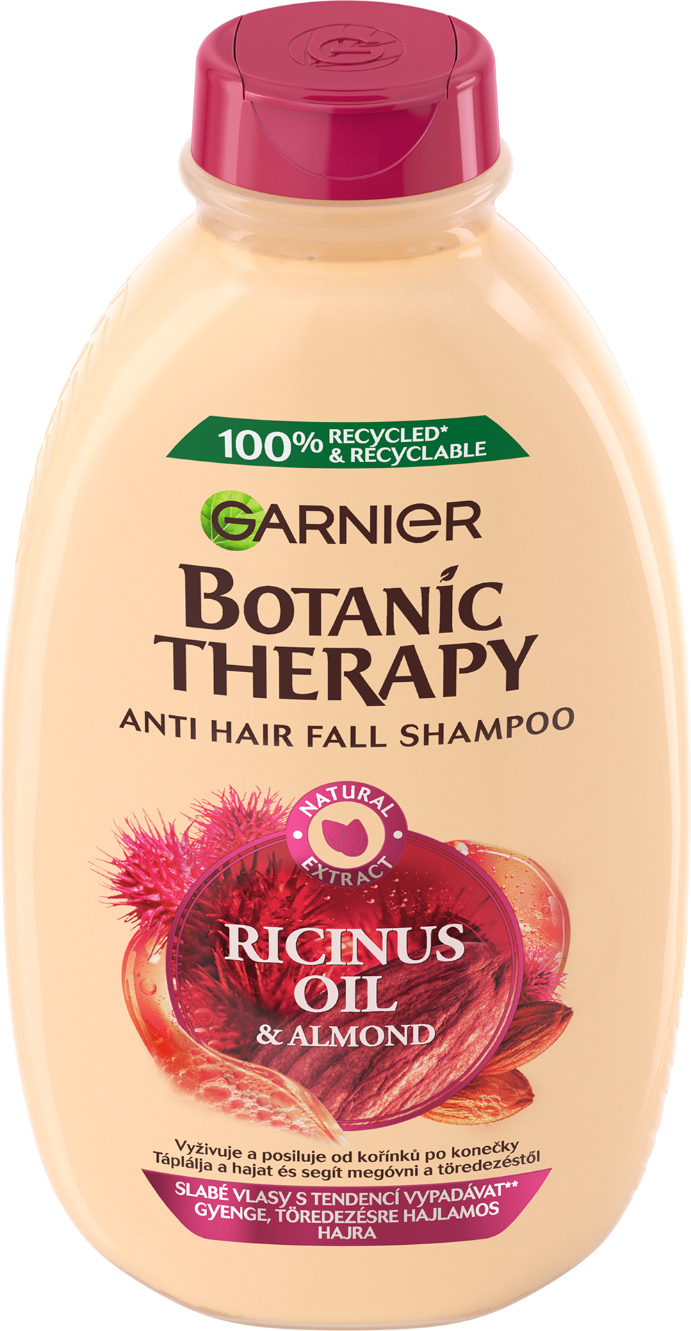 Spojení ricinového a mandlového oleje v revitalizující posilující receptuře pro intenzivní výživu a posílení vlasů od kořínků po konečky.