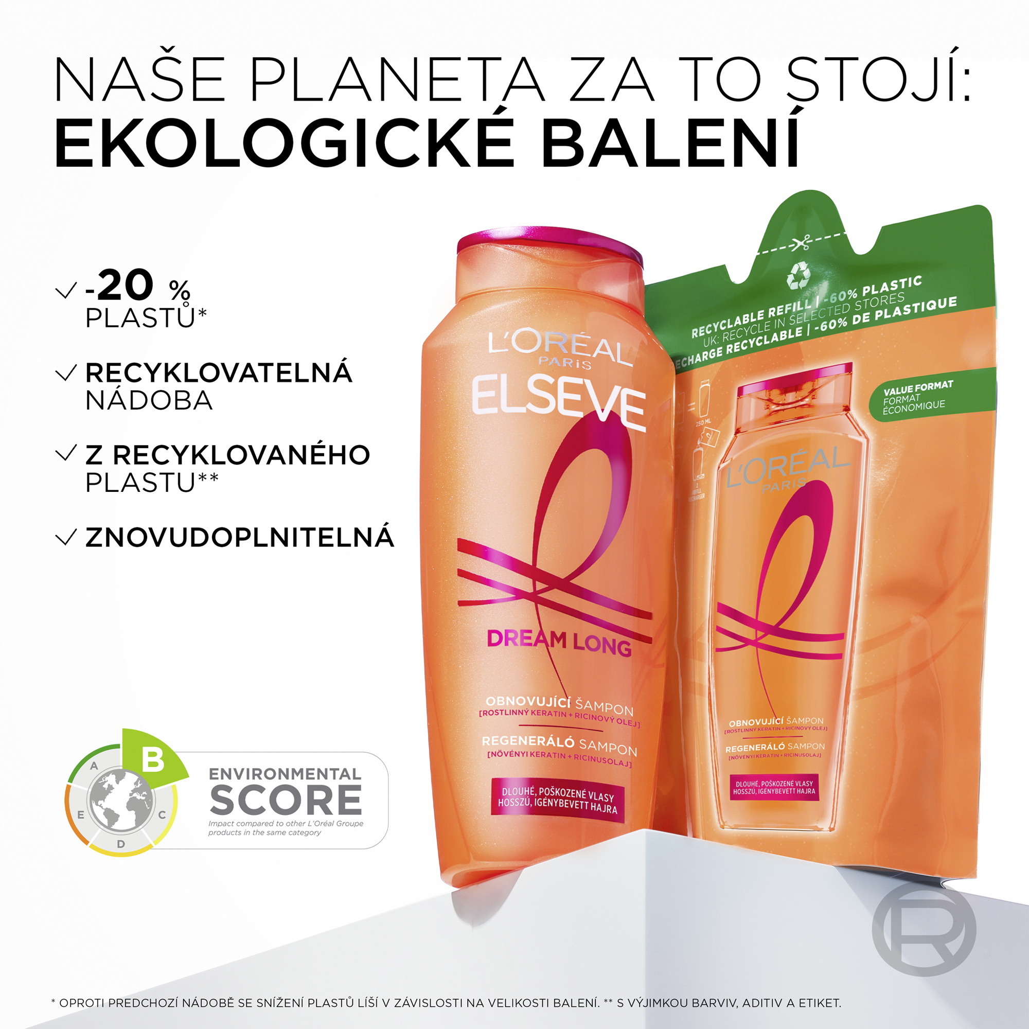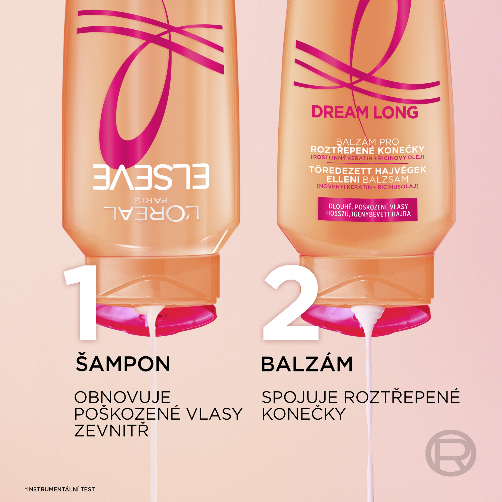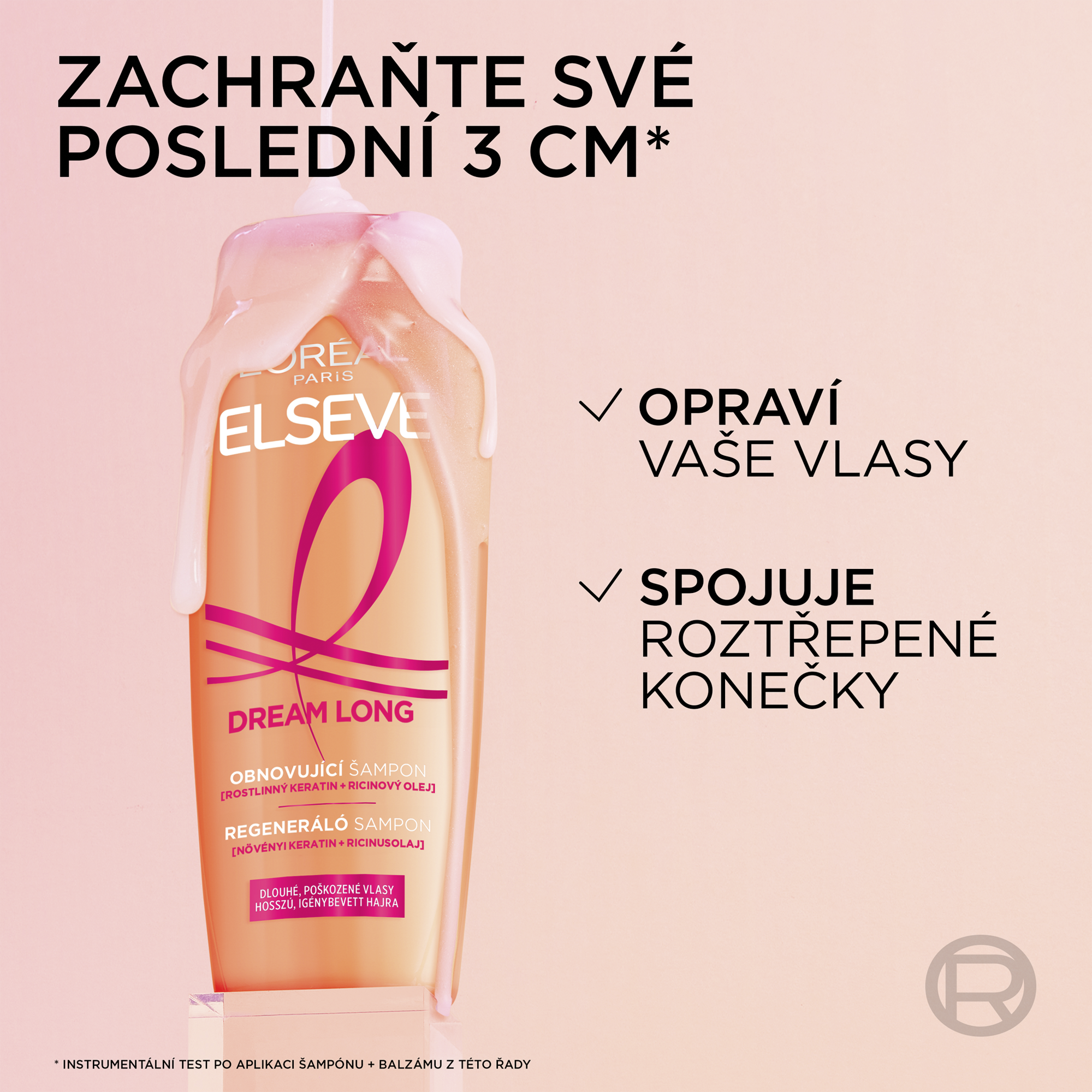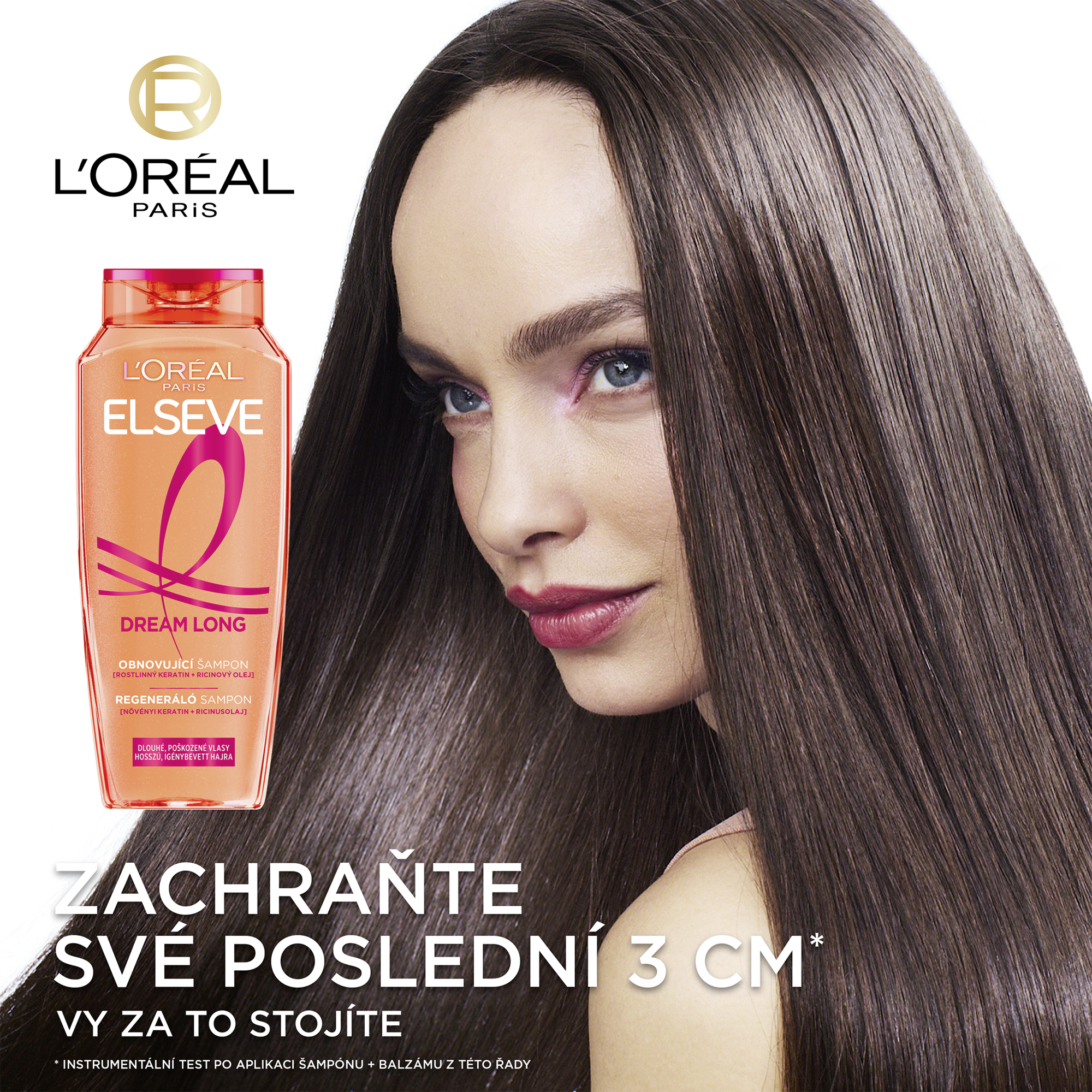 Jak mít dlouhé vlasy? Dream Long je první komplexní řada od Elseve pro dosažení dlouhých vlasů jako z vašich snů. Rozlučte se s poškozenými délkami a roztřepenými konečky díky jedinečnému složení s ricinovým olejem a vitamíny. Řada Dream long regeneruje a vyživuje vlasy, posiluje vlasová vlákna a stimuluje růst vlasů. ZACHRAŇ POSLEDNÍ 3 CM* *Instrumentální test šamponu + balzámu z produktové řady