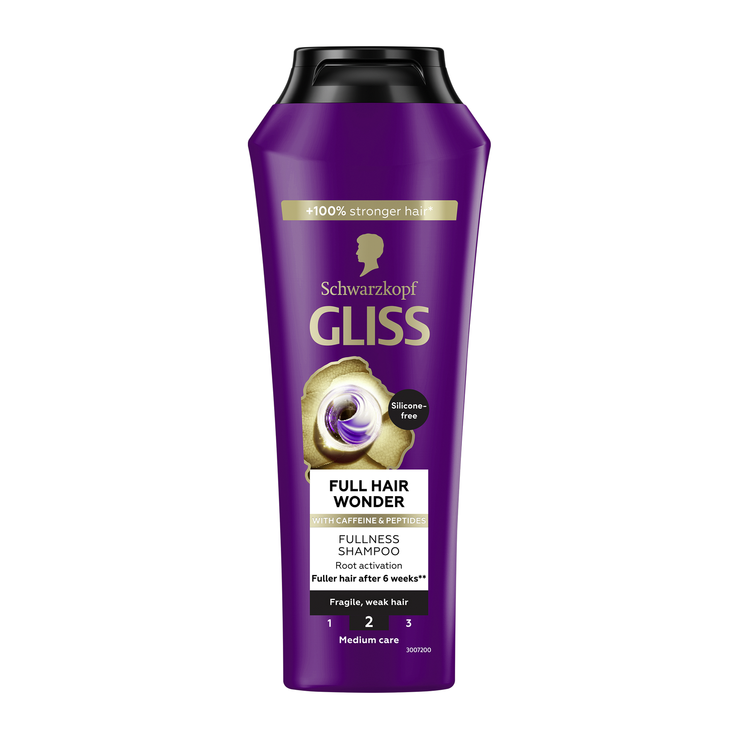 Šampon Gliss Full Hair Wonder s kofeinem + peptidy pro křehké, slabé vlasy. Podpora vlasových růstových faktorů. Objemnější vlasy po 6 týdnech díky menší lámavosti při pravidelném používání.