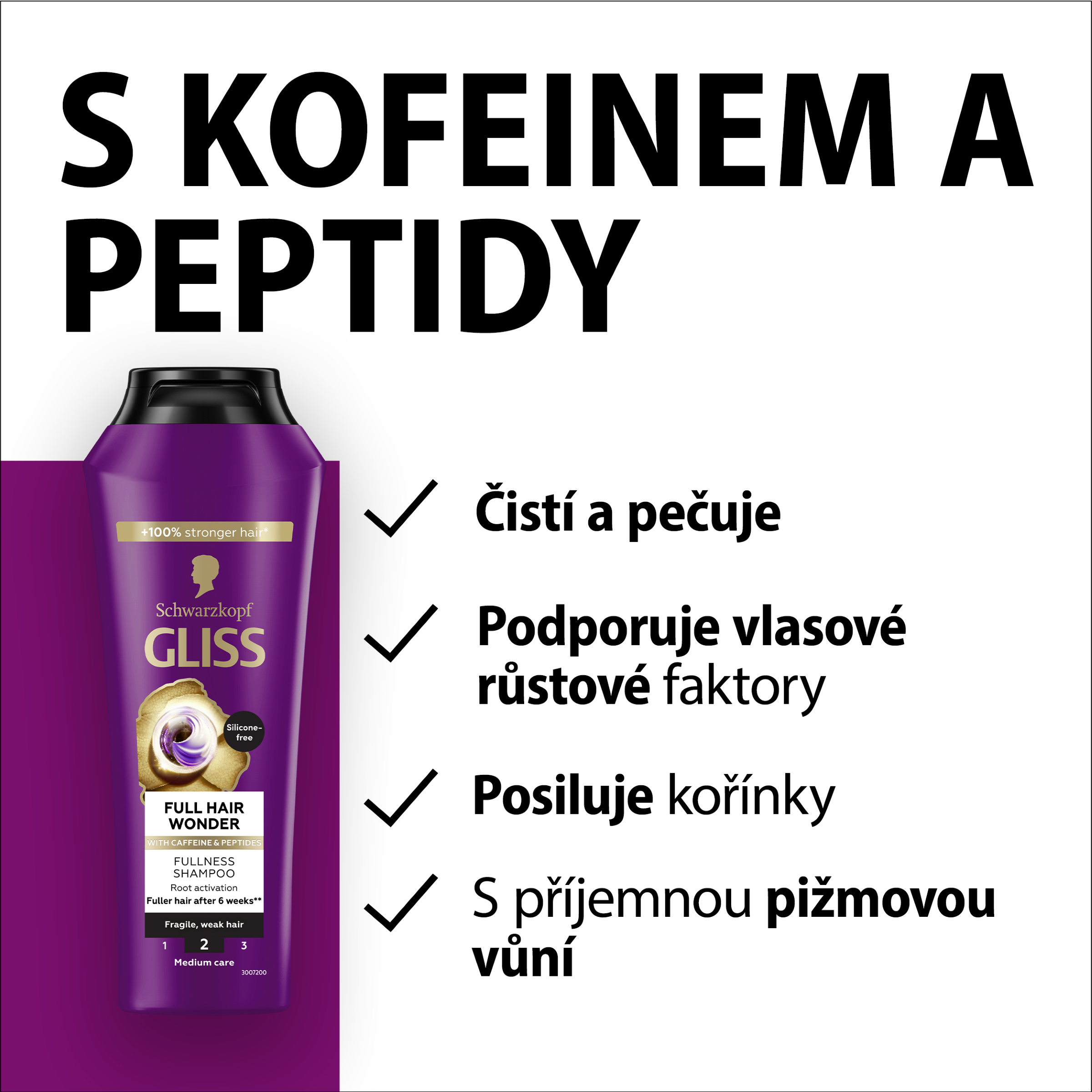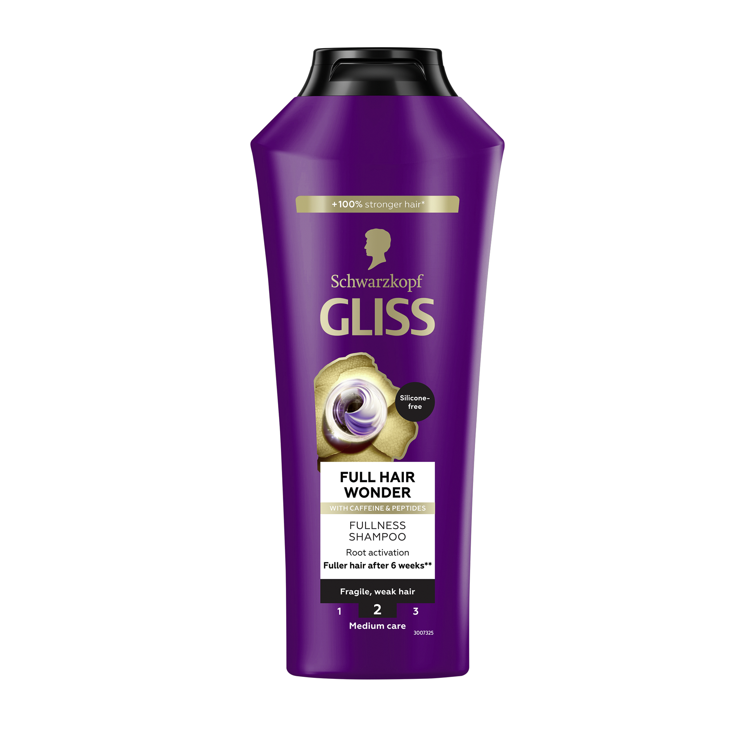 Šampon pro aktivaci kořínků pro křehké a slabé vlasy. Tento šampon Gliss Full Hair Wonder s kofeinem a peptidy podporuje vlasové růstové faktory, což vede k plnějším vlasům již po 6 týdnech*. Úroveň péče Gliss: 2 – Střední péče s vyváženým složením vyživujících složek. Šampon s kofeinem má příjemnou pižmovou vůni a je dermatologicky testován, přičemž 92 % jeho složek je přírodního původu včetně vody. Výrobky na vlasy Gliss jsou schváleny organizací PETA**. Složení neobsahuje silikony a je veganské***, tělo lahve je vyrobeno z 80 % z recyklovaného plastu****.