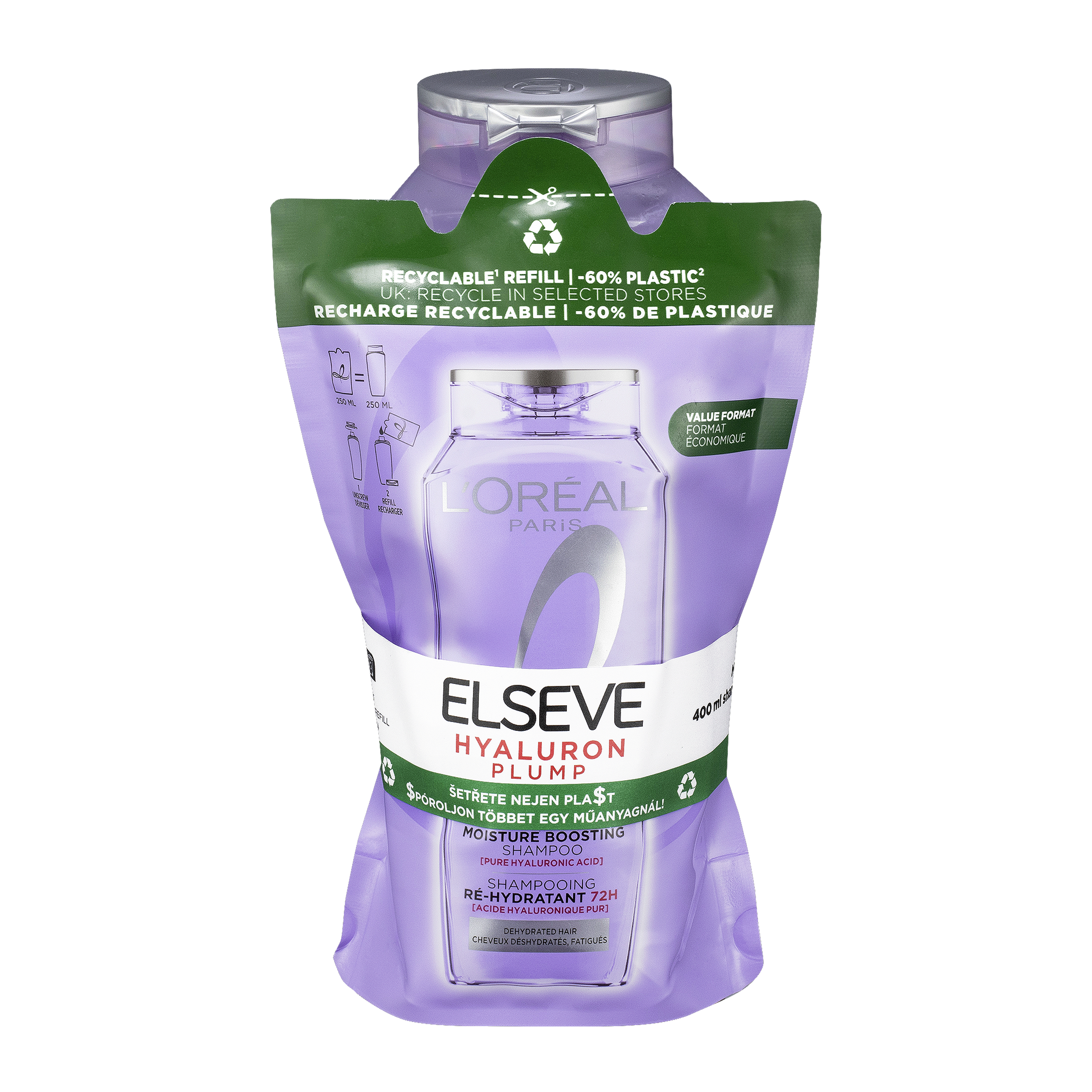 Dopřejte dehydratovaným vlasům intenzivní hydrataci a současně snižte spotřebu plastu díky výhodnému balení 400 ml šamponu a 250 ml náhradní náplně. Hydratační šampon L'Oréal Paris Elseve Hyaluron Plump využívá sílu kyseliny hyaluronové, která účinně uzamyká vlhkost ve vlasových vláknech a vytváří ochranný film na jejich povrchu. Vlasy získávají zářivý lesk, lehkost a viditelně zdravější vzhled. Šampon působí až 72 hodin**, během kterých udržuje vlasy hydratované, hebké a plné vitality.