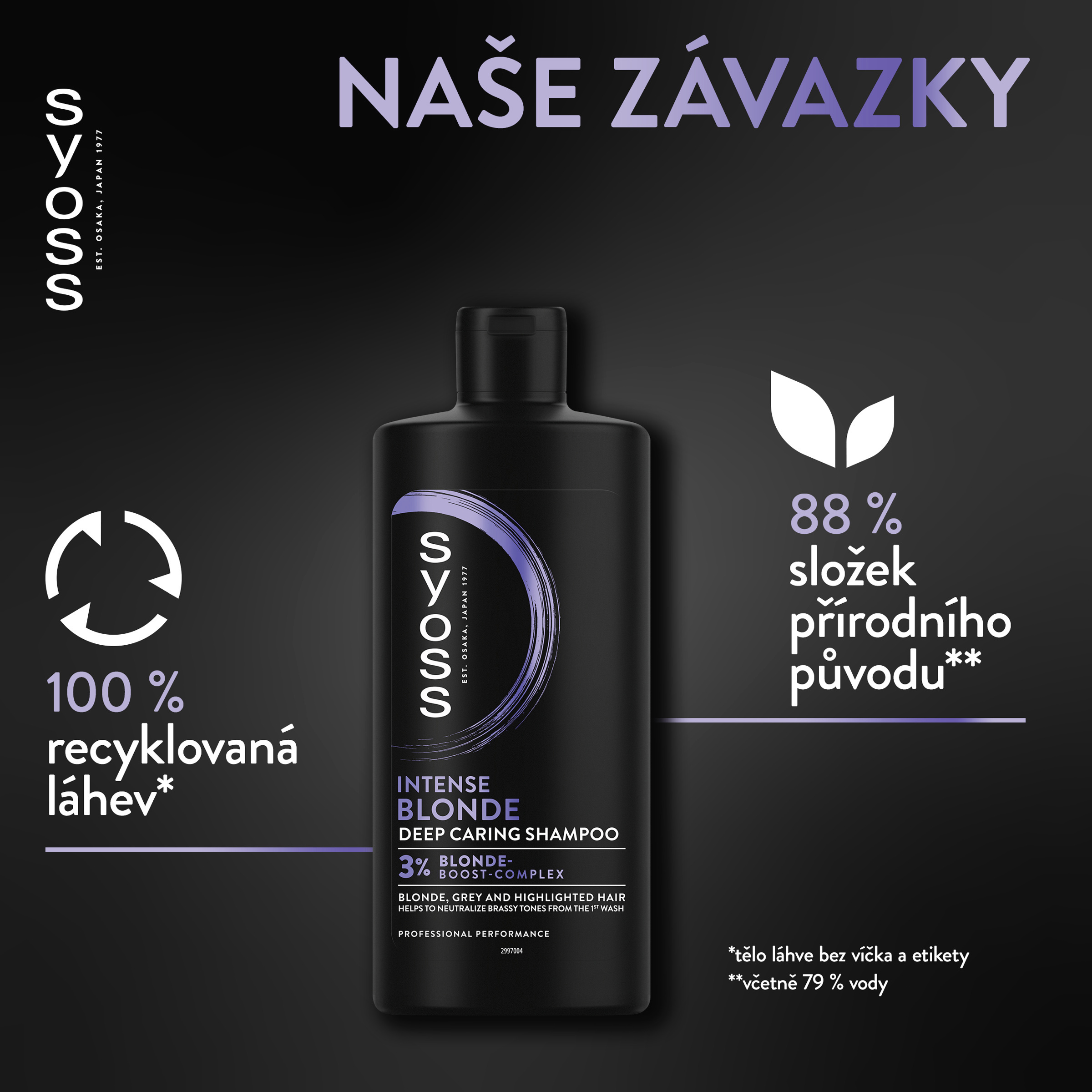 Vlasové produkty Syoss, s více než 45letou kadeřnickou historií, jsou navrženy pro profesionální výkon. Tento šampon Syoss s hloubkově pečujícím složením obsahujícím 3% Blonde boost-komplex posiluje vlasy zevnitř a zanechává je krásné a zdravě vypadající. Tento šampon pro blond vlasy zvyšuje intenzitu blond, šedivých a melírovaných vlasů, chrání je a dodává jim zářivý lesk a zároveň pomáhá neutralizovat žluté tóny již od prvního umytí. Složky tohoto šamponu jsou z 88 % přírodního původu*. Tělo lahve šamponu je vyrobeno ze 100% z recyklovaných materiálů**.