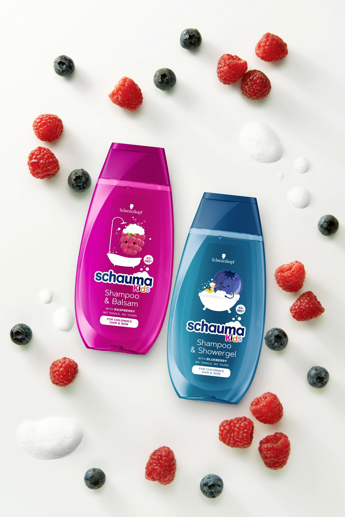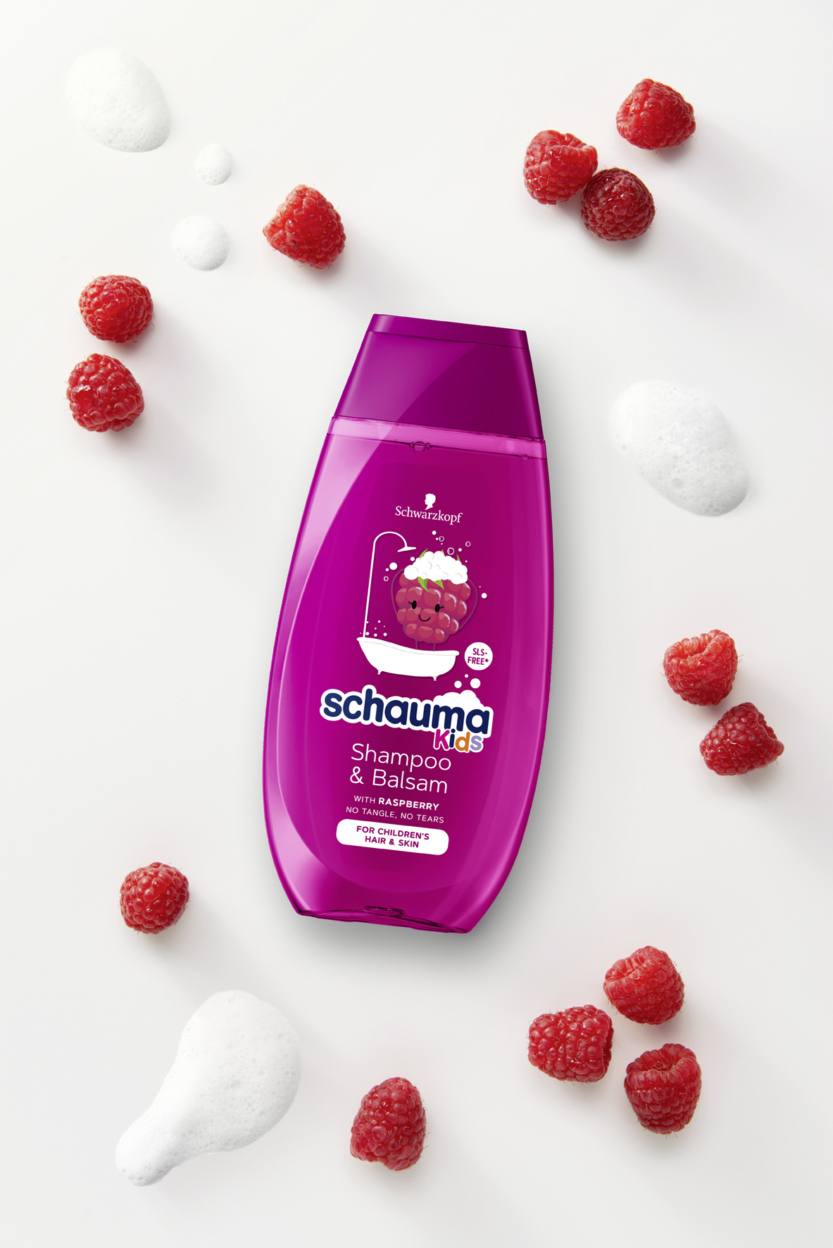 Schauma Kids šampon a balzám s extraktem z maliny. Rozmotává vlásky. Bez silikonů a sulfátových tenzidů.