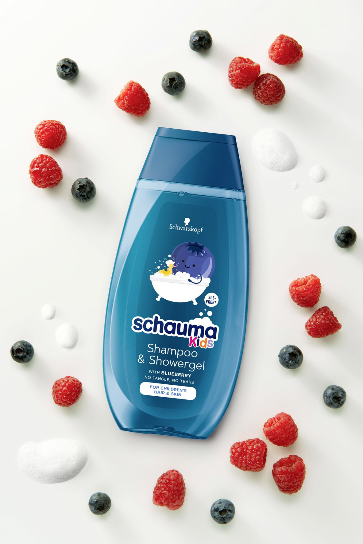 Schauma Kids šampon a sprchový gel s extraktem z borůvky. Rozmotává vlásky. Bez silikonů a sulfátových tenzidů.