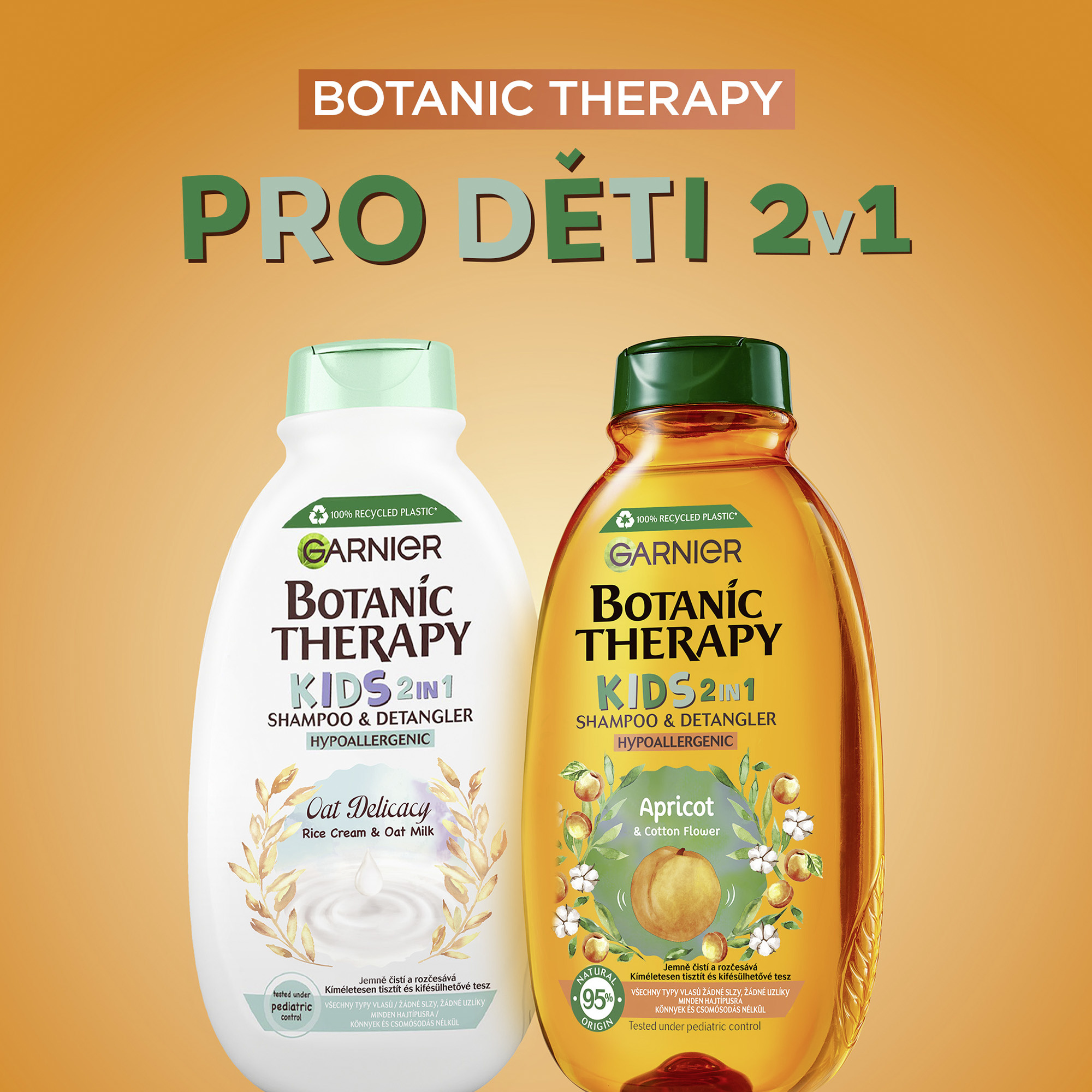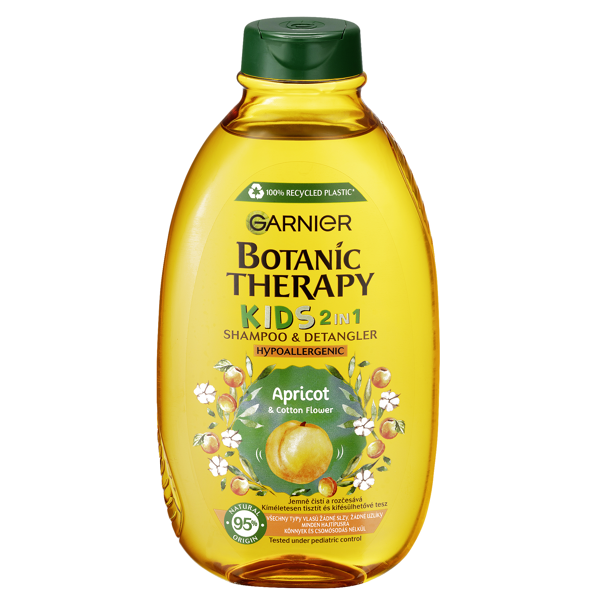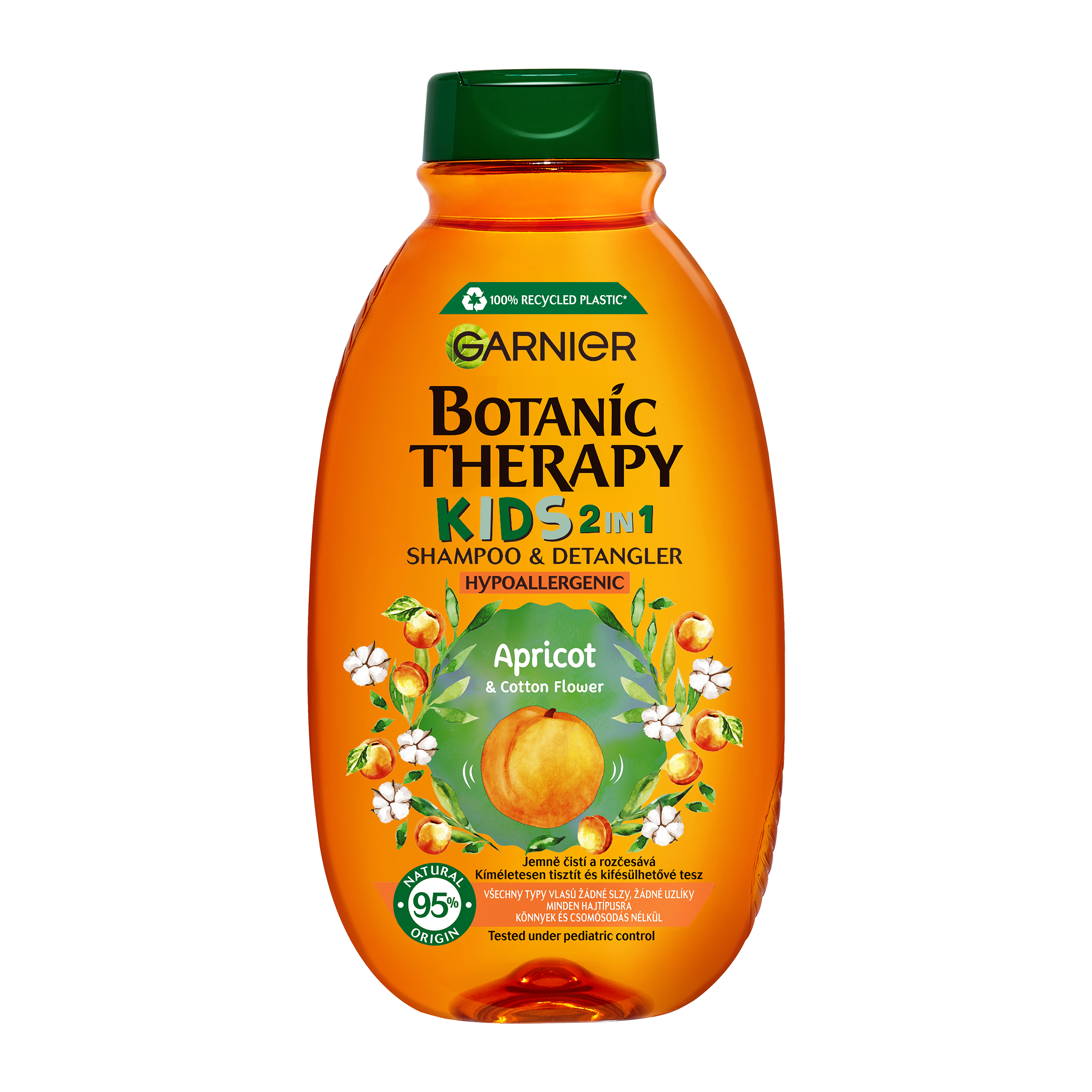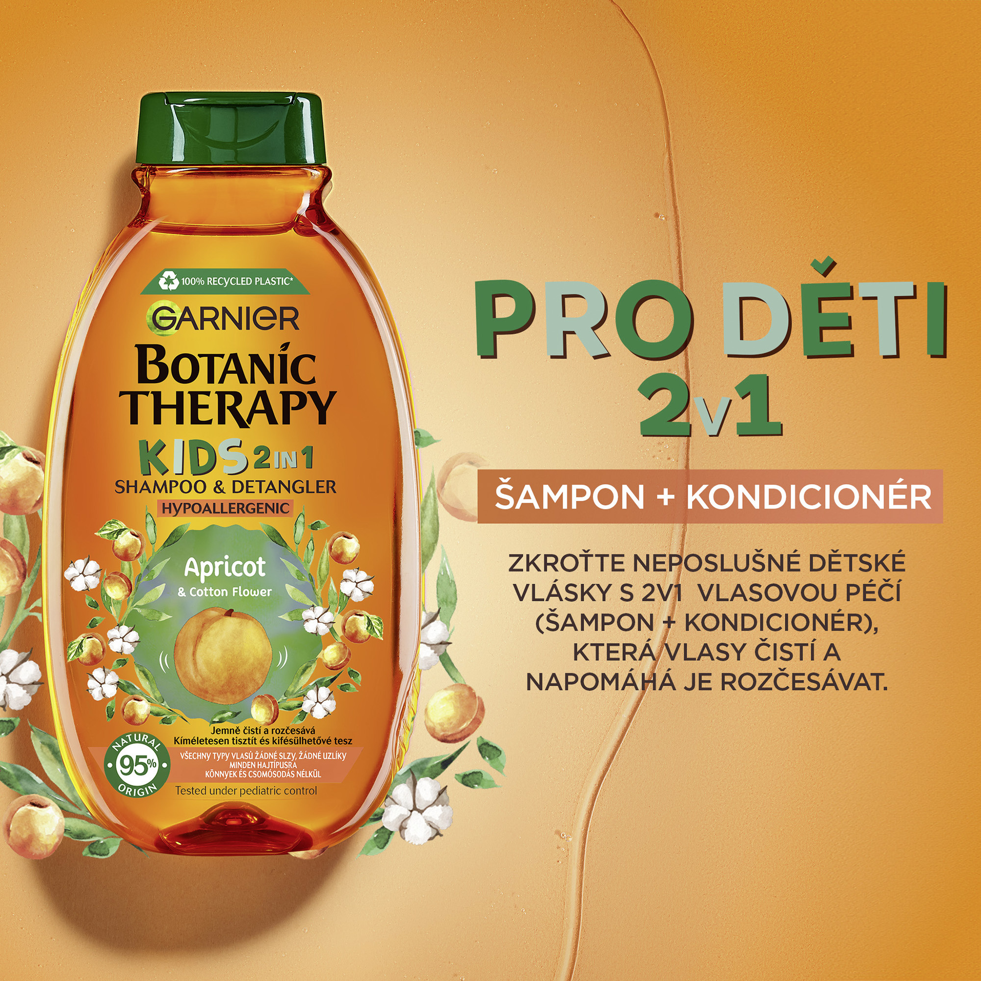 Zkroťte neposlušné dětské vlásky s naší 2v1 vlasovou péčí (šampon + kondicionér), která vlasy čistí a zanechává je snadno rozčesatelné s příjemnou meruňkou vůní.