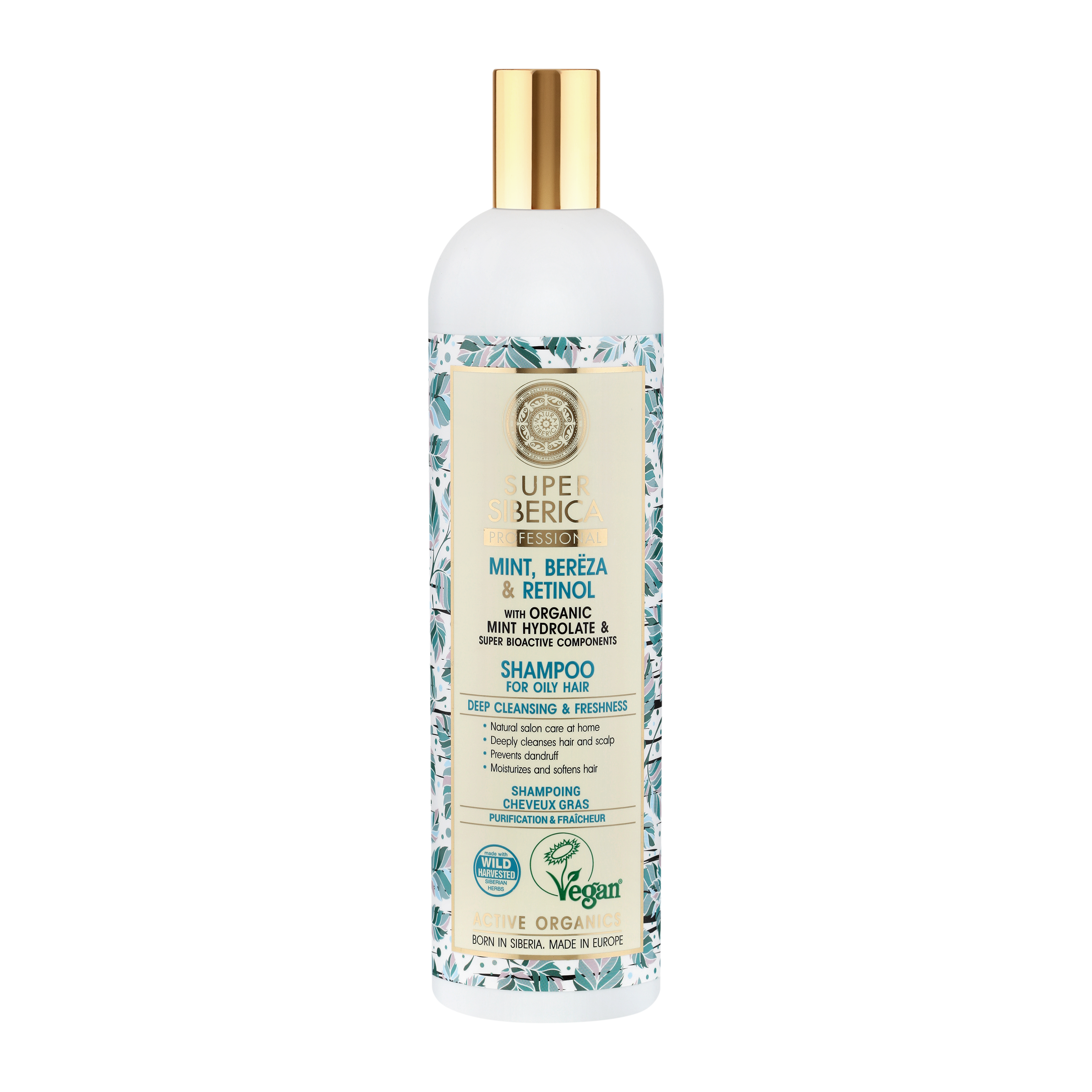 Profesionální šampon na bázi organického hydrolátu sibiřské máty čistí vlasy a pokožku hlavy do hloubky, bojuje proti lupům, dodává vlasům dlouhotrvající pocit svěžesti a hedvábnosti. Sibiřská máta je jedinečný zdroj mentolu a taninů, které jsou nezbytné pro péči o mastné vlasy. Organický hydrolát sibiřské máty normalizuje rovnováhu pokožky hlavy, dodává luxusní objem a dlouhodobý pocit svěžesti. Polární bříza je nejodolnější bříza, která může přežít v drsném podnebí Dálného severu. Má jedinečnou schopnost zadržovat vlhkost a také obsahuje vzácné vitamíny a minerály. Severský modrý mech obsahuje rekordní množství fytoncidů, osvěžuje vlasy a příznivě působí na pokožku hlavy. Retinol je jedním z nejužitečnějších vitamínů pro mastné vlasy, který reguluje rovnováhu pokožky hlavy a pomáhá bojovat proti lupům. Minerální komplex zinek + síra snižuje olejnatost vlasů a zabraňuje opětovnému výskytu lupů.