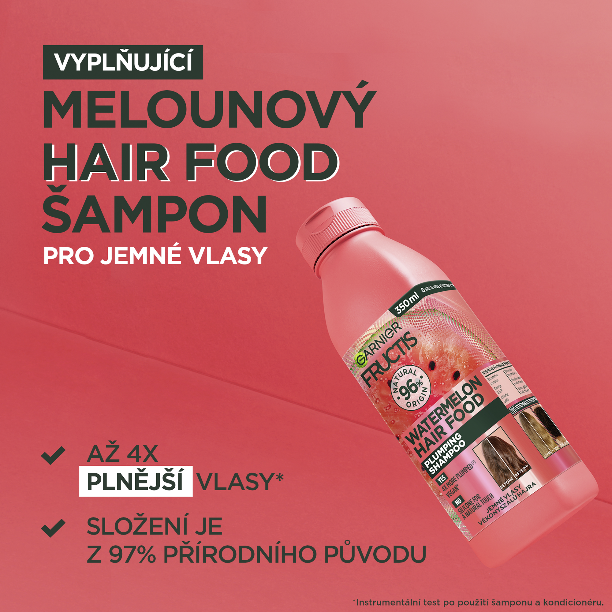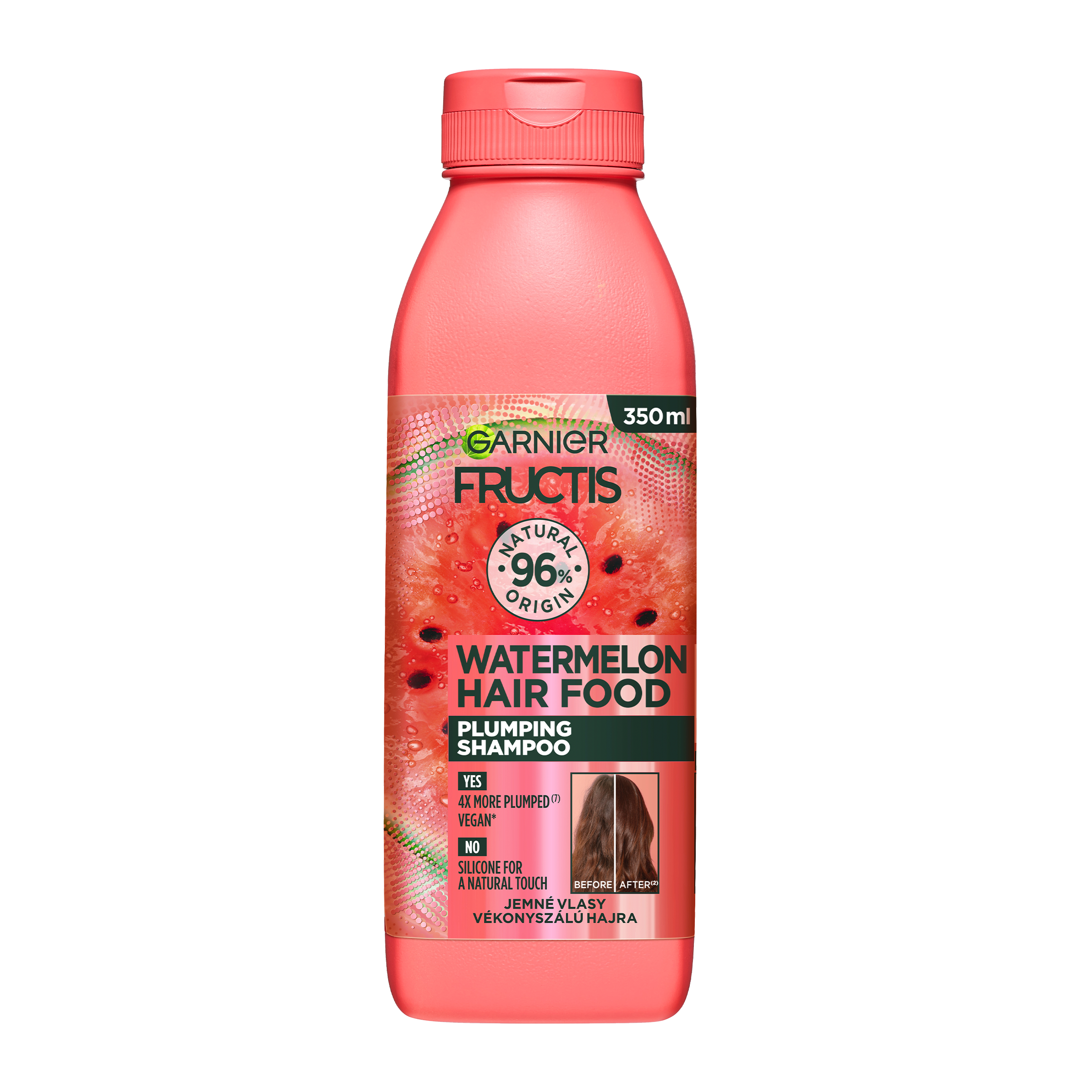 Vyplňující melounový šampon na vlasy pro jemné vlasy, který čistí a intenzivně hydratuje vlasové vlákno. Až 4x plnější vlasy díky hydrataci (1). Složení je z 96 % přírodního původu.