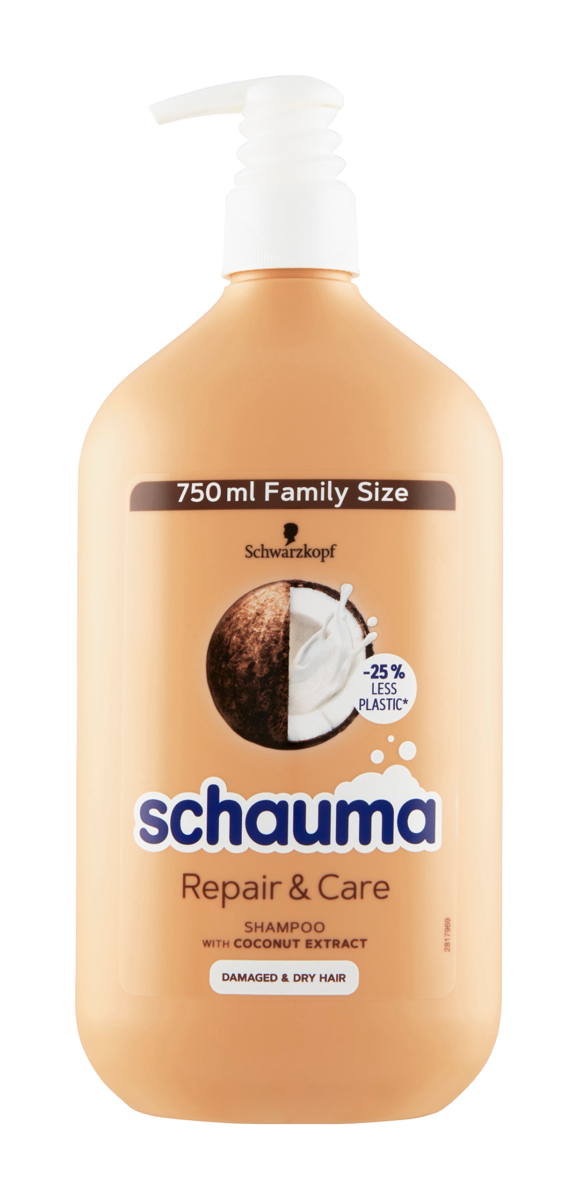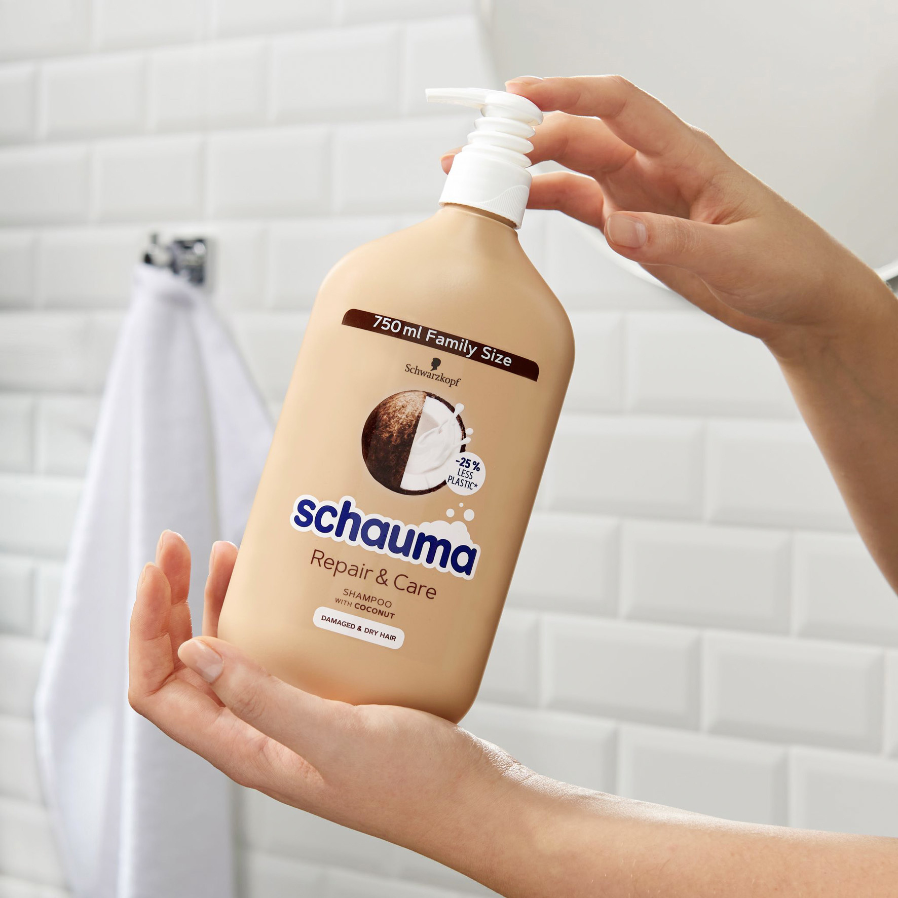 Schauma šampon Repair & Care — S kokosovým extraktem pro suché a poškozené vlasy. Tento Schauma šampon pro poškozené a suché vlasy vyhlazuje a vyživuje strukturu vlasů a zároveň jim poskytuje intenzivní péči od kořínků po konečky pro viditelně zregenerované, pružné, lesklé vlasy. Pravidelné umývání vlasů šamponem Repair & Care zabezpečí zdravě vypadající vlasy. Vychutnejte si veganský šampon* s kokosovým extraktem. Láhev šamponu je vyrobená z 50% recyklovaného plastu. Tělo láhve a pumpička jsou recyklovatelné.** Rodinná velikost s o -25 % méně plasty.*** Buď chytřejší. Recykluj.