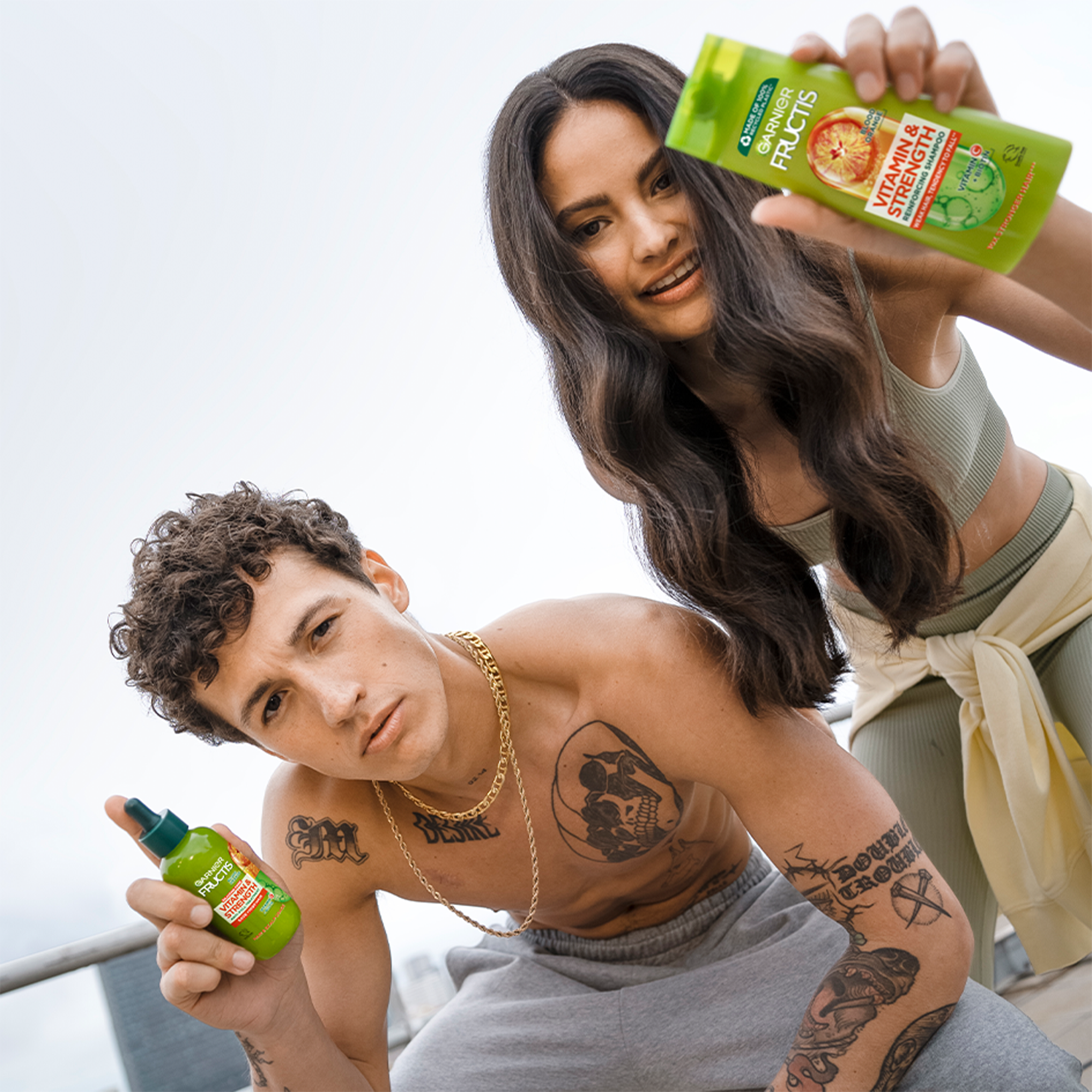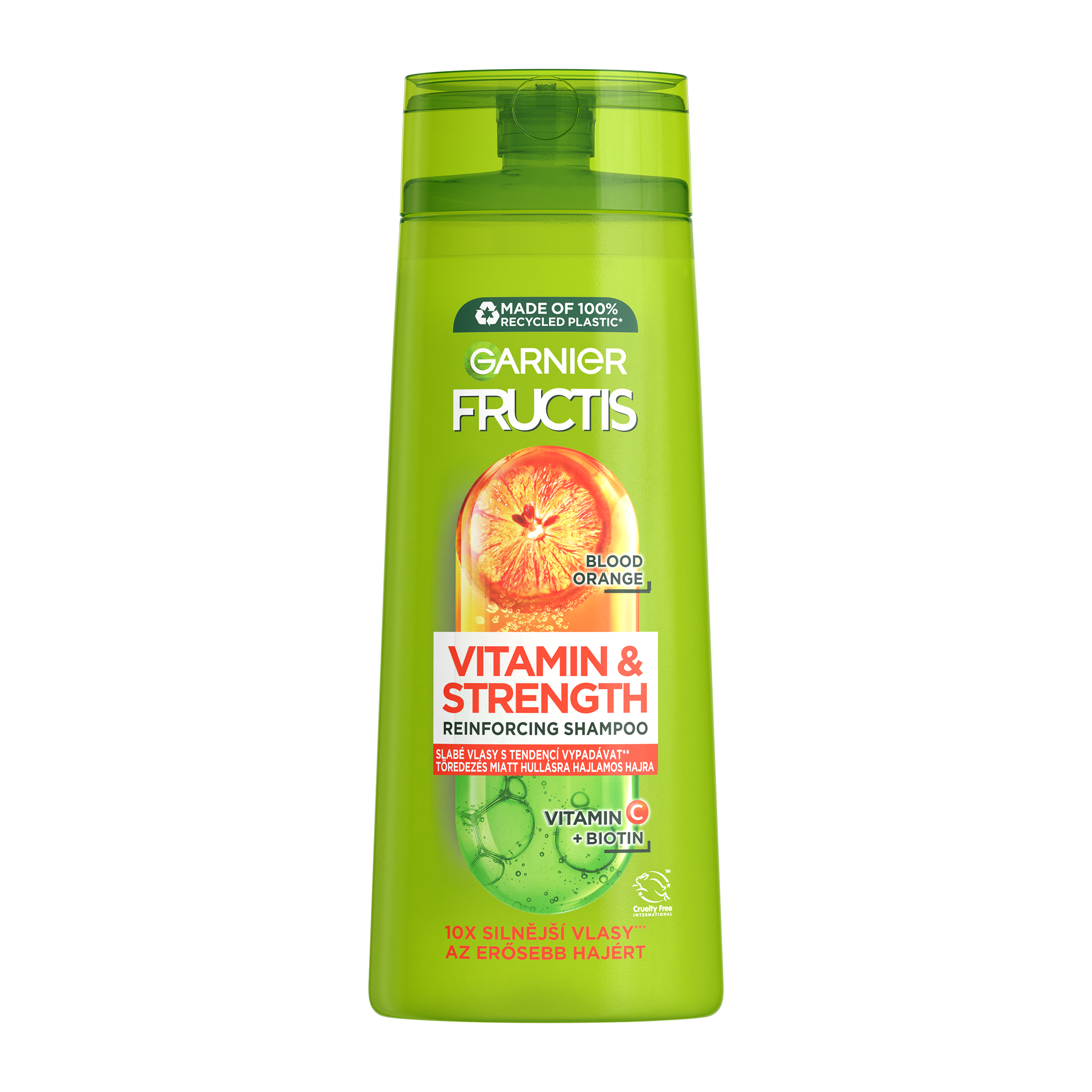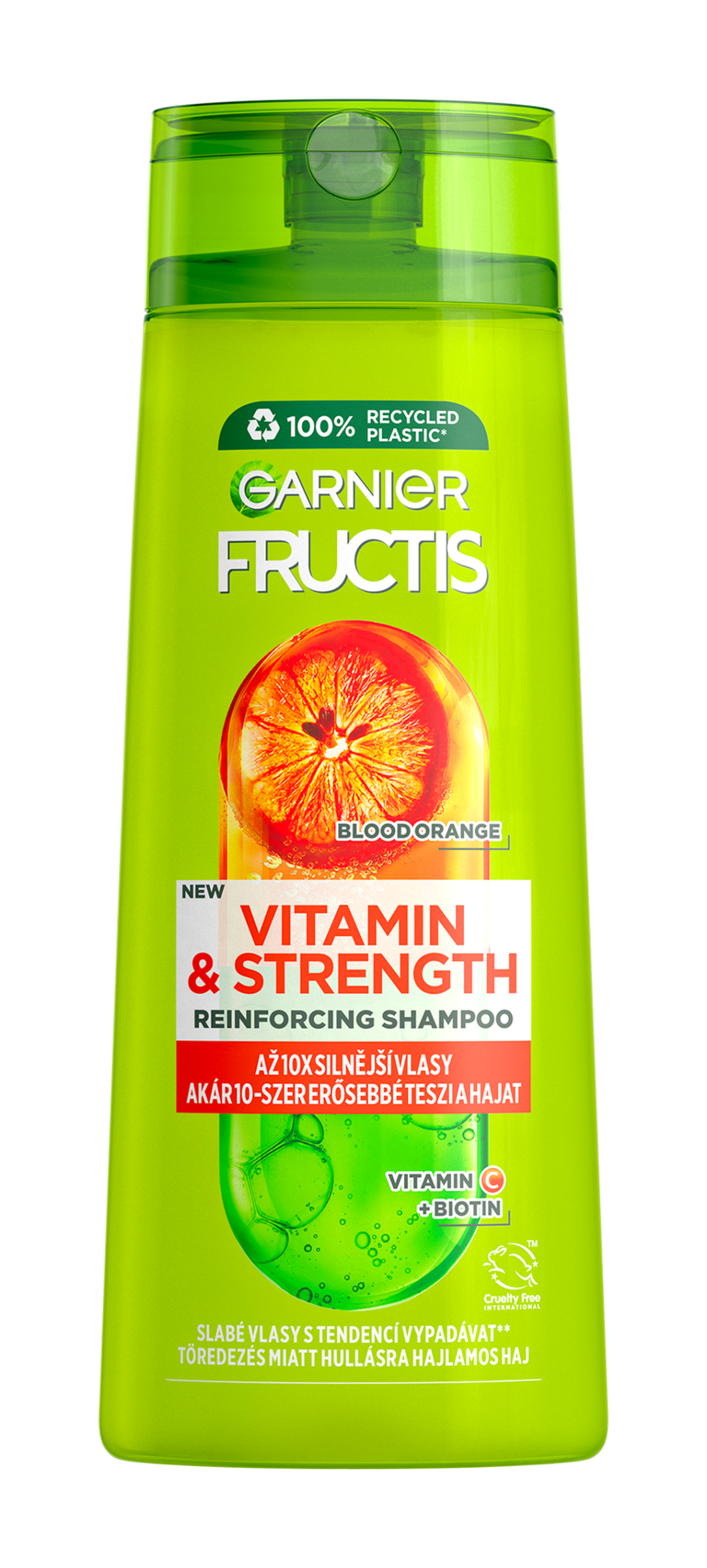 Náš šampon je obohacený o super duo ingredienci, výtažky ze superovoce a účinné aktivní ingredience: Červený pomeranč: ovoce s jednou z nejvyšších koncentrací vitaminů a multivitaminový komplex, derivát Vitaminu C a Biotin, ve složení pro posílení vlasů od kořínků po konečky.