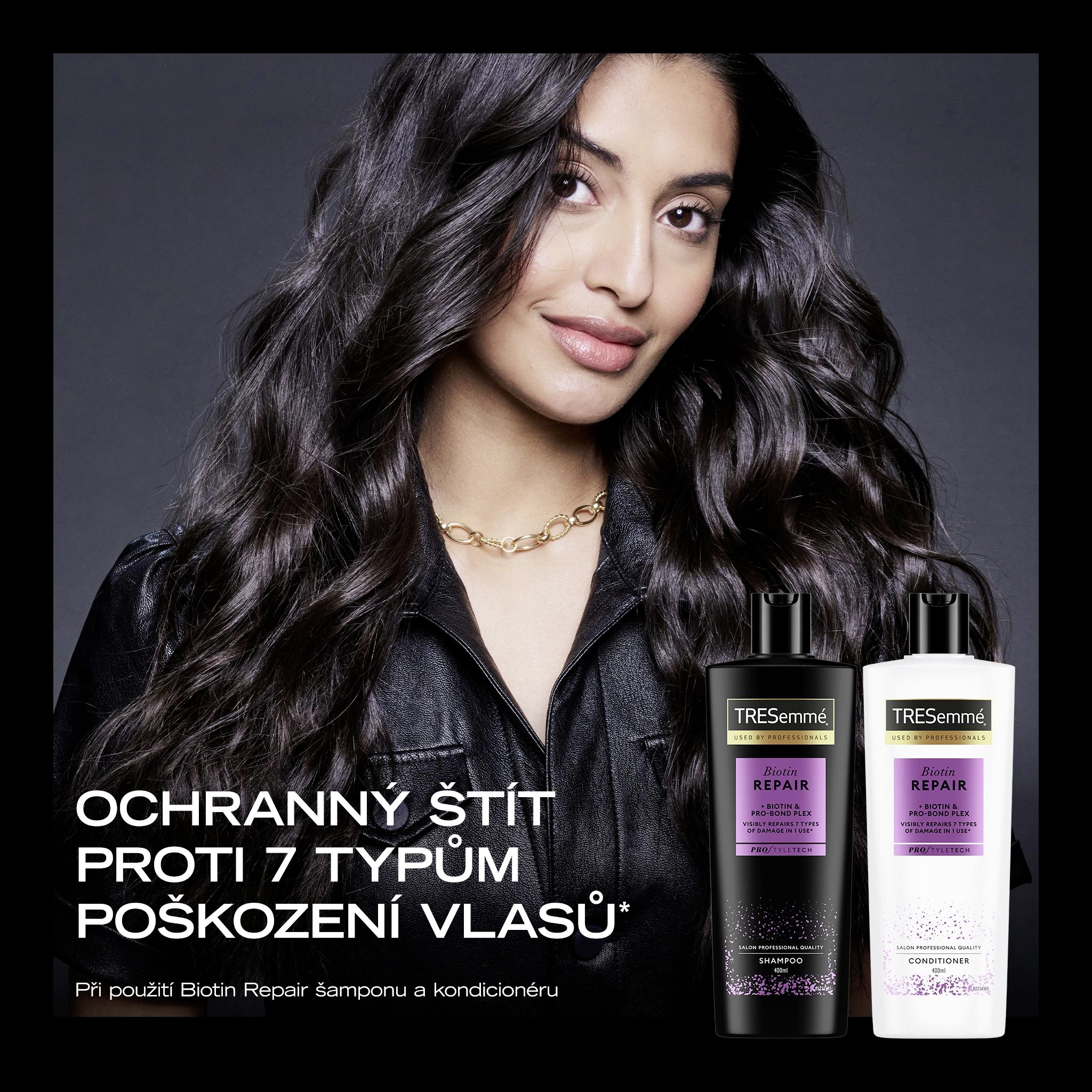 TRESemmé je nositelem PETA certifikace a netestuje na zvířatech. Jak funguje: TRESemmé Biotin Repair šampon a kondicionér tvoří rutinu, která napravuje poškozené vlasy a předchází dalšímu poškozování.