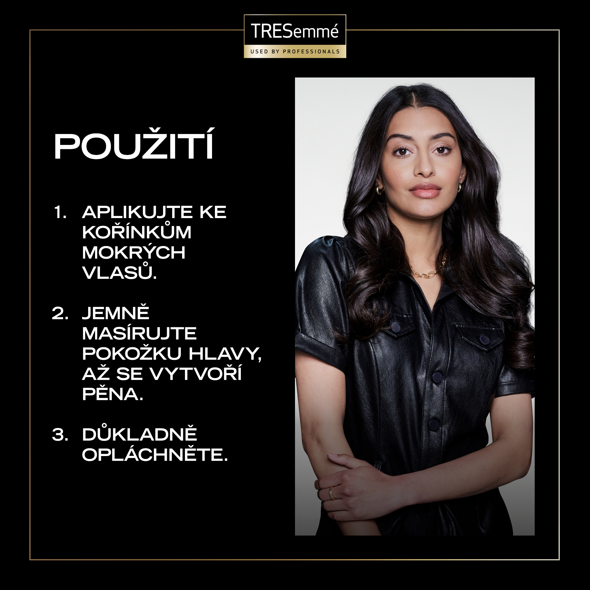 Použijte přiměřené množství šampónu Biotin Repair a naneste ho ke kořínkům vlasů. Jemně masírujte pokožku hlavy, dokud se nevytvoří pěna. Poté důkladně opláchněte. Jako další krok použijte TRESemmé Biotin Repair kondicionér.