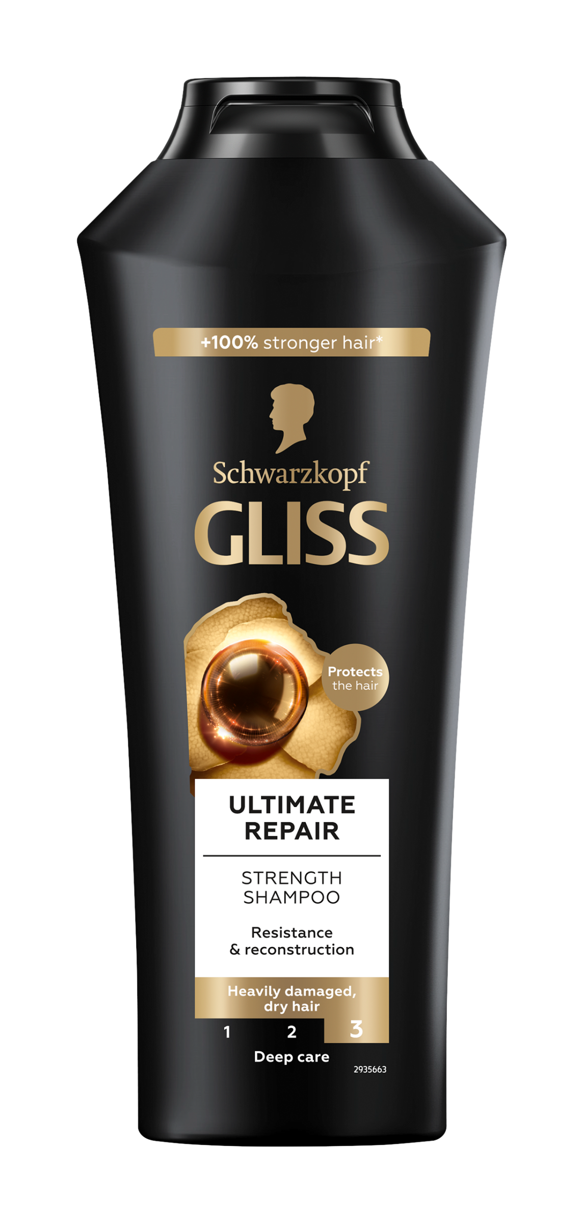 - Obsah balení: Schwarzkopf Gliss posilující šampon Ultimate Repair 400ml s úrovní hloubkové péče pro velmi poškozené, suché vlasy